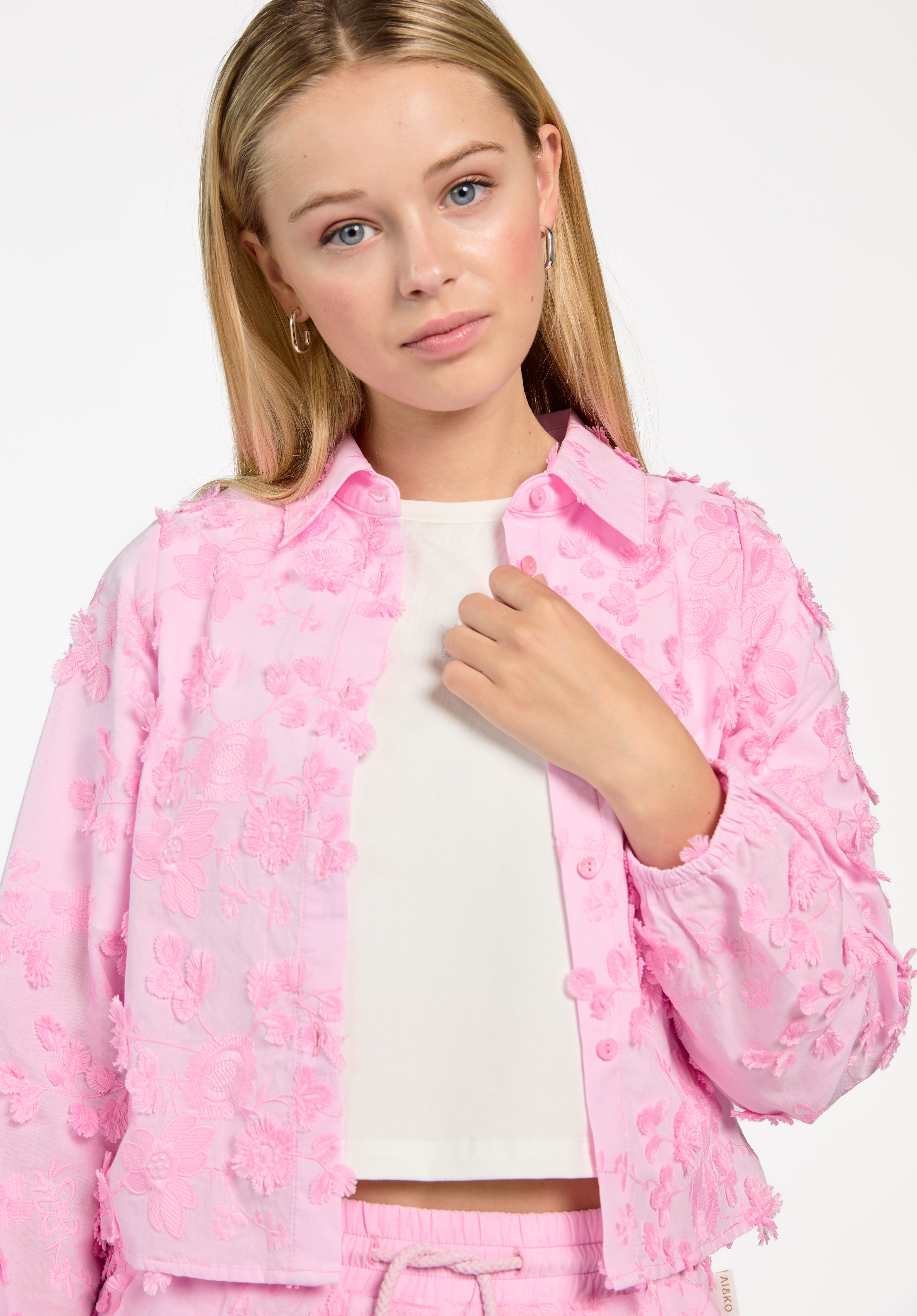 Deze blouse in begonia pink is een echte blikvanger. De subtiele 3D-bloemen geven het ontwerp een speels en verfijnd karakter, terwijl de klassieke kraag en knoopsluiting zorgen voor een mooie balans tussen romantisch en modern.