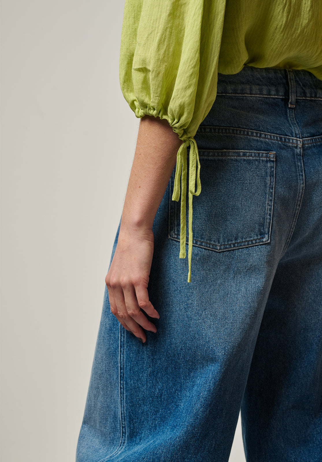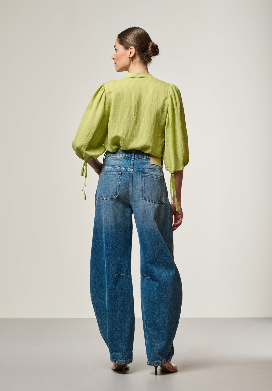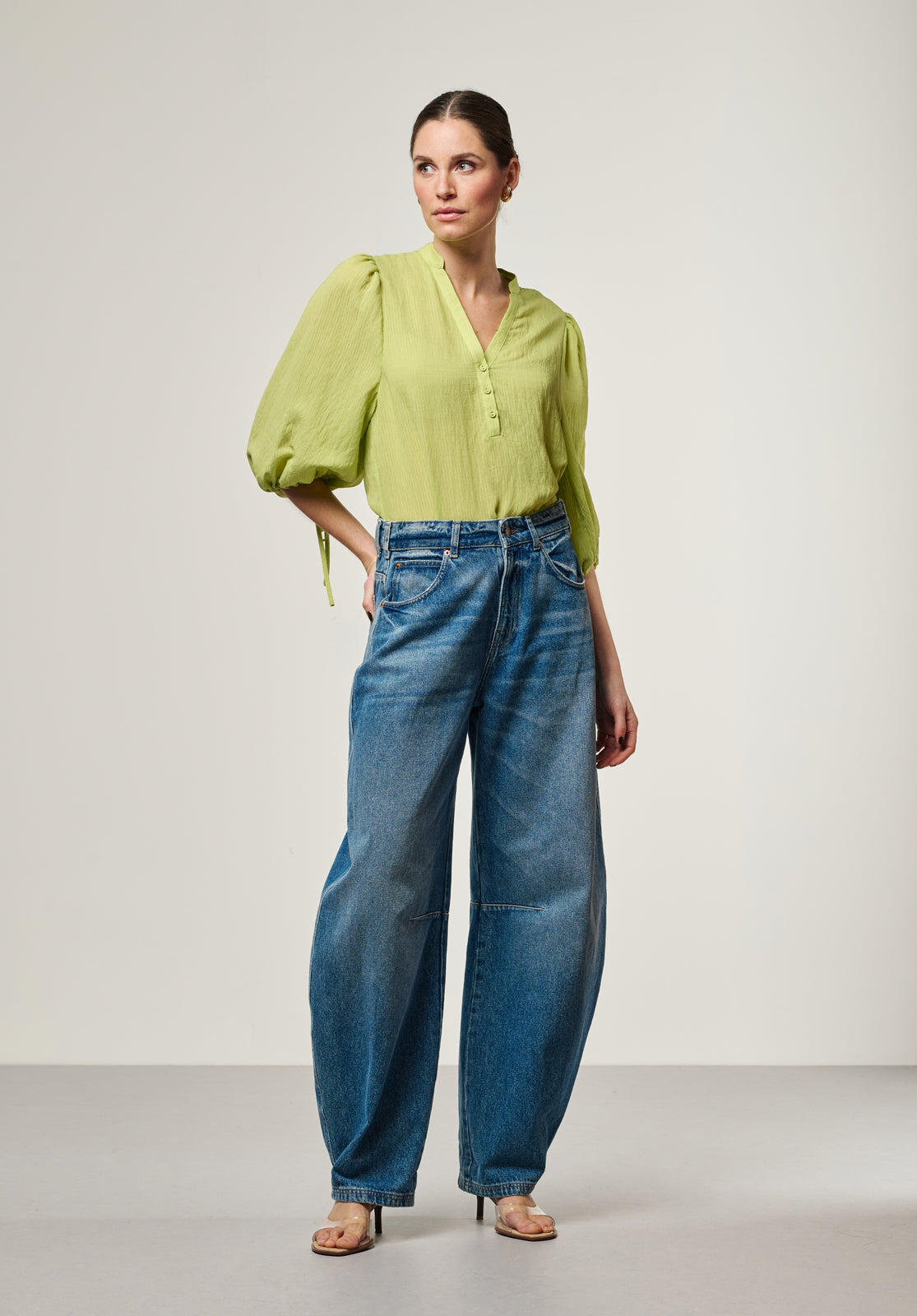 De Dahlia blouse is een luchtig model met een subtiele structuur in de stof en een rechte pasvorm. De blouse heeft een V-hals met knoopsluiting en licht gepofte mouwen die eindigen in een elastische boord. Een makkelijk te combineren item dat comfortabel zit en net dat beetje extra geeft aan je outfit.