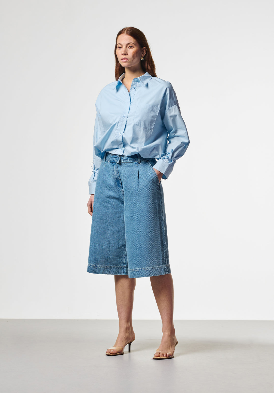 De Mikkie Blouse is een luchtige poplin blouse met een casual fit en klassieke kraag. De mouwen zijn afgewerkt met smalle strikkoorden bij de manchetten, wat zorgt voor een subtiel detail. Dankzij de rechte snit valt de blouse losjes om het lichaam en is hij makkelijk te combineren. Draag met de Sacha Barrel jeans voor een relaxed everyday look.
