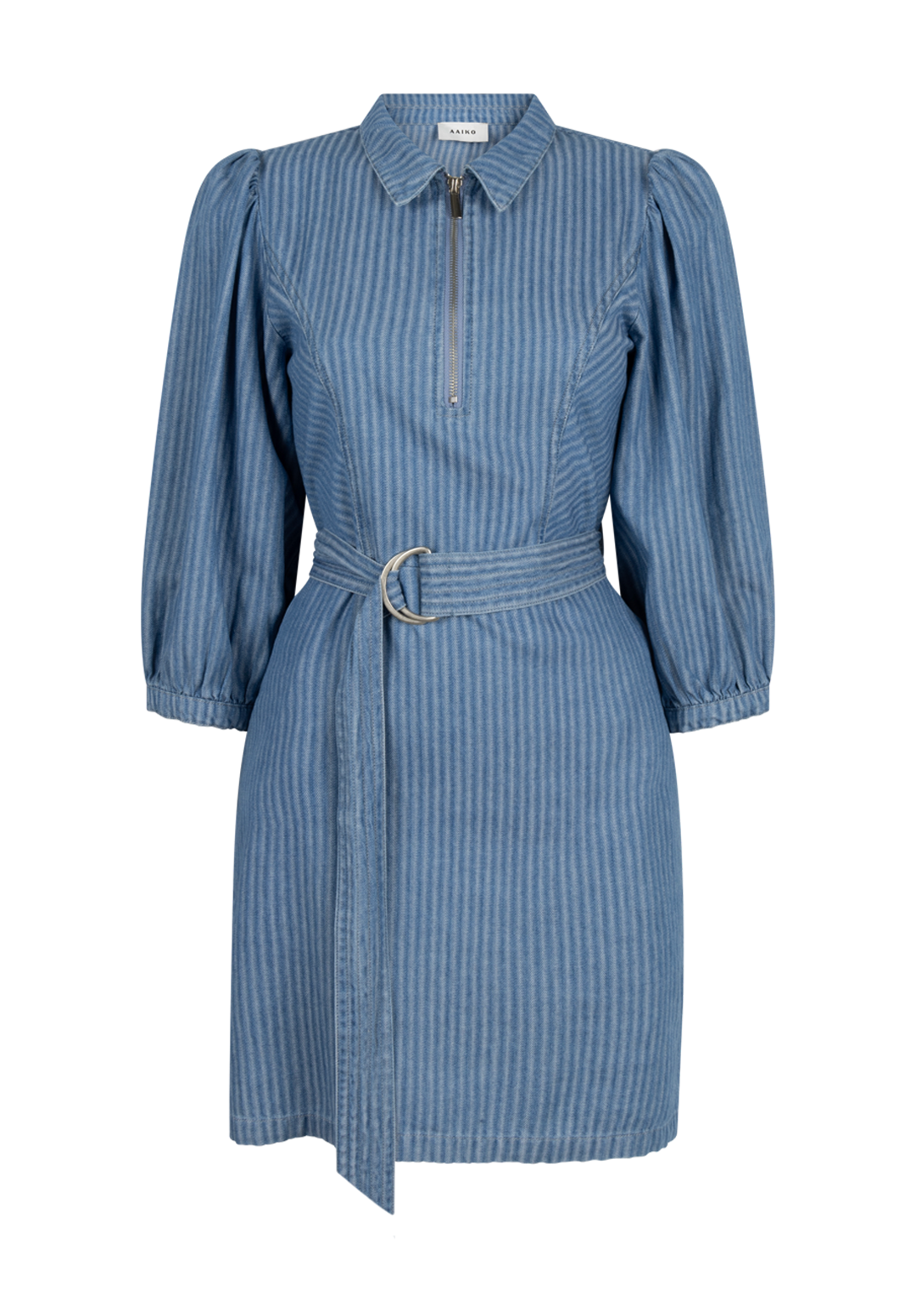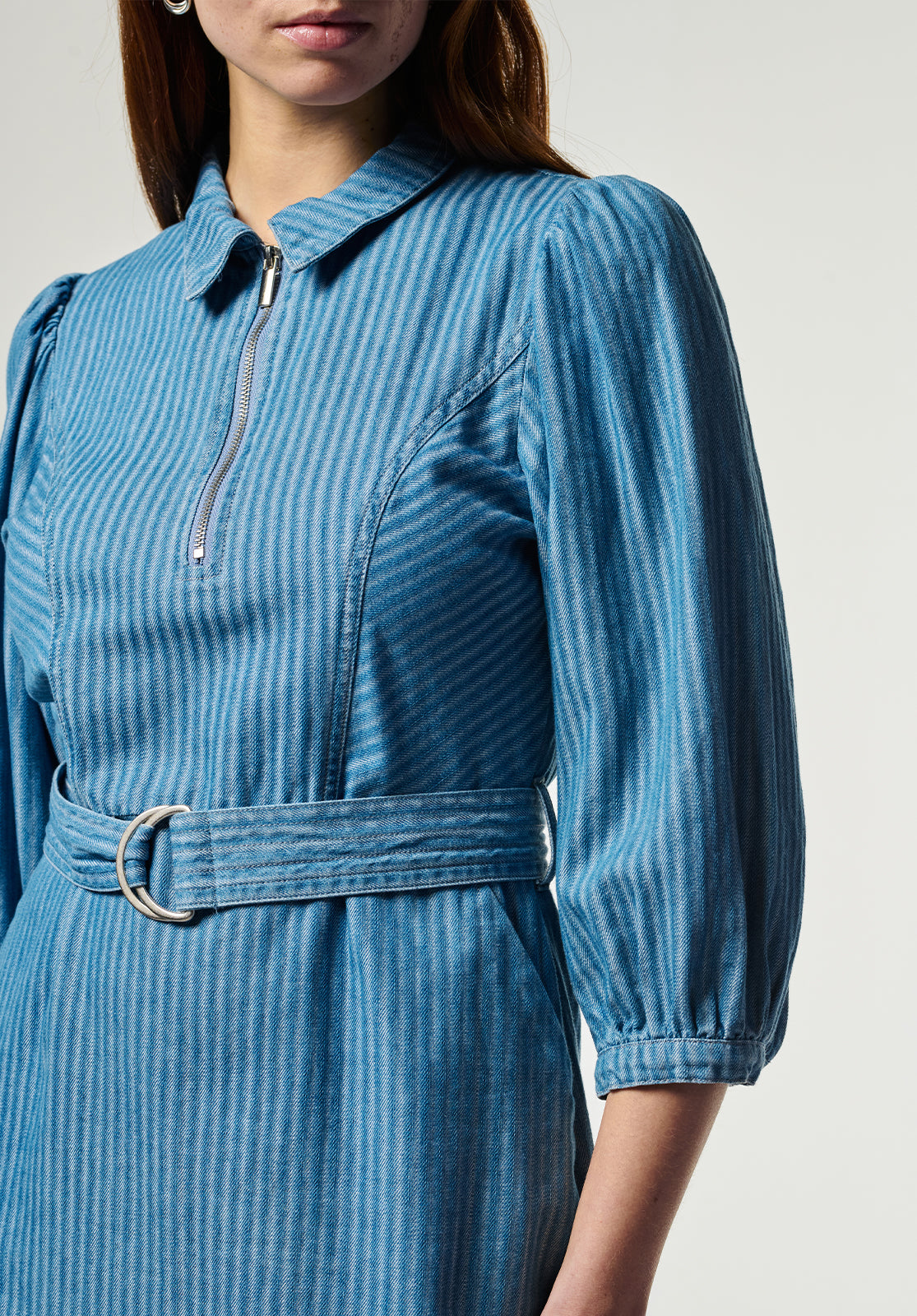 Deze jurk is uitgevoerd in een soepele denimstof met een verfijnd streeppatroon. Het model heeft een klassieke kraag, een korte ritssluiting aan de voorzijde en lange mouwen met lichte plooidetails. De ceintuur in de taille zorgt voor een vrouwelijk silhouet. Perfect voor een stijlvolle, casual look.
