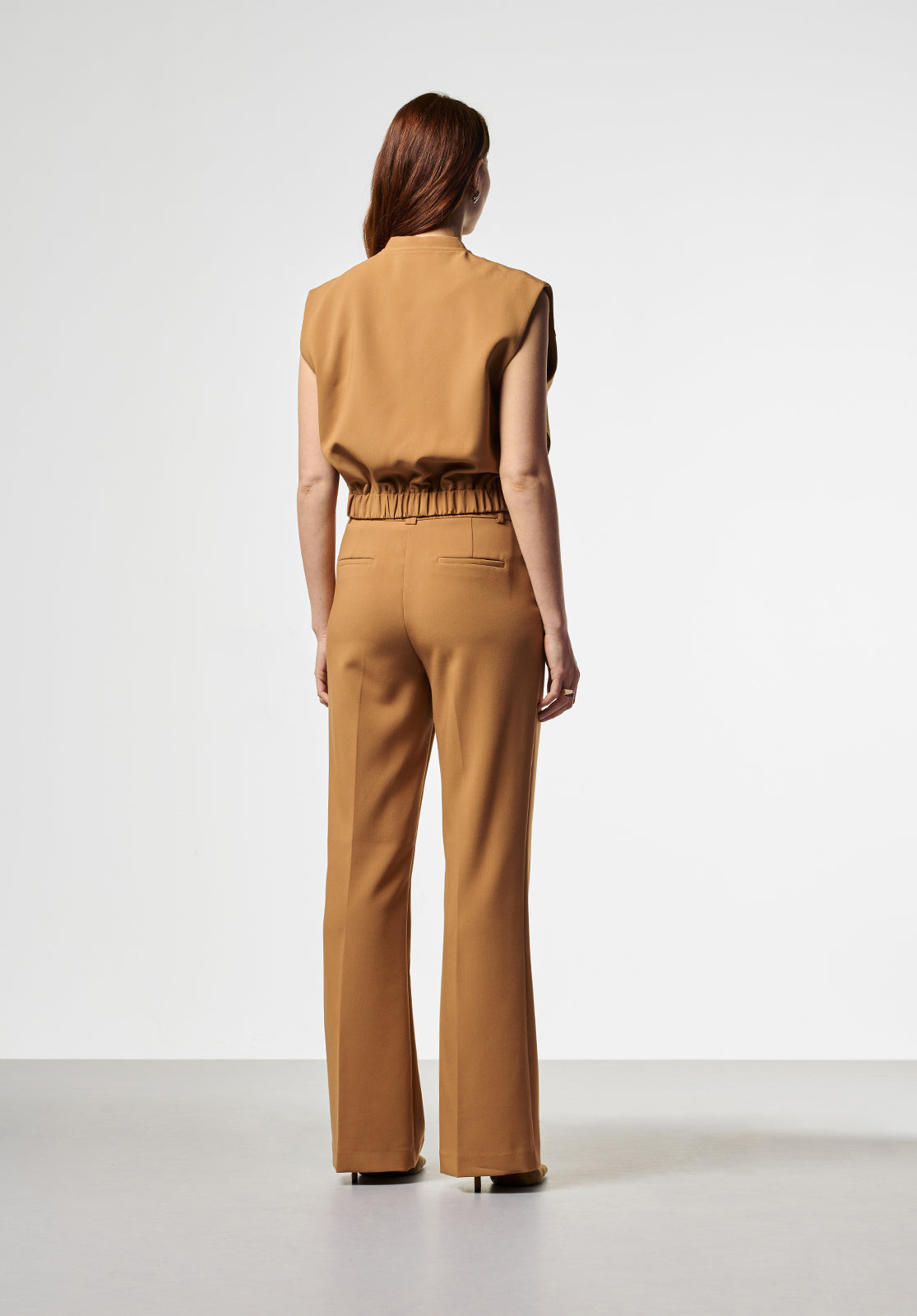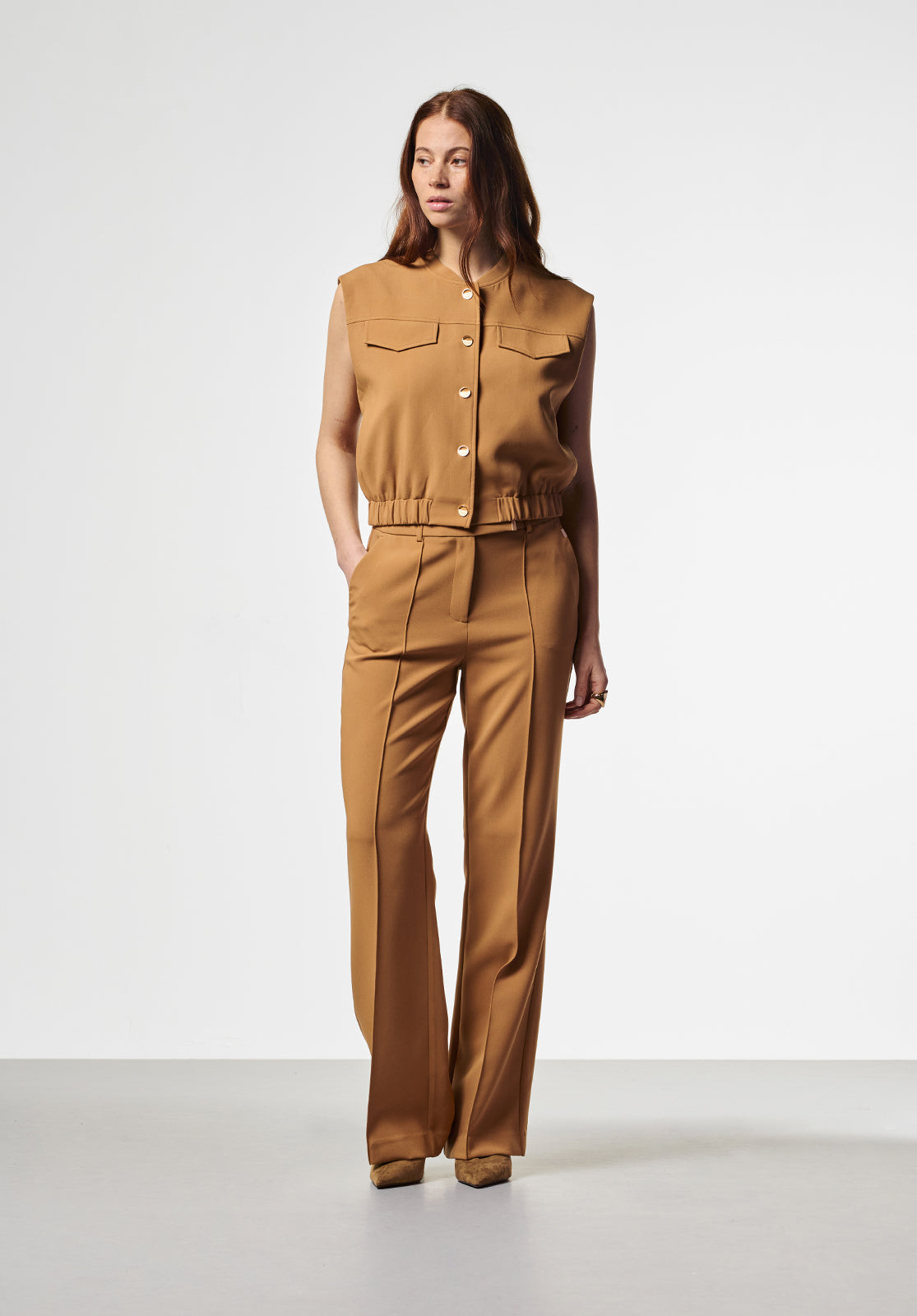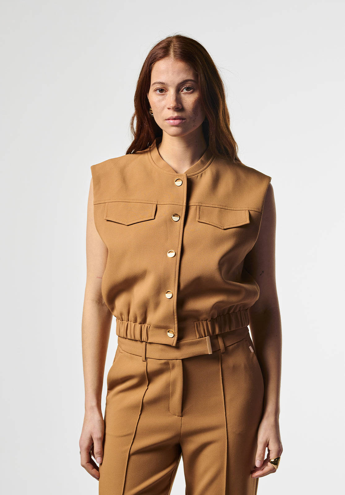 Deze mouwloze top heeft een moderne en stoere uitstraling dankzij het korte model en de stevige stof. De ronde hals en knoopsluiting aan de voorzijde zorgen voor een nette afwerking. De borstzakken en elastische zoom geven het ontwerp een eigentijdse touch. Perfect om te dragen als statement item of combinatie met de Linde broek.