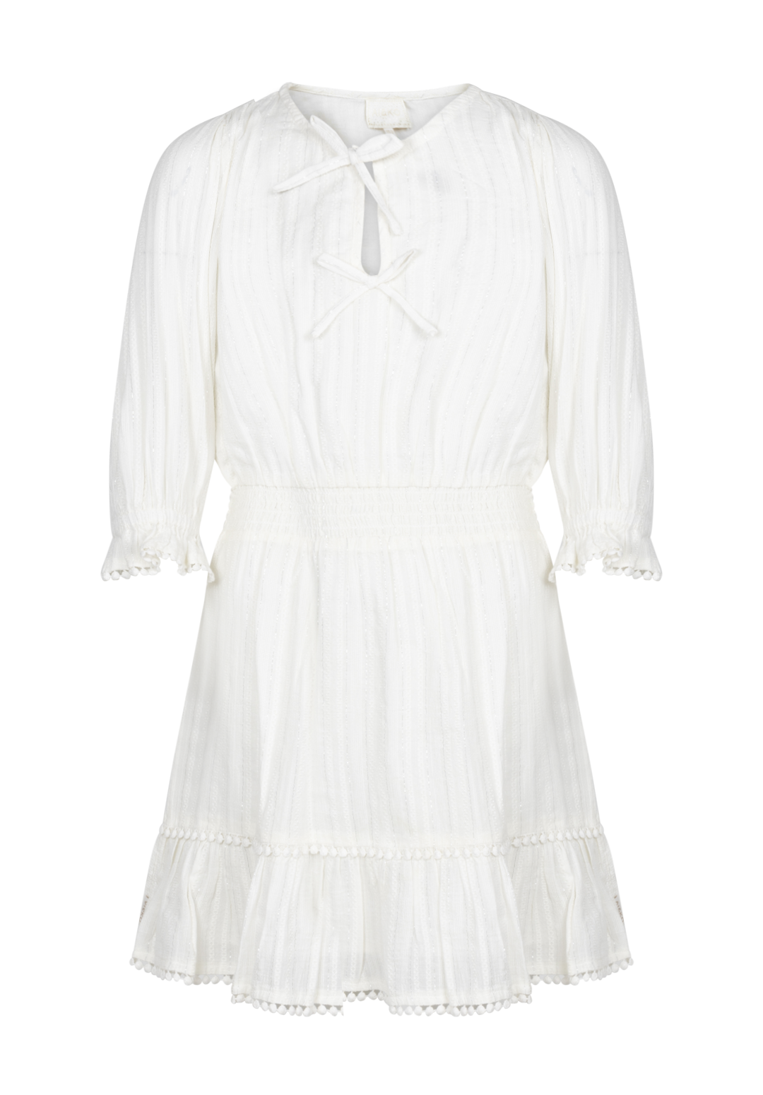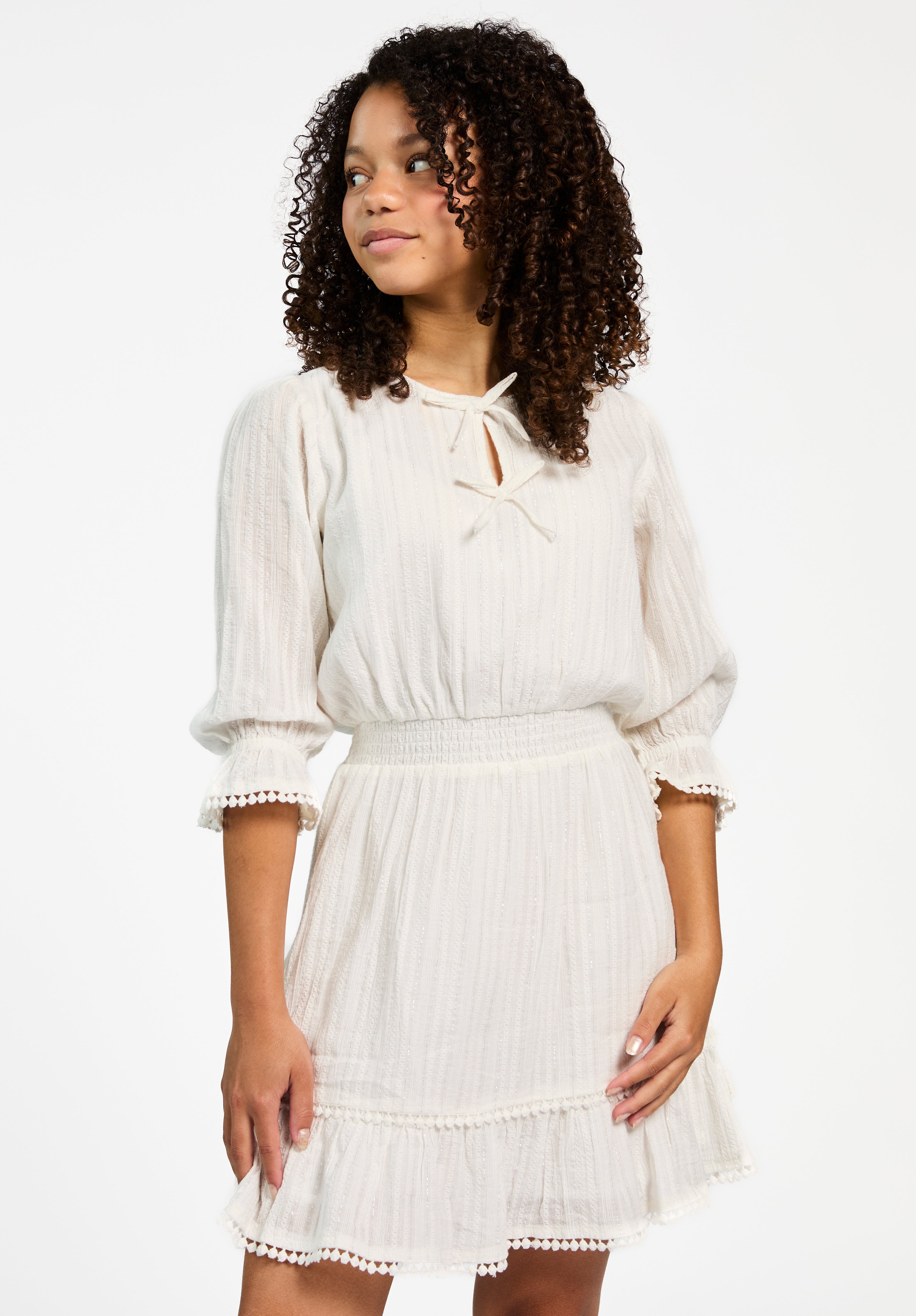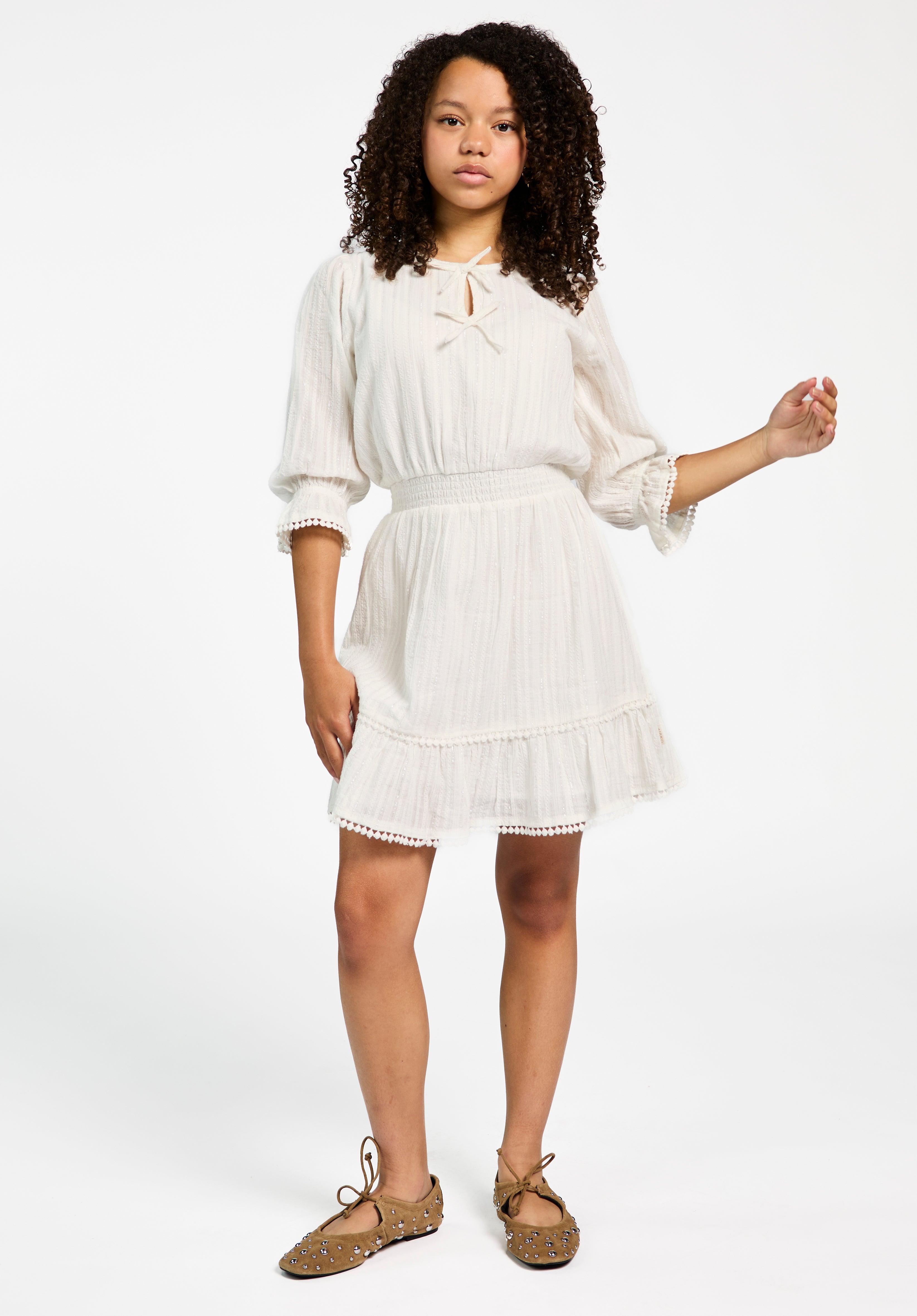 Deze jurk voor meiden heeft een zachte en romantische uitstraling. De fijne structuur in de stof en de subtiele glans geven de jurk een feestelijk tintje. De strikdetails bij de hals en de gesmokte taille zorgen voor een speels en comfortabel silhouet.