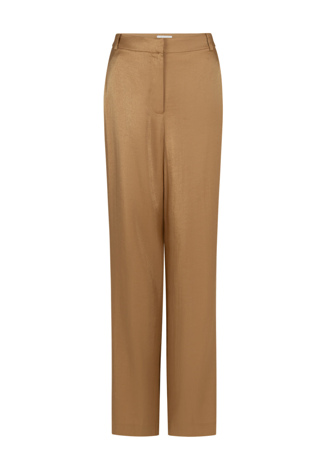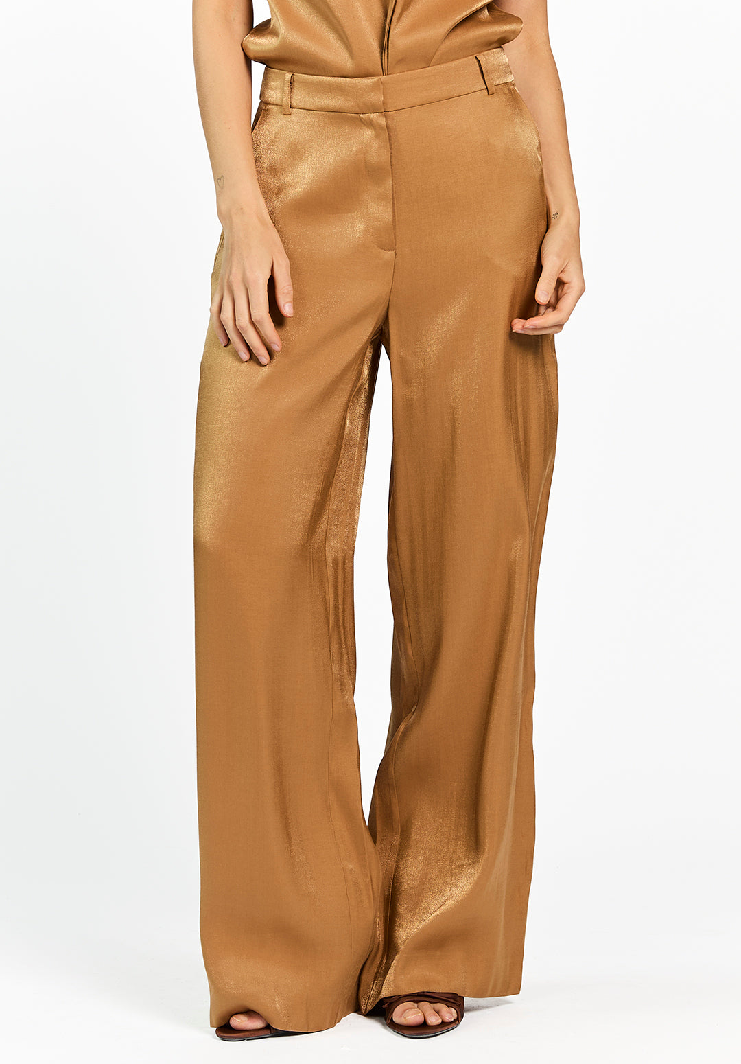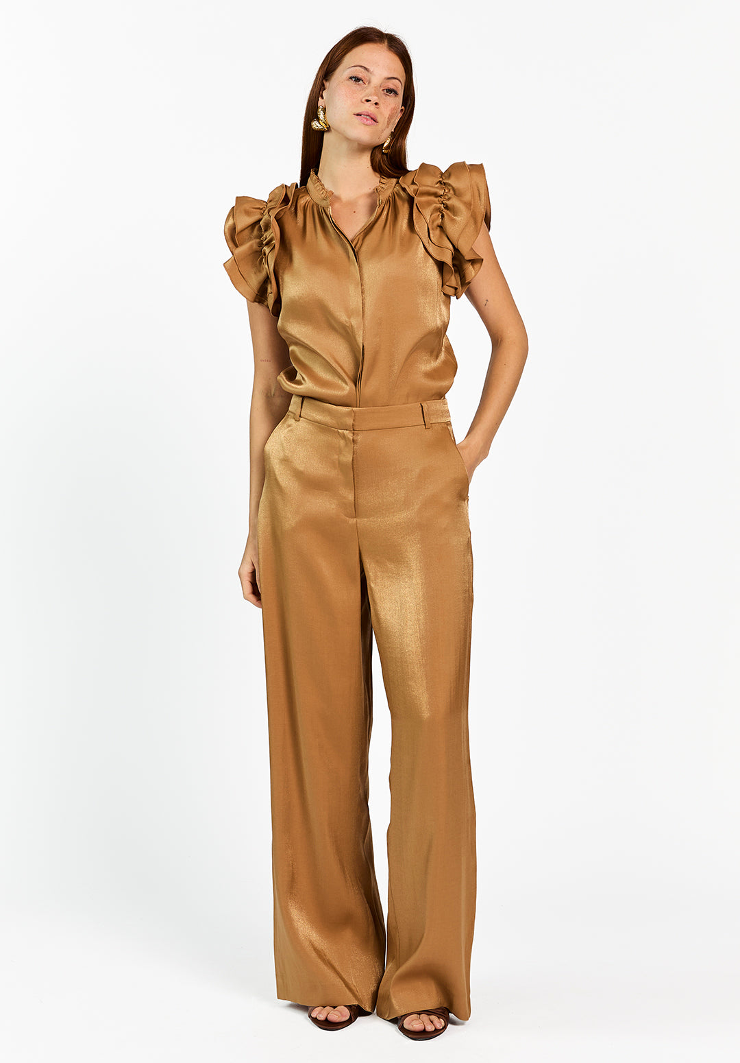 Deze soepelvallende broek is uitgevoerd in een glanzende stof met een elegante uitstraling. Het model heeft een hoge tailleband met riemlussen en een wijde, rechte pijp voor een flatterend silhouet. De lichte glans geeft de broek een feestelijke touch. Mooi te combineren met de Gezana top voor een complete en stijlvolle set.