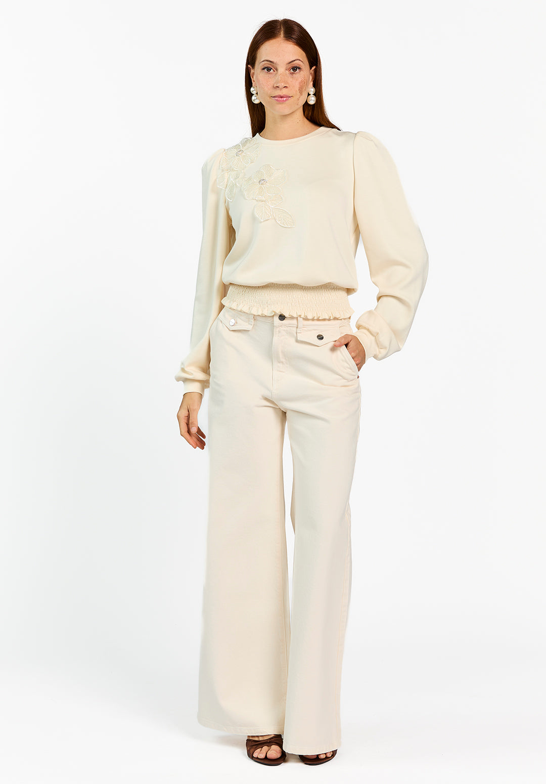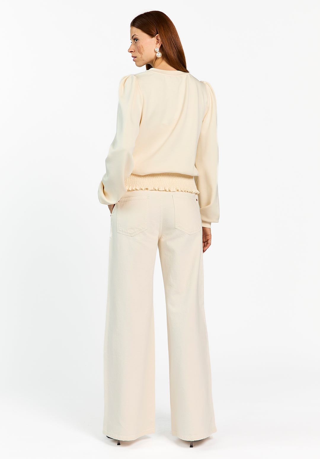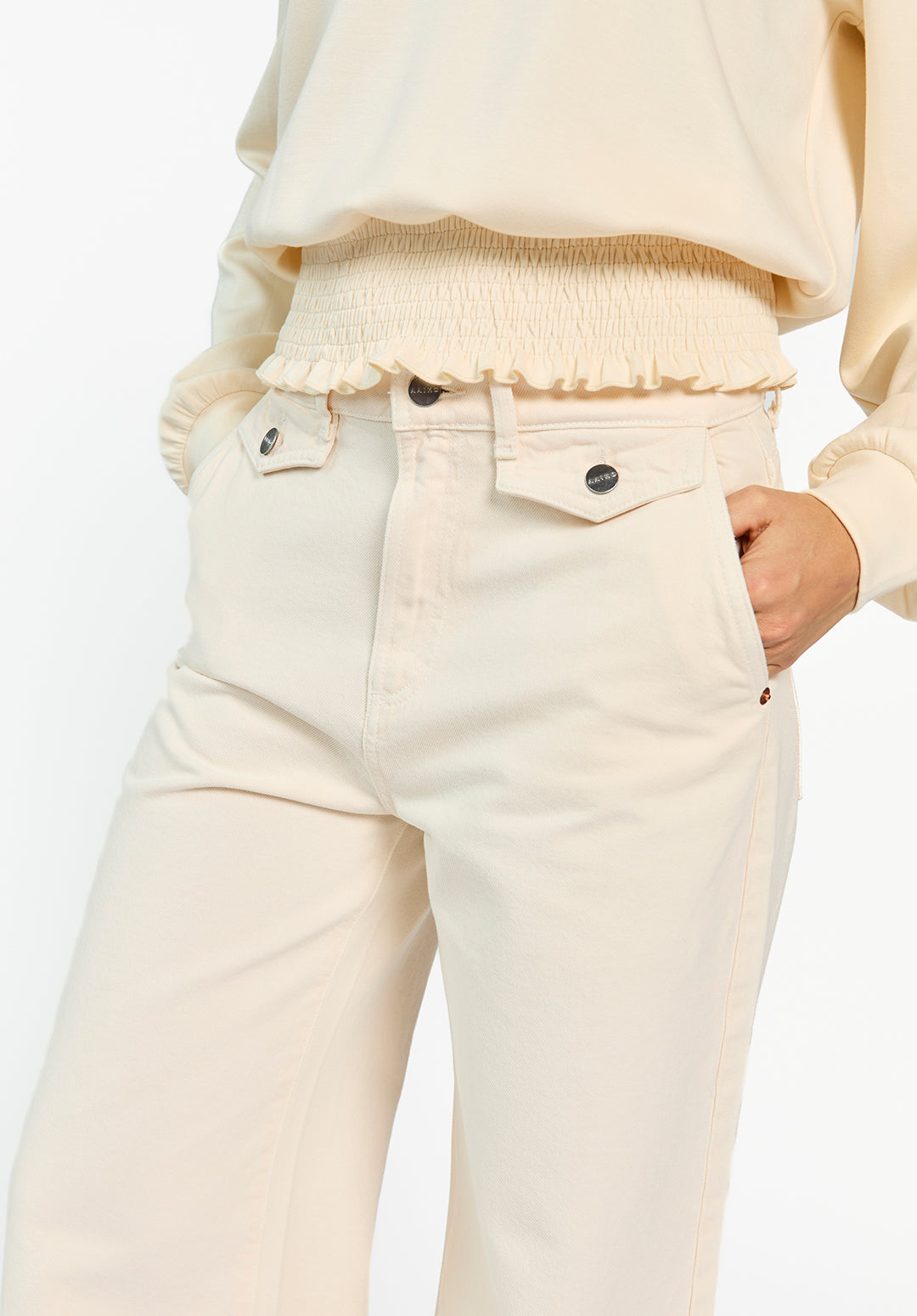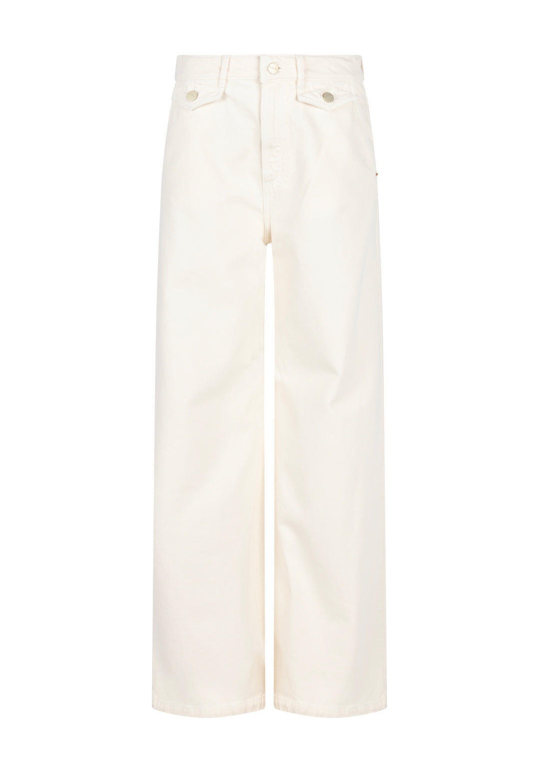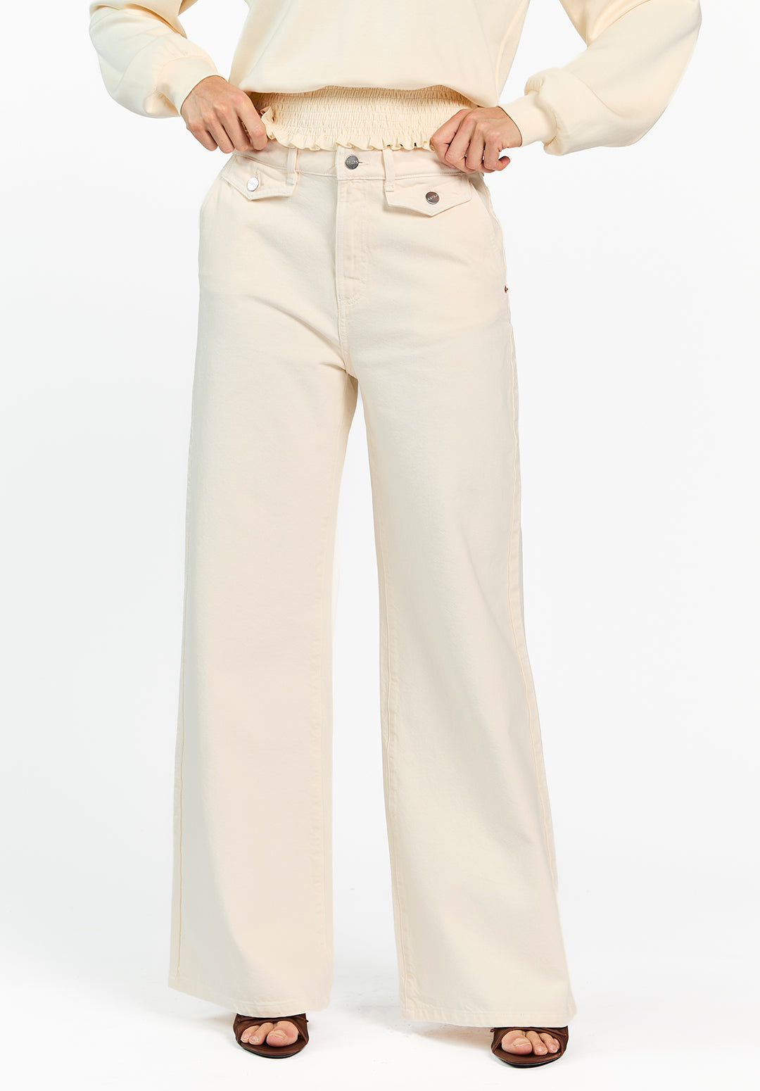 De Charly Jeans is een high-waisted model met een wide leg fit in een lichte, neutrale kleur. De broek is gemaakt van stevig katoen met een zachte feel en heeft klepzakken aan de voorkant. Dankzij de flatterende pasvorm en minimalistische look is dit een easy piece om te combineren in je dagelijkse garderobe.