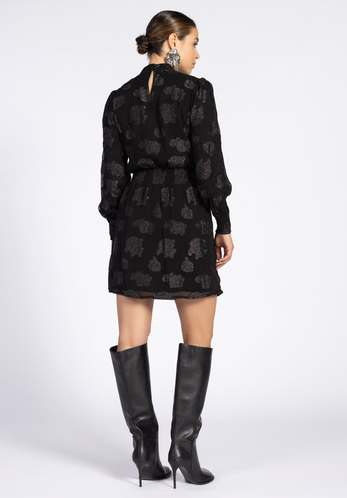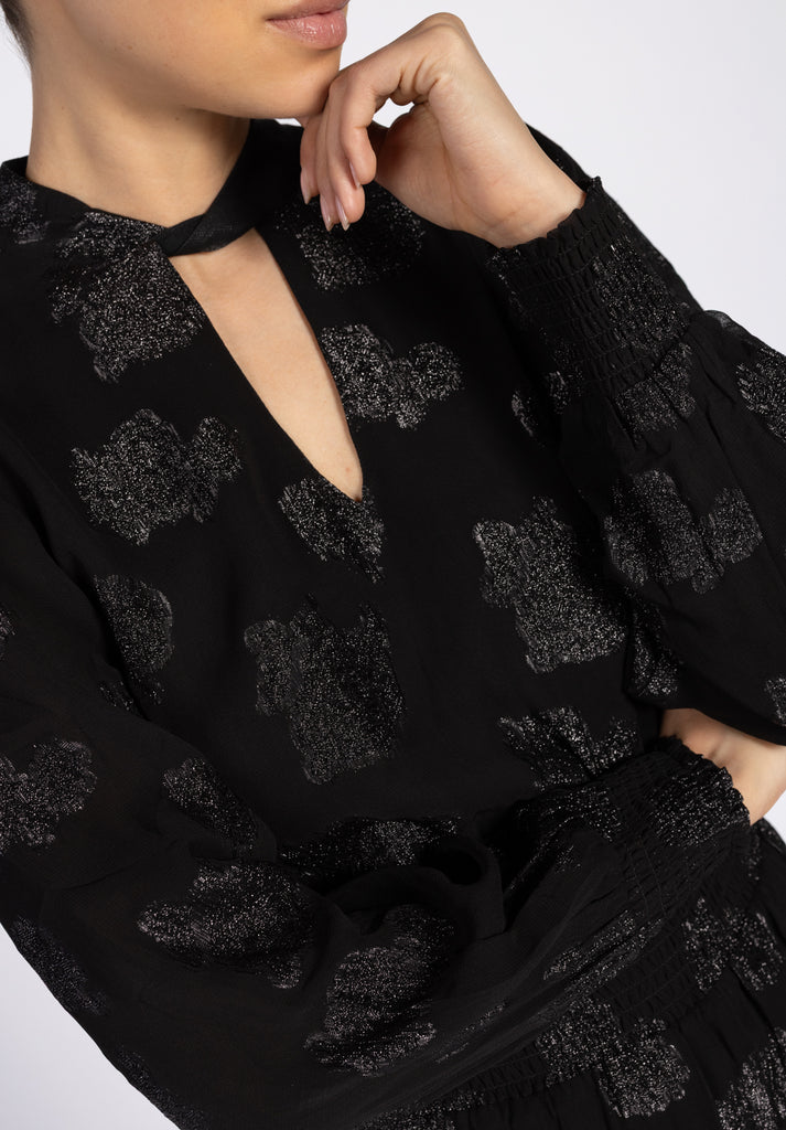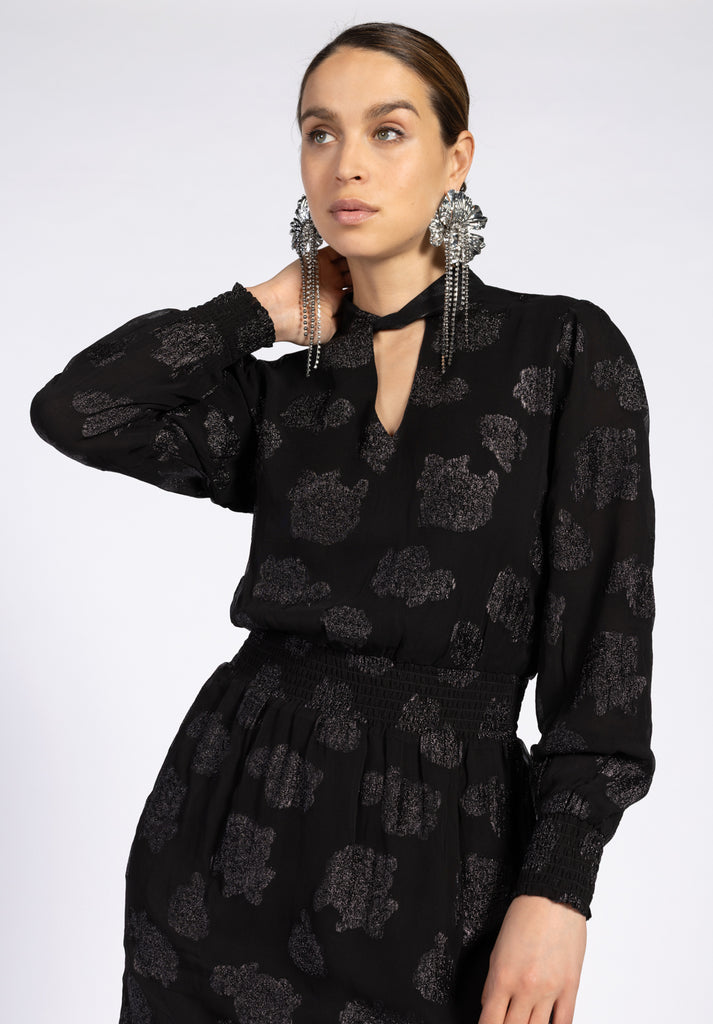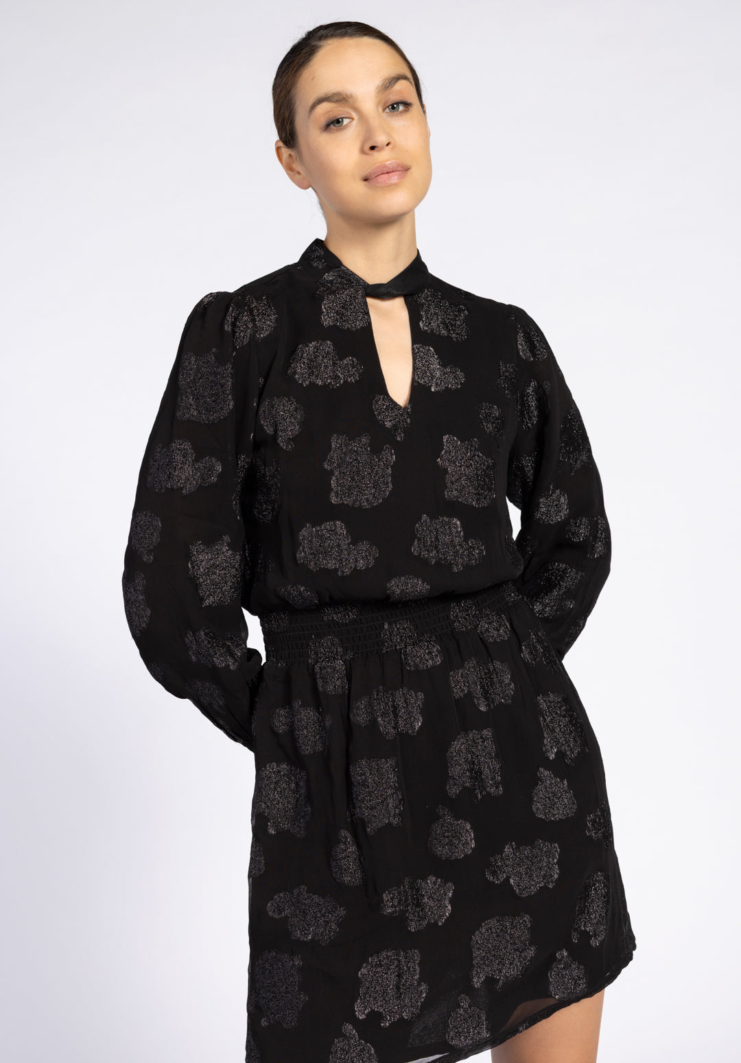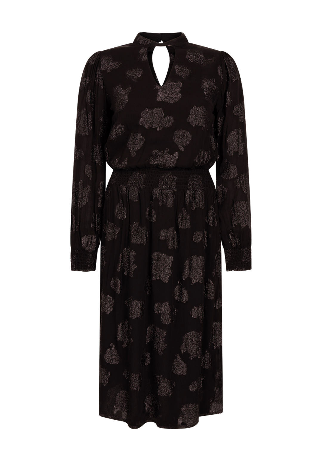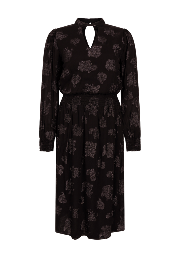 Gabry is een midi-jurk met een subtiele glitterprint die net genoeg sparkle toevoegt voor een day-to-night look. De keyhole halslijn en gesmokte taille zorgen voor een vrouwelijke silhouet, terwijl de luchtige stof mooi met je meebeweegt. Combineer met laarzen voor een casual touch of met heels naar een dinner date.