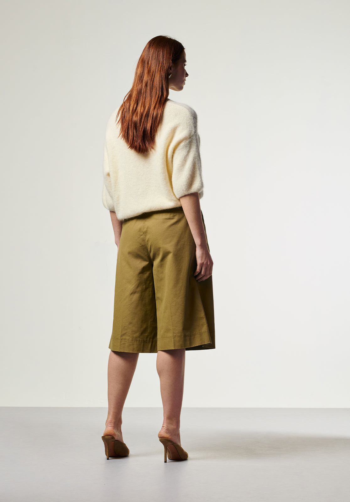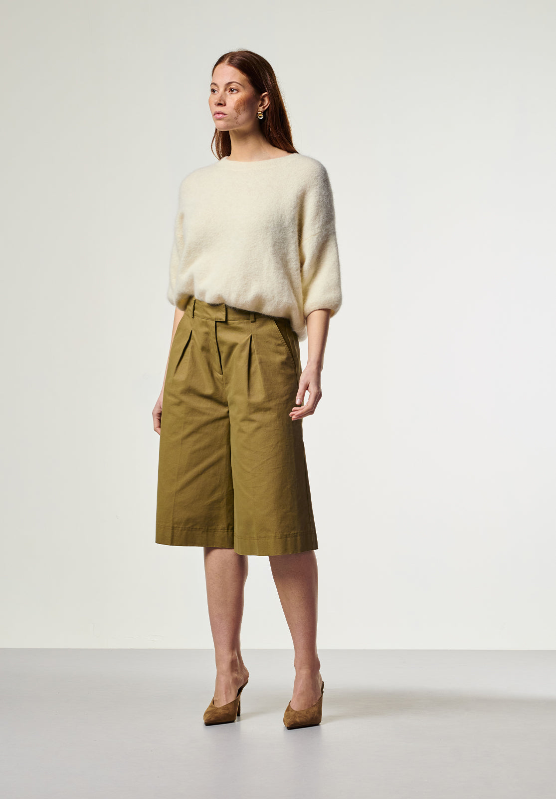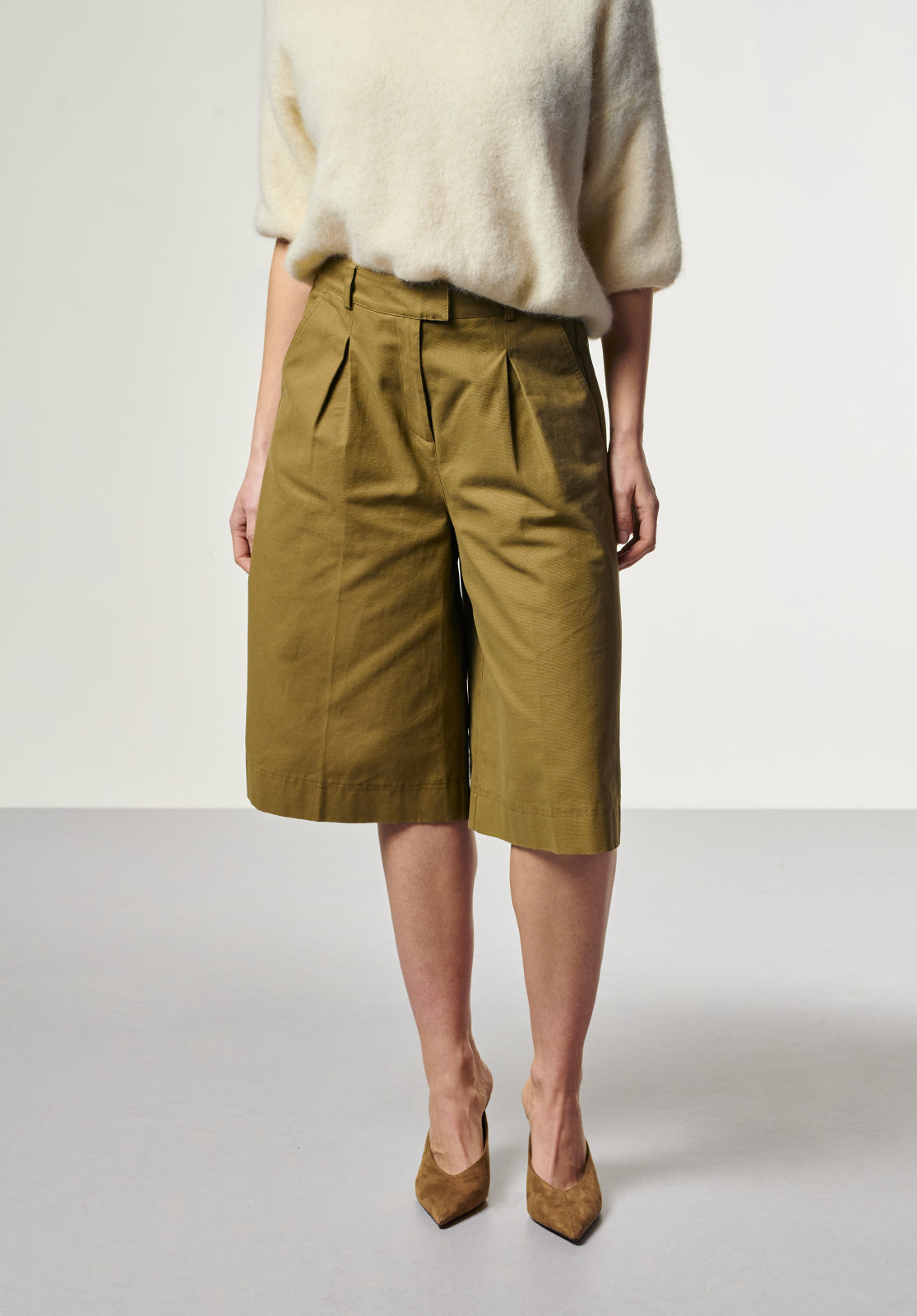 De bermuda, maar dan met een moderne edge. De Inaya Bermuda heeft een hoge taille, wijde pijpen en scherpe plooien voor een structured look met een nonchalante twist. Gemaakt van stevig katoen met een lichte stretch, wat zorgt voor comfort én vormbehoud. Combineer met een blouse of knit voor een krachtige citylook.