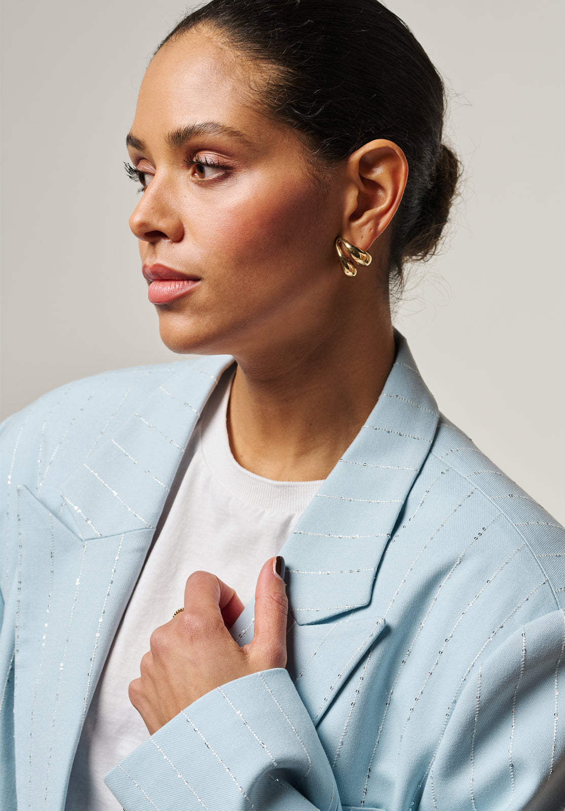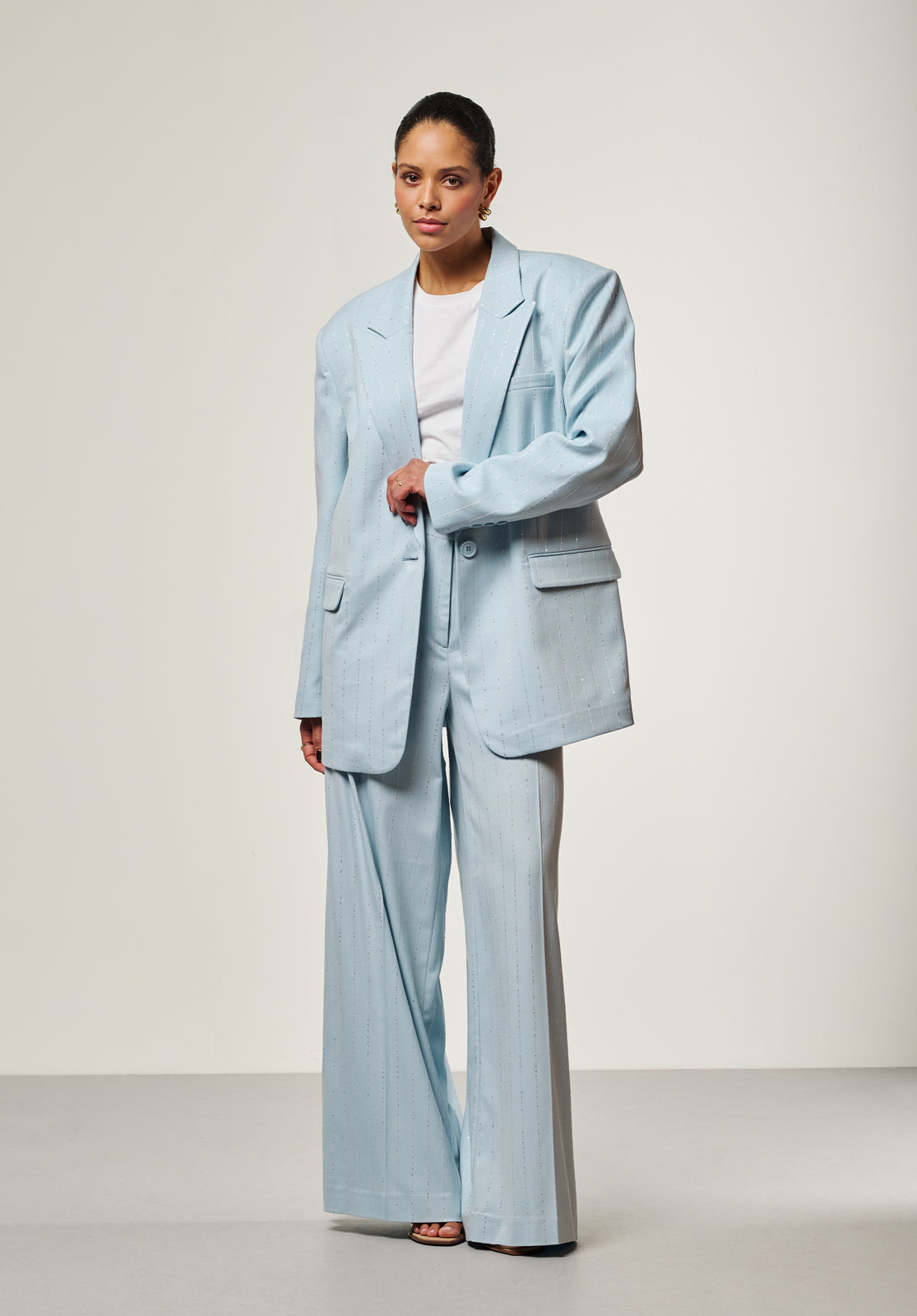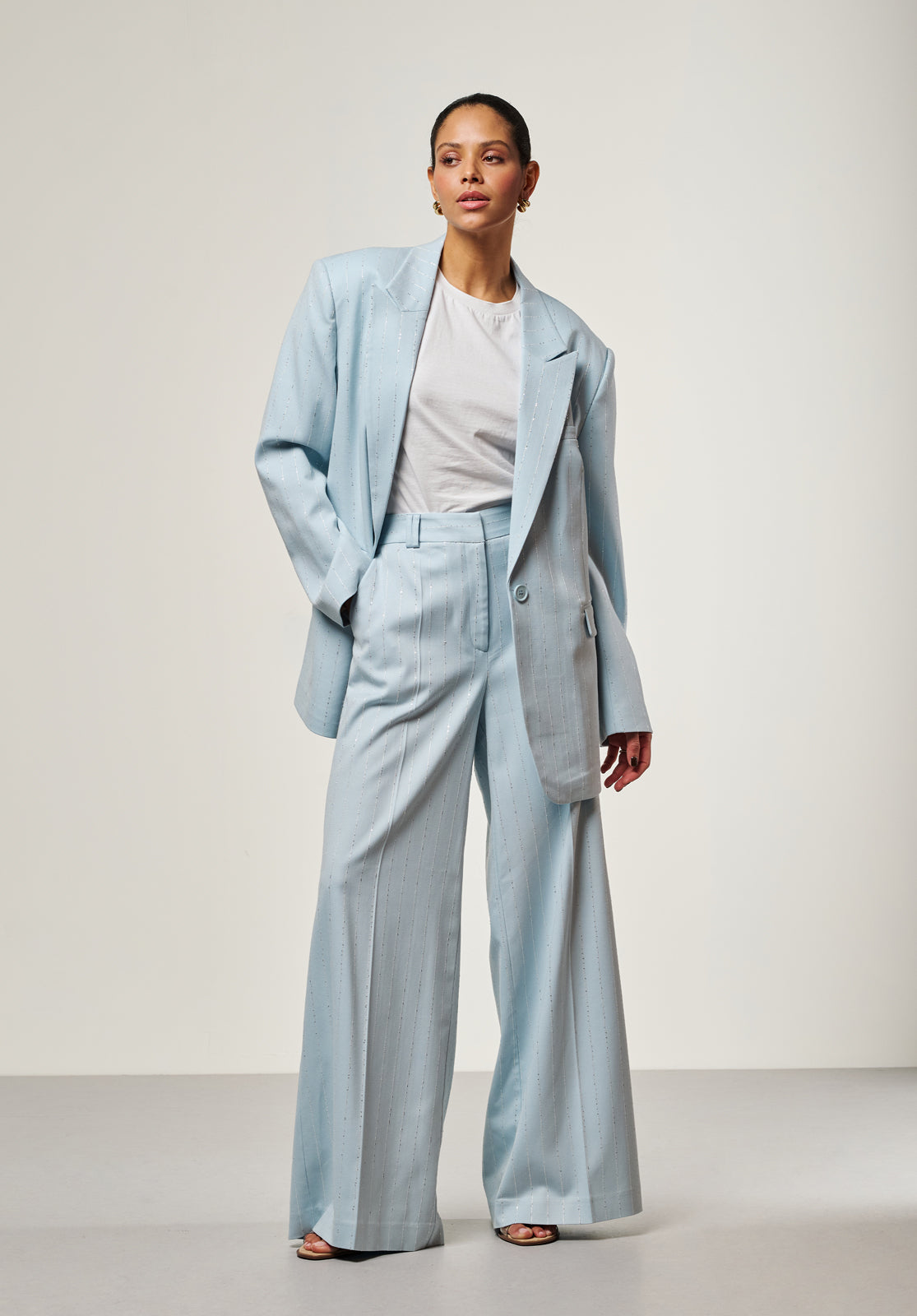 De Kendal Blazer is een single-breasted model met een rechte fit en lichte schoudervulling. Het ijsblauwe materiaal is afgewerkt met ingeweven glansdraad, wat zorgt voor een subtiele sparkle. De klassieke revers en paspelzakken geven het jasje een clean karakter. Combineer met de Nore Broek voor een co-ord look die werkt voor office én avond.