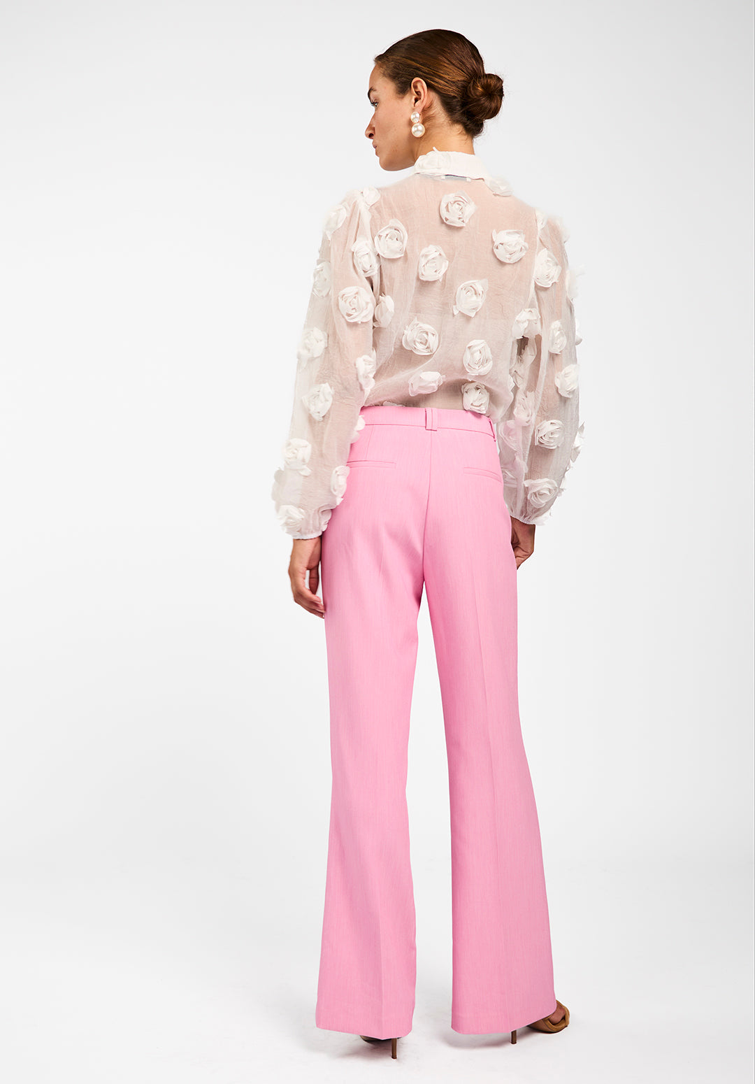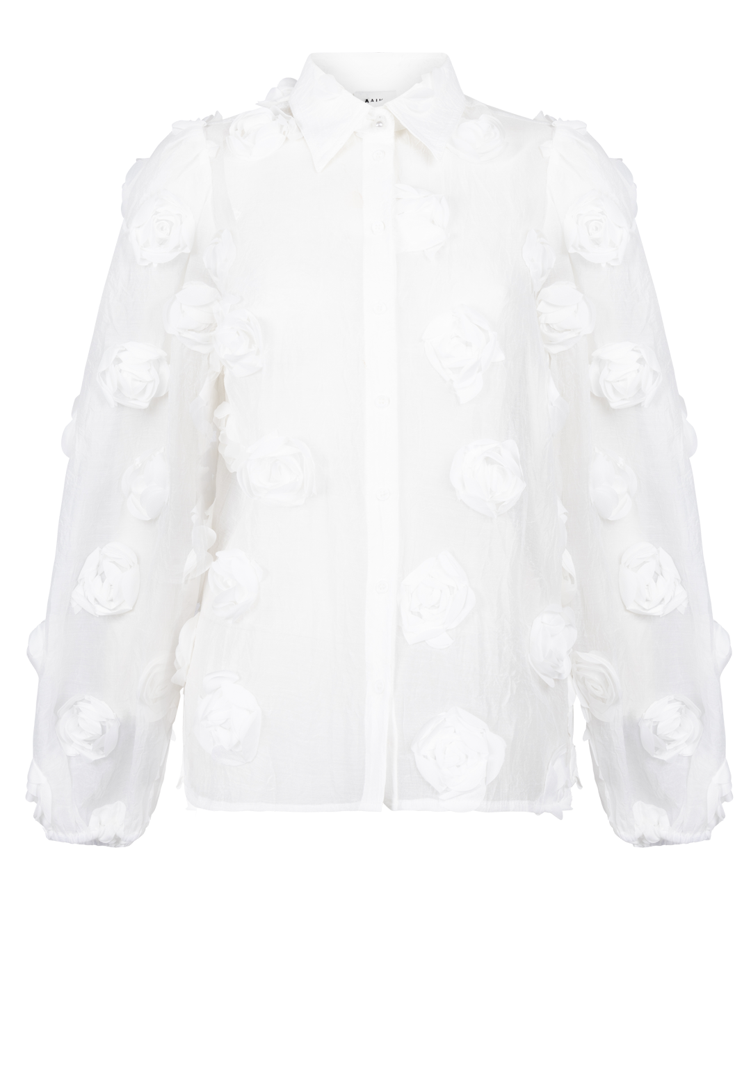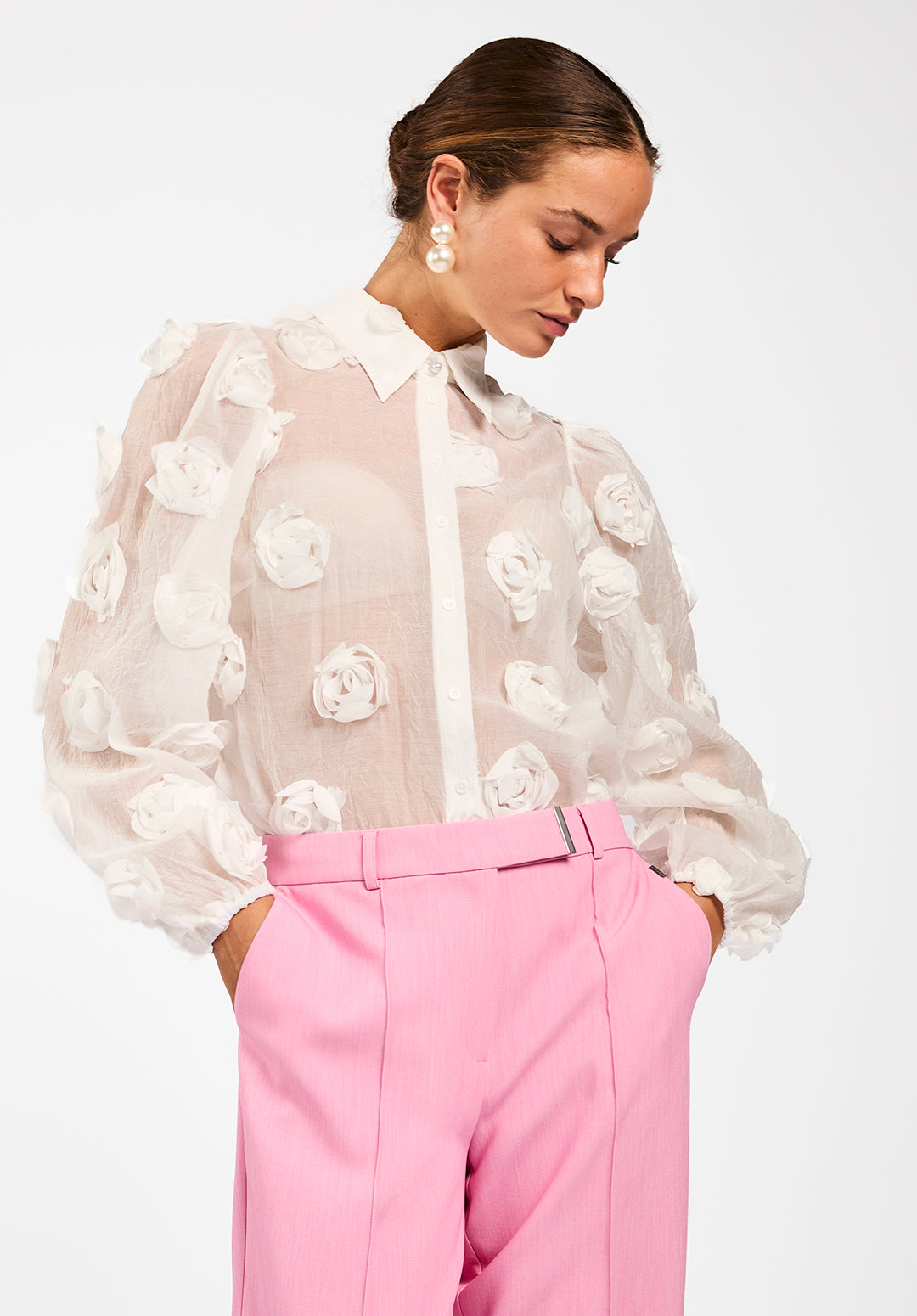 De Lien blouse is een uitgesproken item dat meteen opvalt door de structuur en transparantie. De blouse is luchtig en licht van gewicht, met 3D-bloemenapplicaties die zorgen voor een verrassend effect. De klassieke kraag en knoopsluiting maken het geheel chic, terwijl de ballonmouwen een extra speels accent toevoegen. Draag met een top of bralette eronder voor een subtiele, gelaagde look. Combineer met pantalon Chantalle.