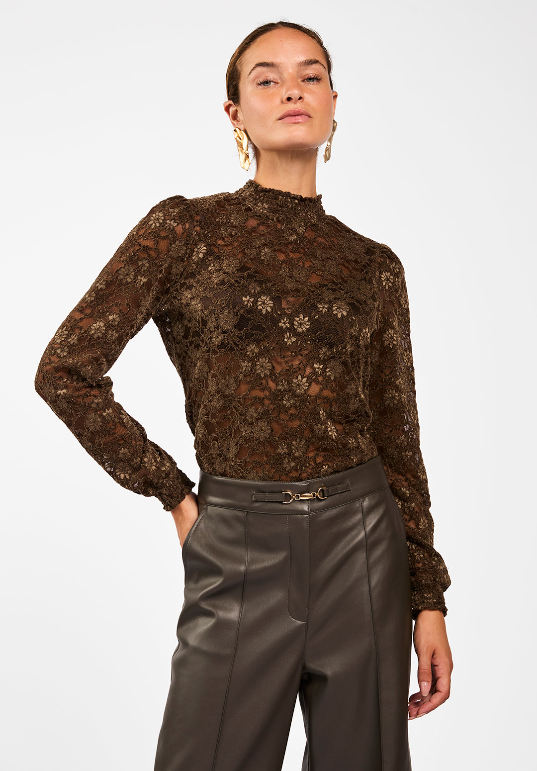 De Tory Lace Top is een verfijnde groene longsleeve, uitgevoerd in een semi-transparante kanten stof. De hoge halslijn en licht gepofte mouwen geven het item een vrouwelijke en moderne uitstraling. Combineer met een mooie bralette of top eronder voor een gedurfde, maar stijlvolle layered look. Stijl af met broek Sonja.