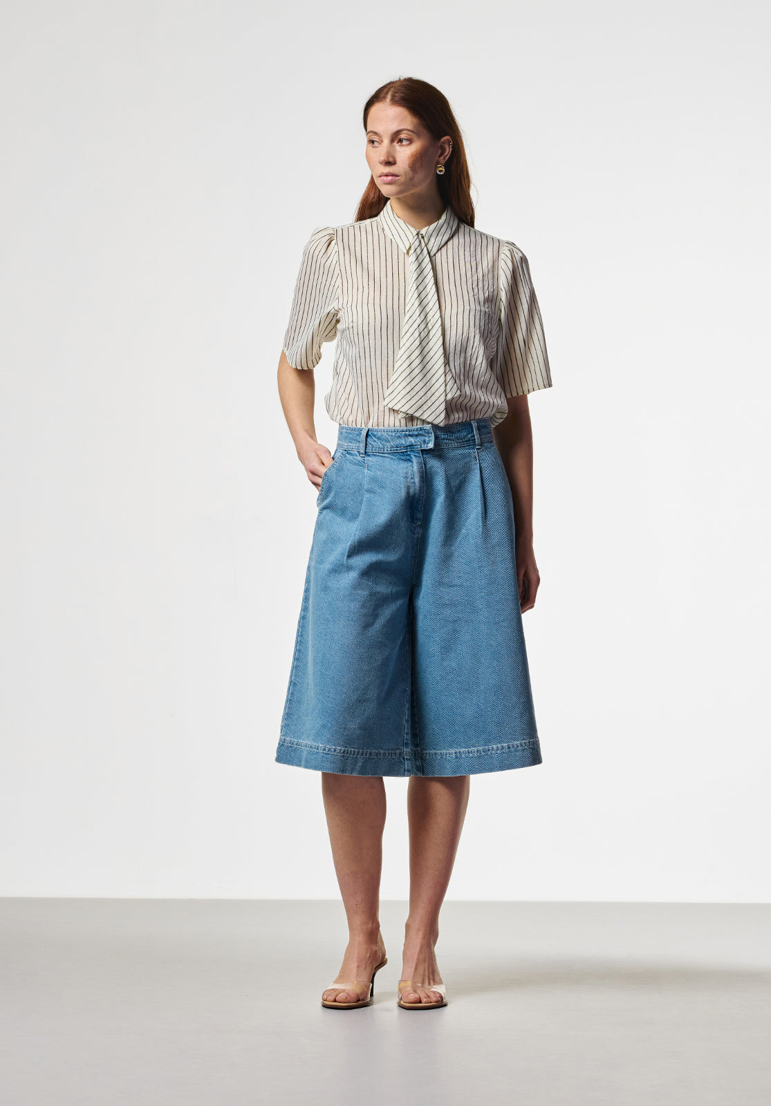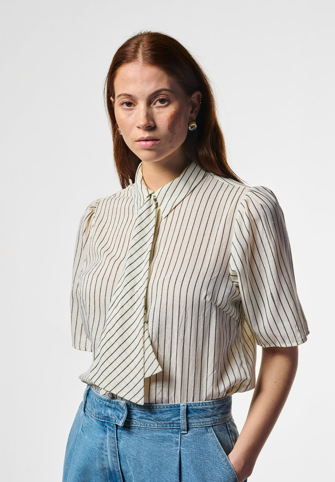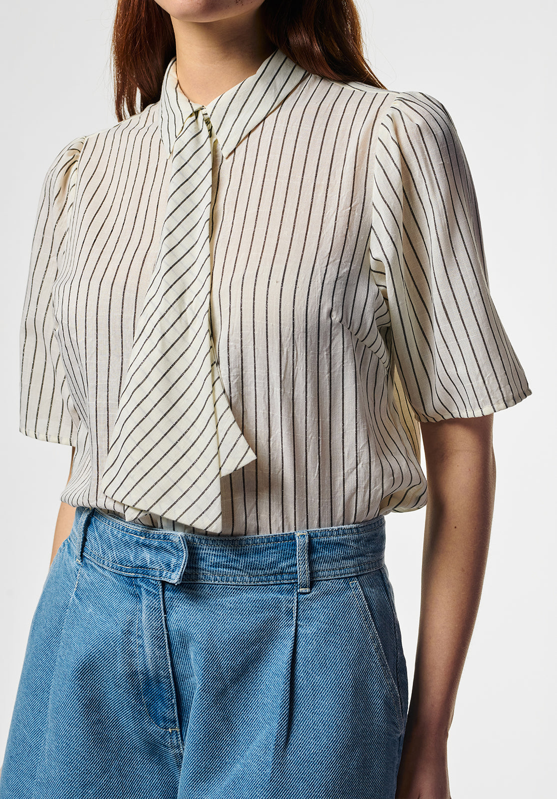 Deze blouse heeft een frisse, vrouwelijke uitstraling met een duidelijke knipoog naar klassieke tailoring. Het korte mouwtje en de rechte snit zorgen voor een moderne balans, terwijl de striksluiting bij de hals het ontwerp extra karakter geeft. Een veelzijdig item dat moeiteloos werkt in zowel geklede als dagelijkse looks.