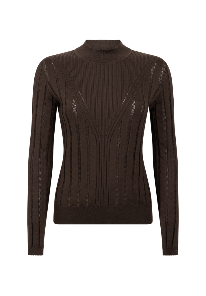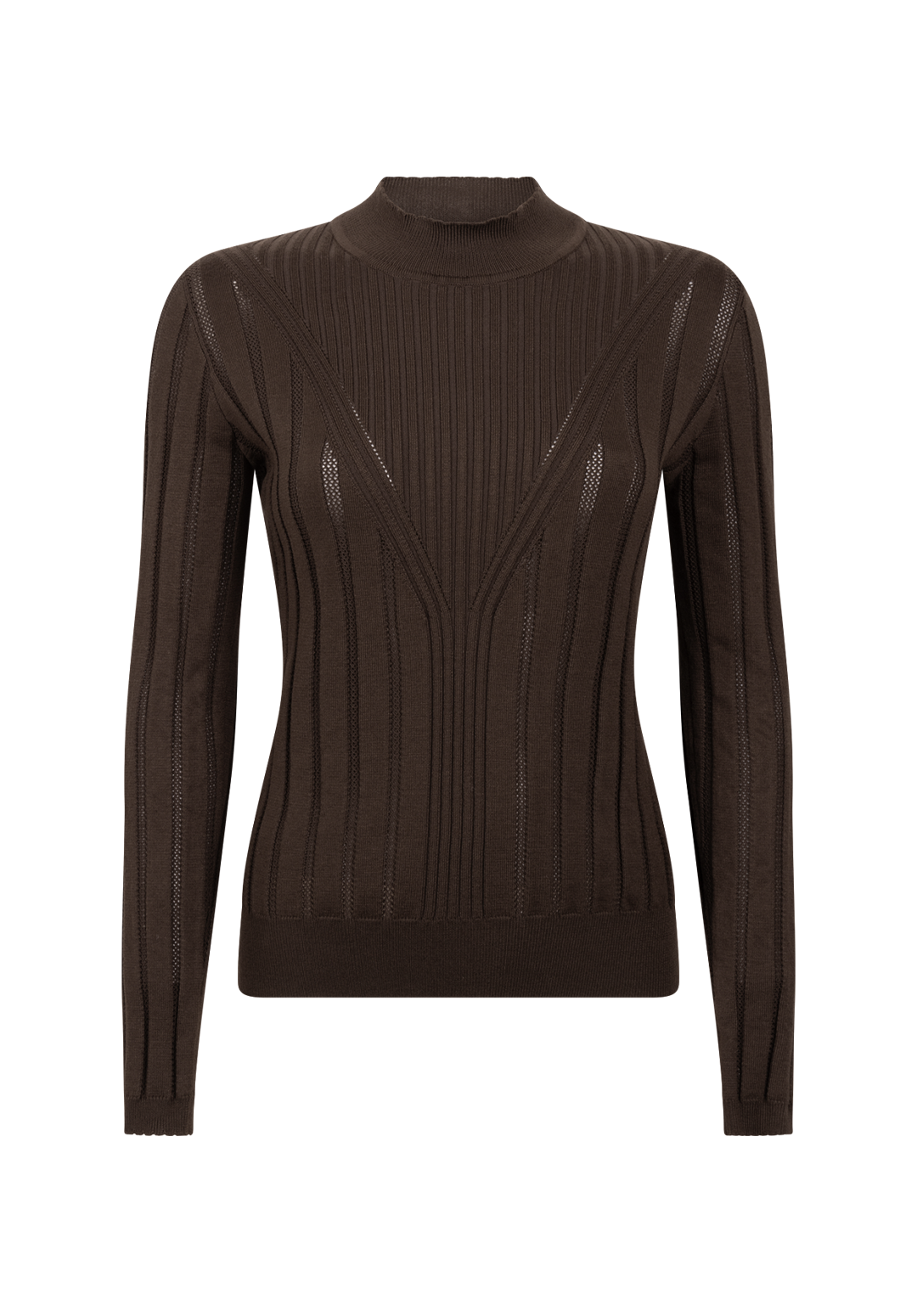 De Vida trui is een verfijnd gebreid kledingstuk met een stoere twist. De aangesloten pasvorm wordt benadrukt door het asymmetrische ribpatroon dat de top visueel vorm geeft. De hoge hals en lange mouwen maken het een ideaal kledingstuk om in laagjes te dragen. De diepe, rijke kleur geeft de trui een luxe uitstraling met een subtiele stoer accent. Combineer met de broek Sonja.