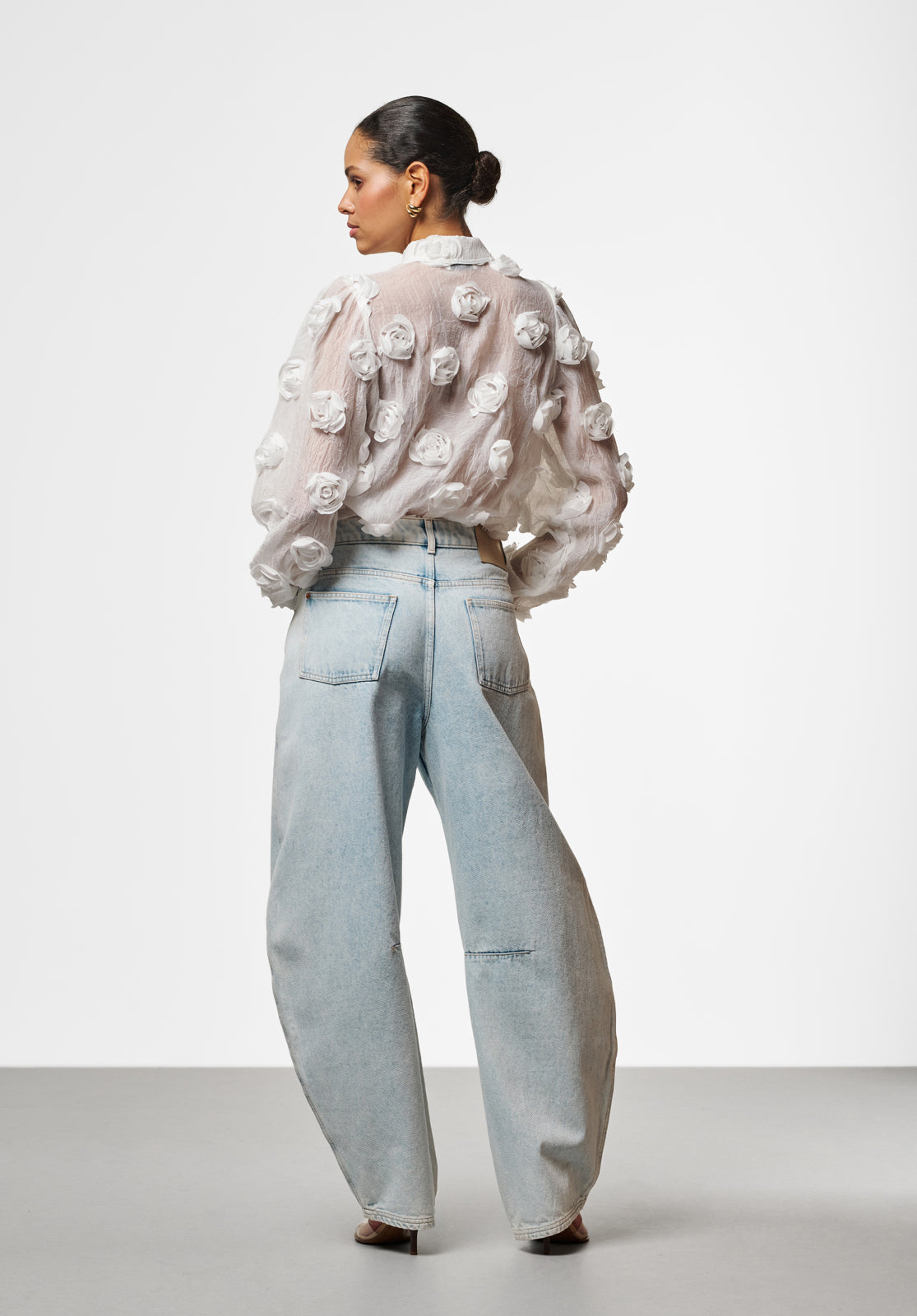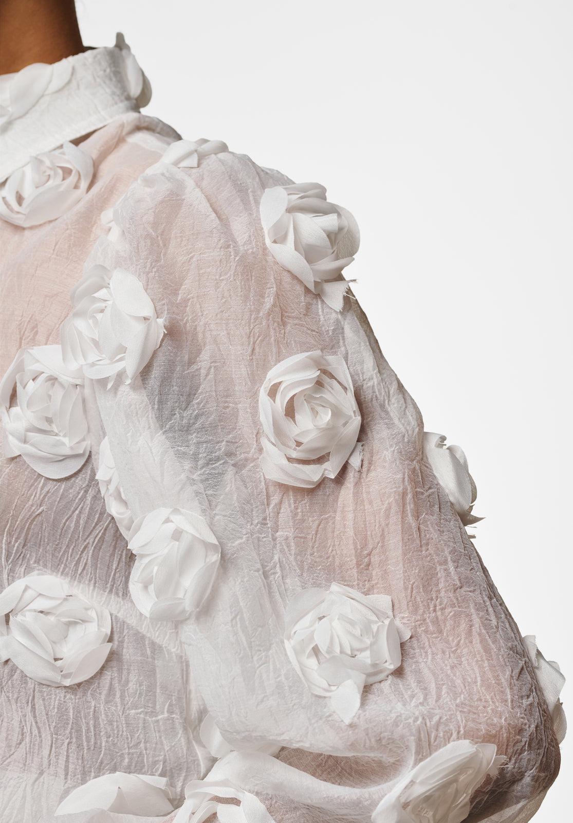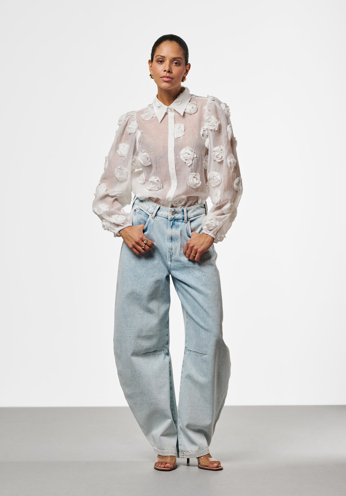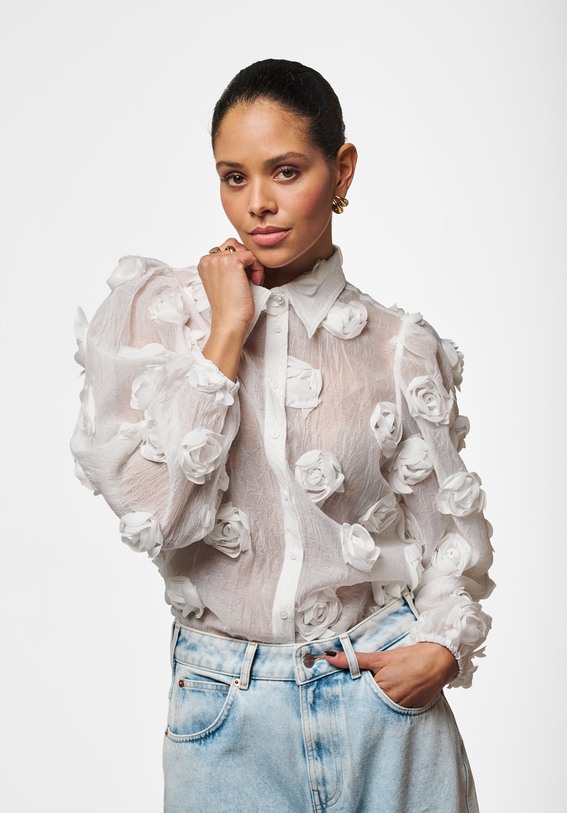 De Lien blouse is een uitgesproken item dat meteen opvalt door de structuur en transparantie. De blouse is luchtig en licht van gewicht, met 3D-bloemenapplicaties die zorgen voor een verrassend effect. De klassieke kraag en knoopsluiting maken het geheel chic, terwijl de ballonmouwen een extra speels accent toevoegen. Draag met een top of bralette eronder voor een subtiele, gelaagde look. Combineer met pantalon Chantalle.