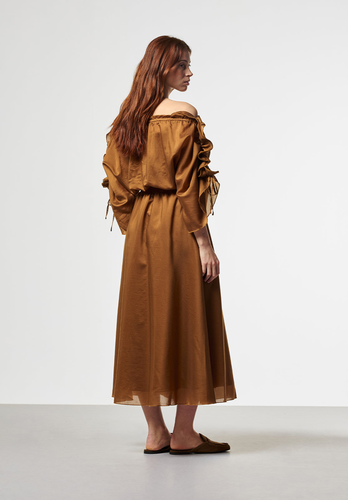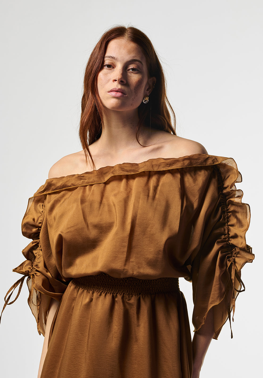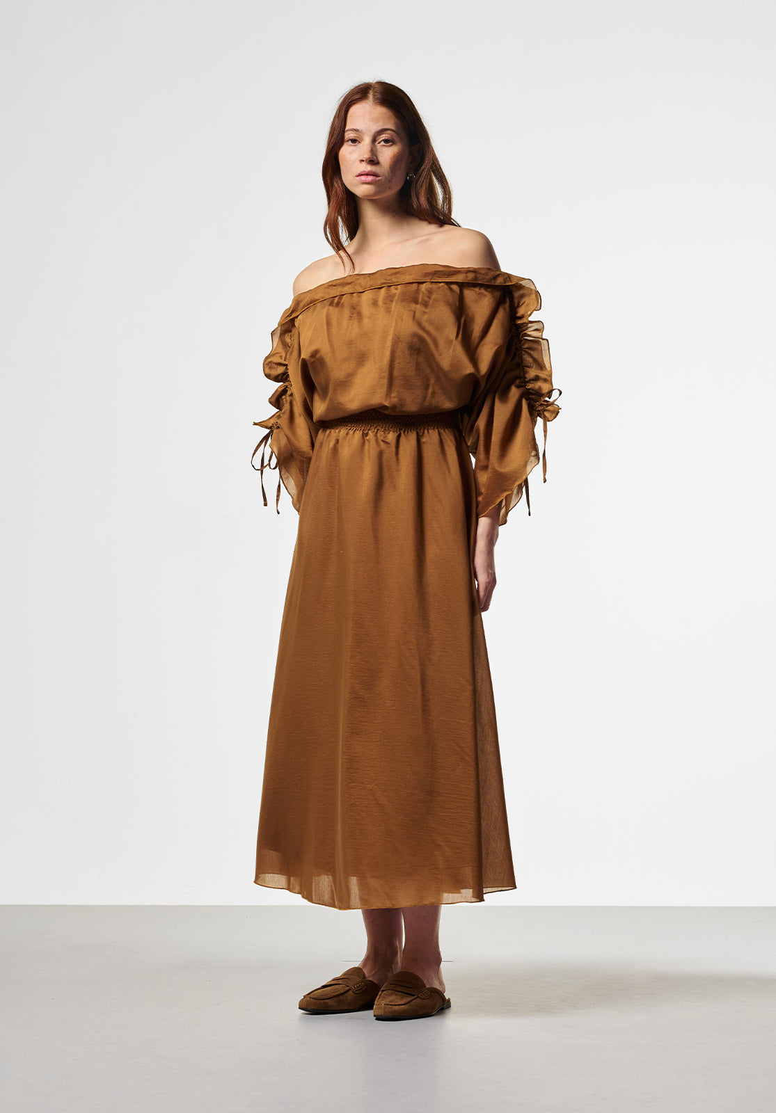 Deze jurk heeft een vrouwelijke en luchtige uitstraling met een subtiel speels karakter. De soepel vallende stof en de gesmokte taille zorgen voor een mooi silhouet, terwijl de off-shoulder halslijn een elegante touch geeft.