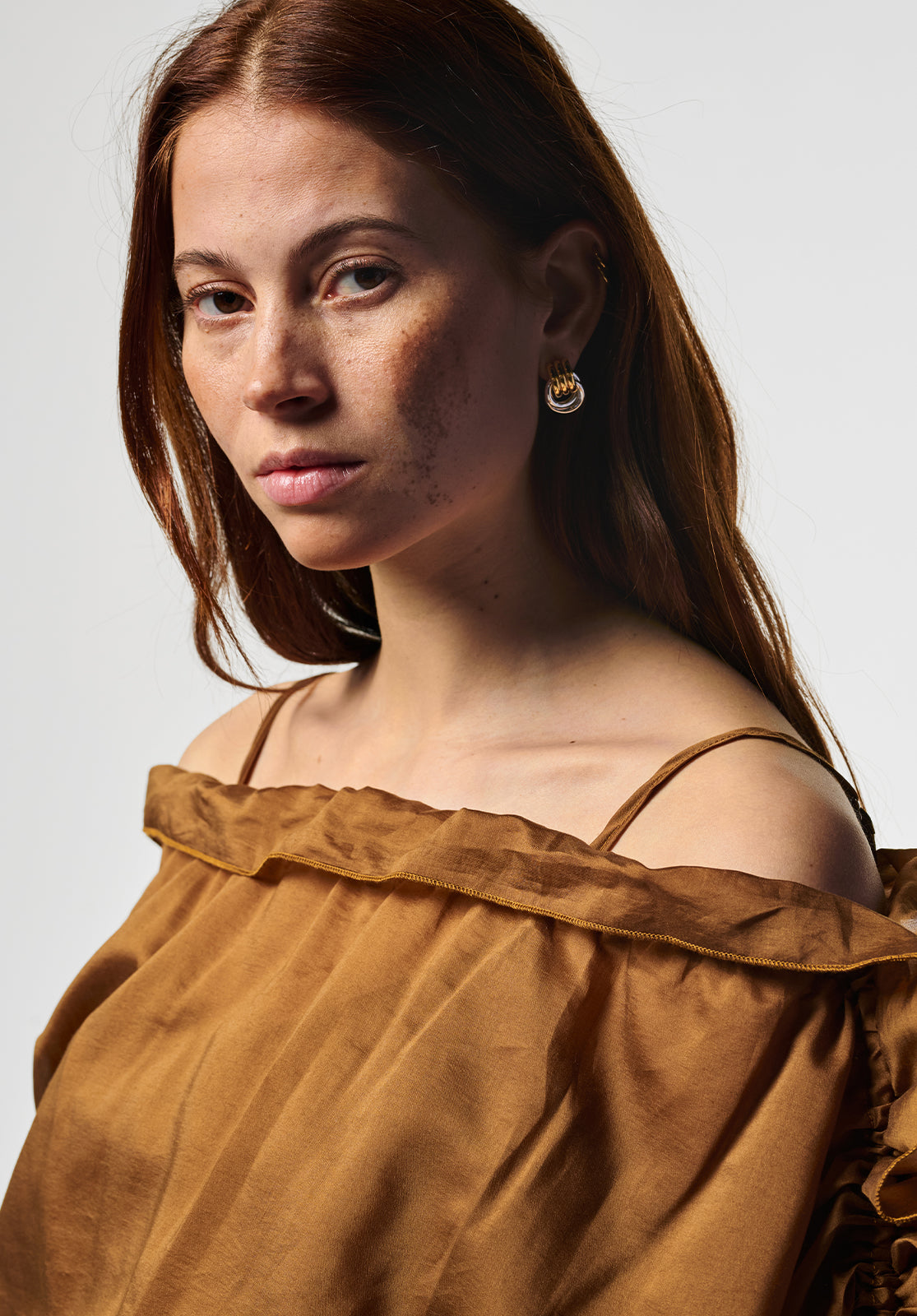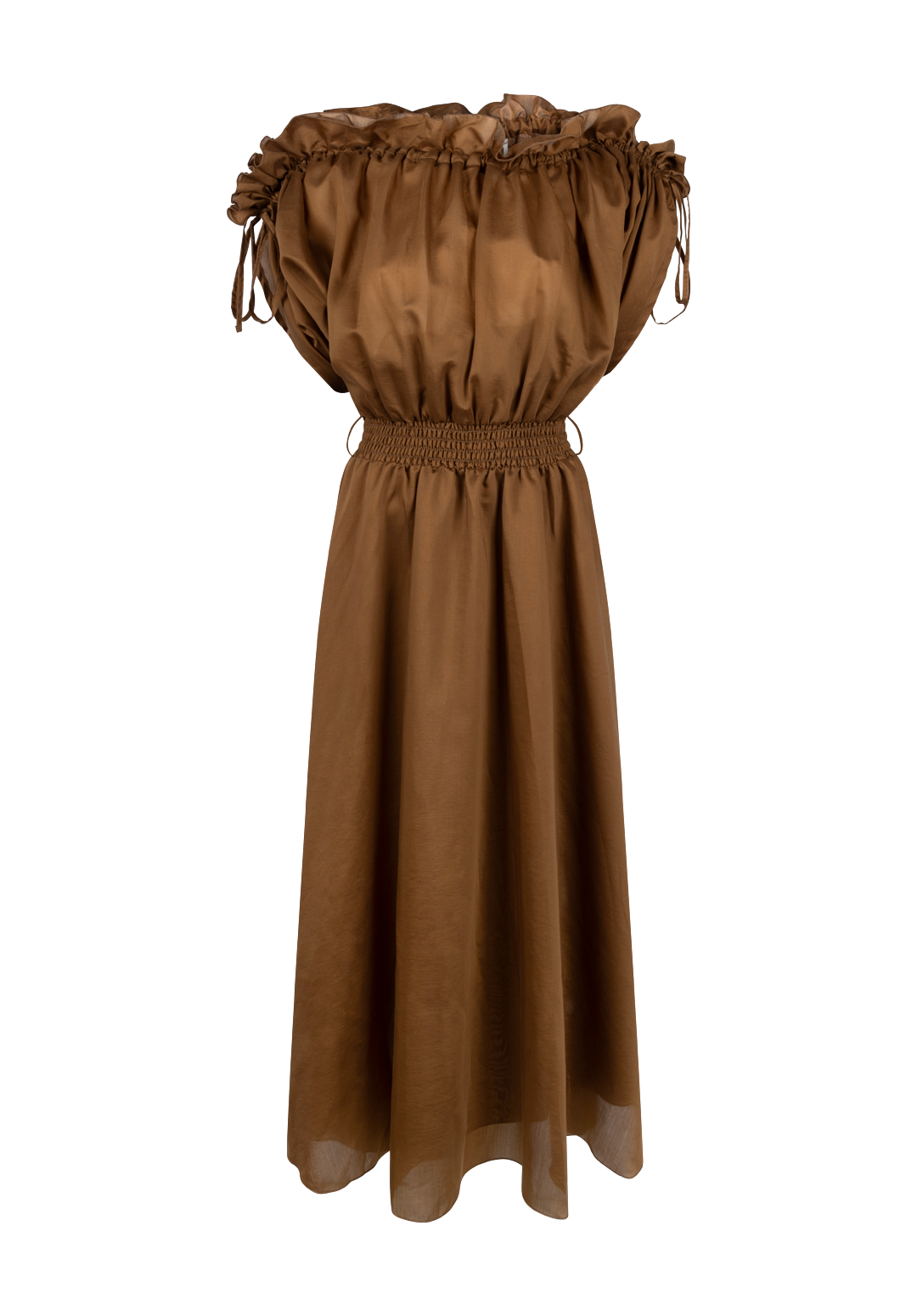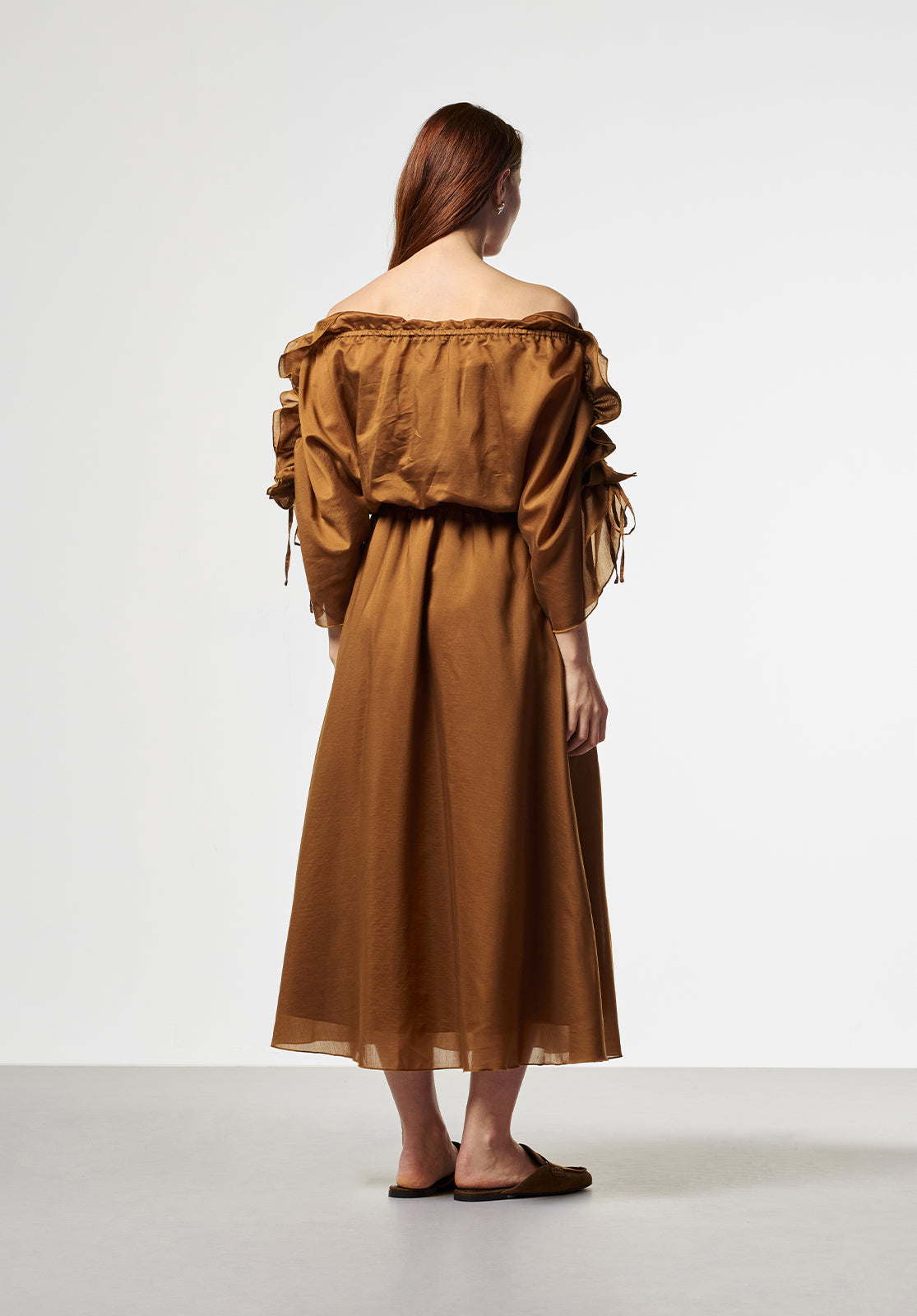 Deze jurk heeft een vrouwelijke en luchtige uitstraling met een subtiel speels karakter. De soepel vallende stof en de gesmokte taille zorgen voor een mooi silhouet, terwijl de off-shoulder halslijn een elegante touch geeft.
