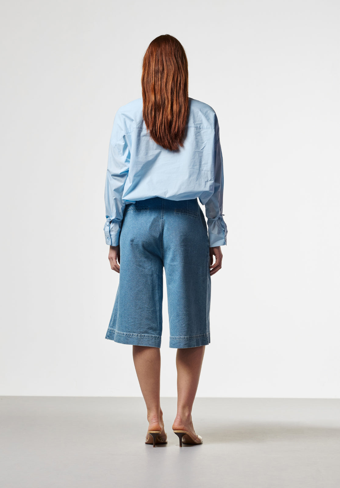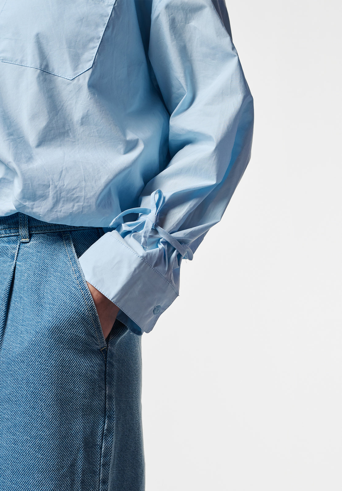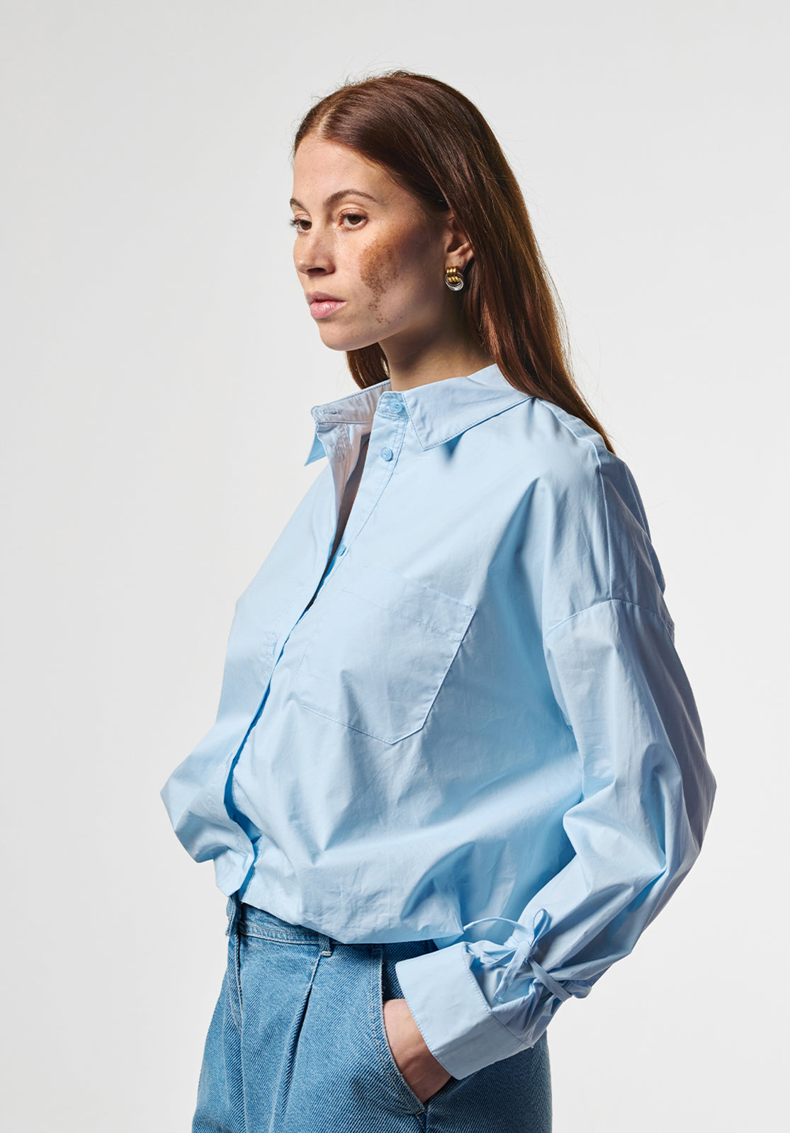 De Mikkie Blouse is een luchtige poplin blouse met een casual fit en klassieke kraag. De mouwen zijn afgewerkt met smalle strikkoorden bij de manchetten, wat zorgt voor een subtiel detail. Dankzij de rechte snit valt de blouse losjes om het lichaam en is hij makkelijk te combineren. Draag met de Sacha Barrel jeans voor een relaxed everyday look.