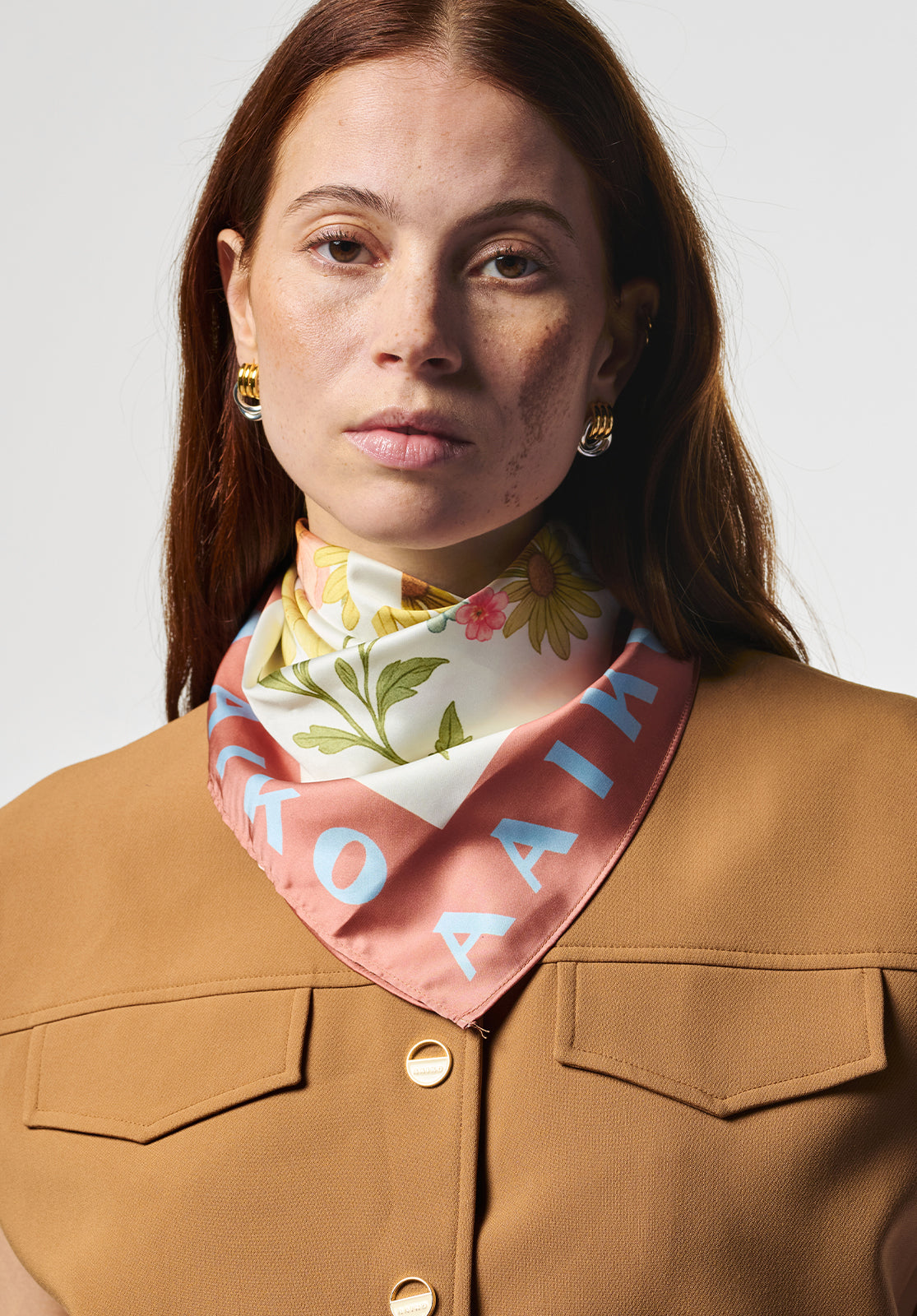 Deze sjaal is een vierkante sjaal met een all-over bloemenprint, afgewerkt met een opvallende rand en het Aaiko logo. Gemaakt van een gladde, glanzende stof die comfortabel draagt en mooi valt. Draag losjes om je hals, om je heup of geknoopt aan je tas voor een speelse touch.