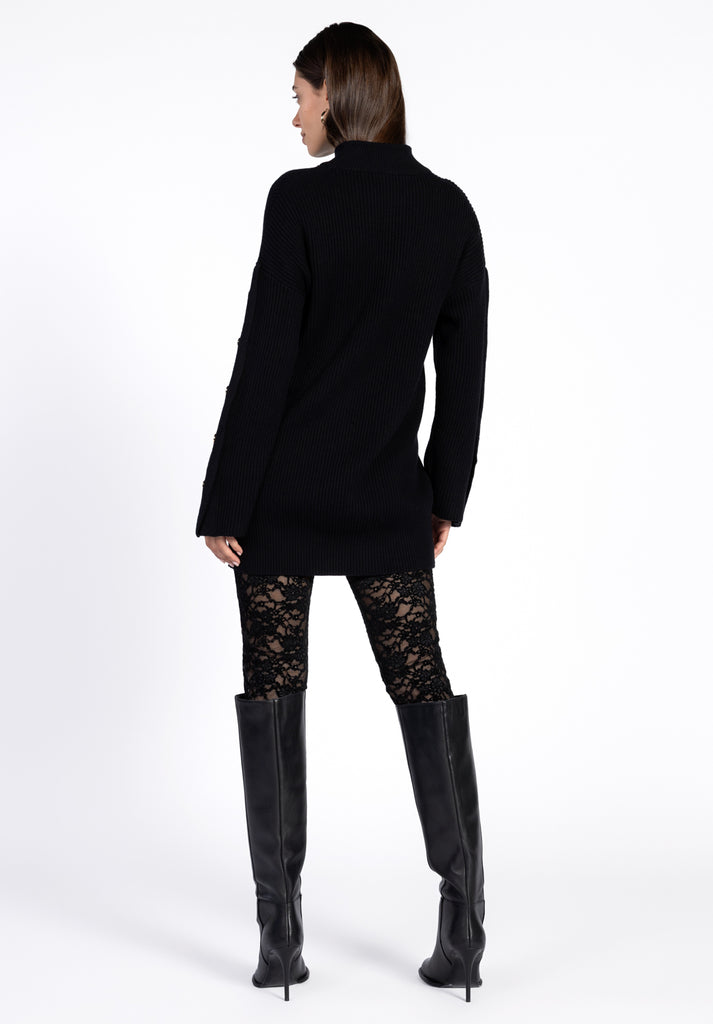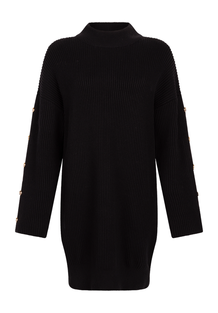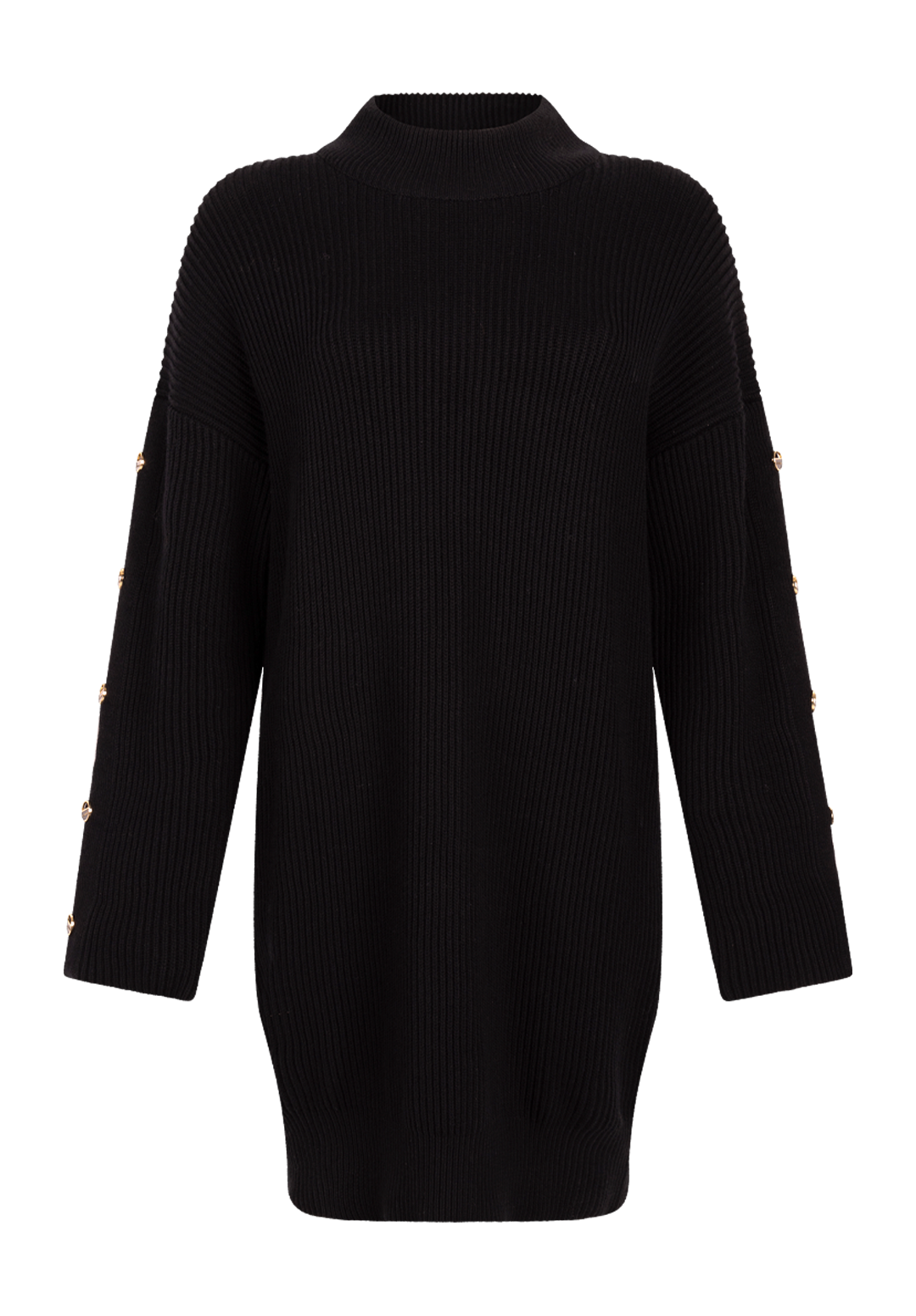 De Brianna jurk is uitgevoerd in een diepe zwarttint en gemaakt van een stevige ribgebreide stof die comfort en stijl moeiteloos combineert. De rechte pasvorm met opstaande hals zorgt voor een clean silhouet, terwijl de gouden knoopdetails op de mouwen een subtiele twist toevoegen. Stijl af met legging Valerina.