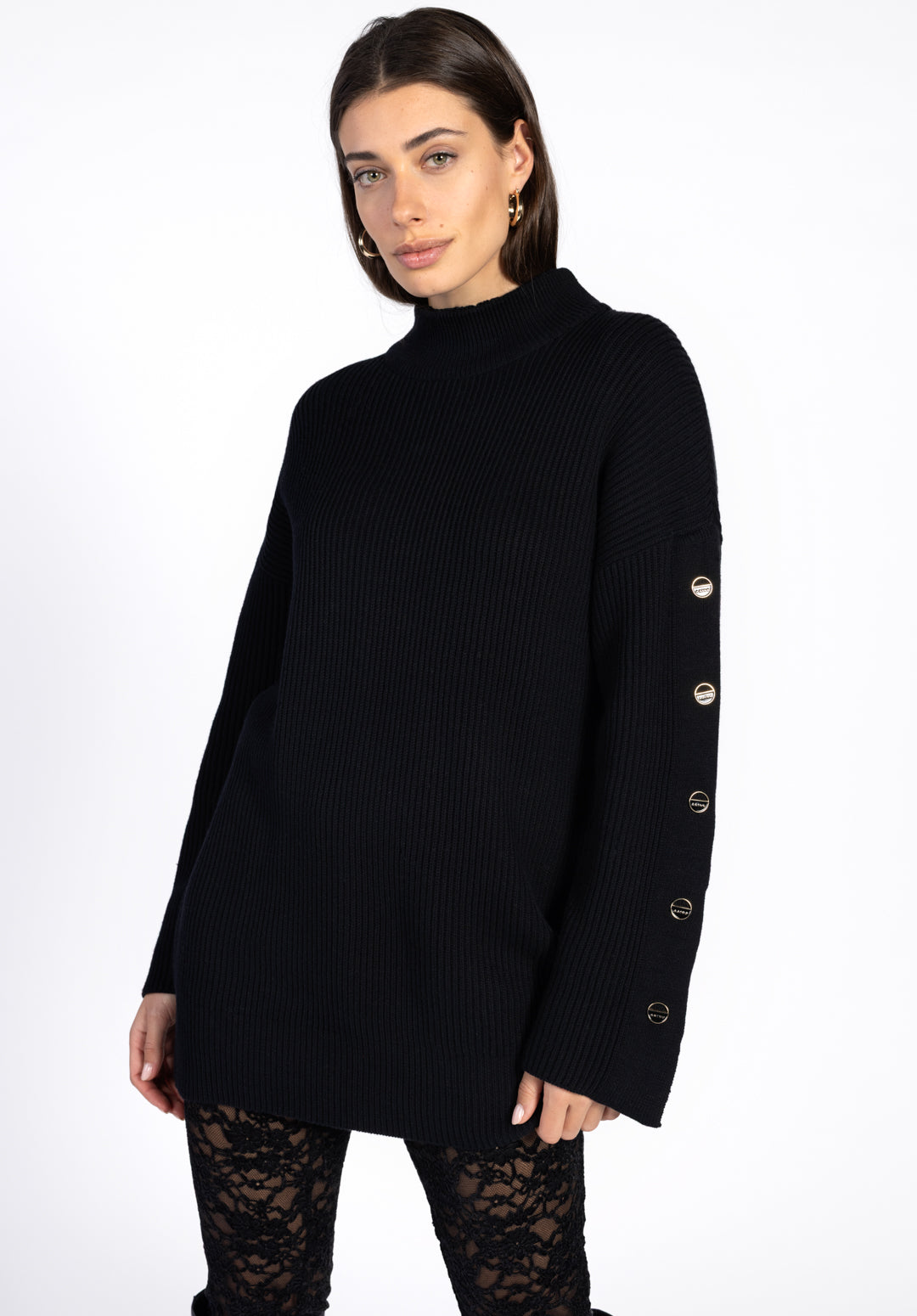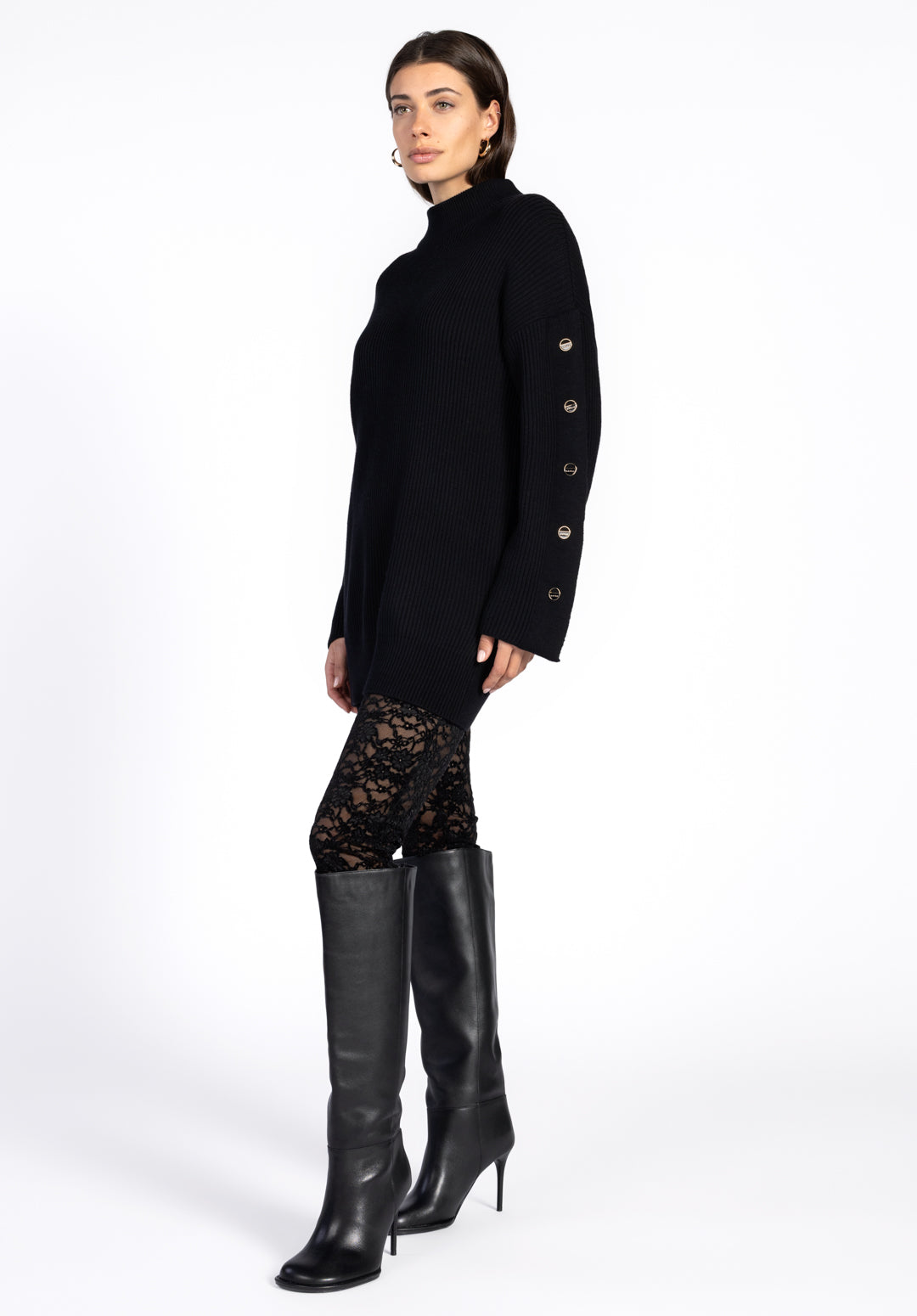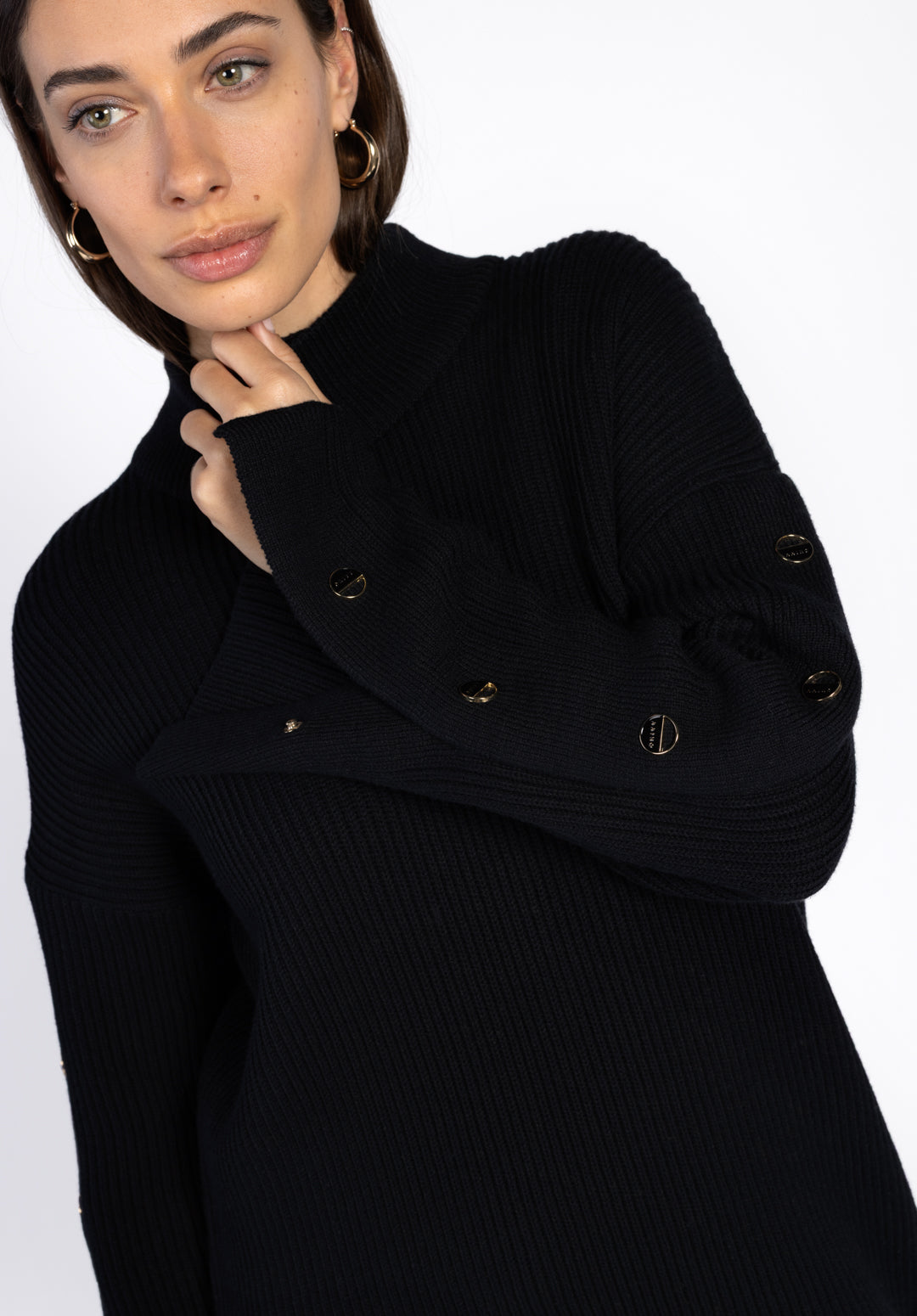 De Brianna jurk is uitgevoerd in een diepe zwarttint en gemaakt van een stevige ribgebreide stof die comfort en stijl moeiteloos combineert. De rechte pasvorm met opstaande hals zorgt voor een clean silhouet, terwijl de gouden knoopdetails op de mouwen een subtiele twist toevoegen. Stijl af met legging Valerina.