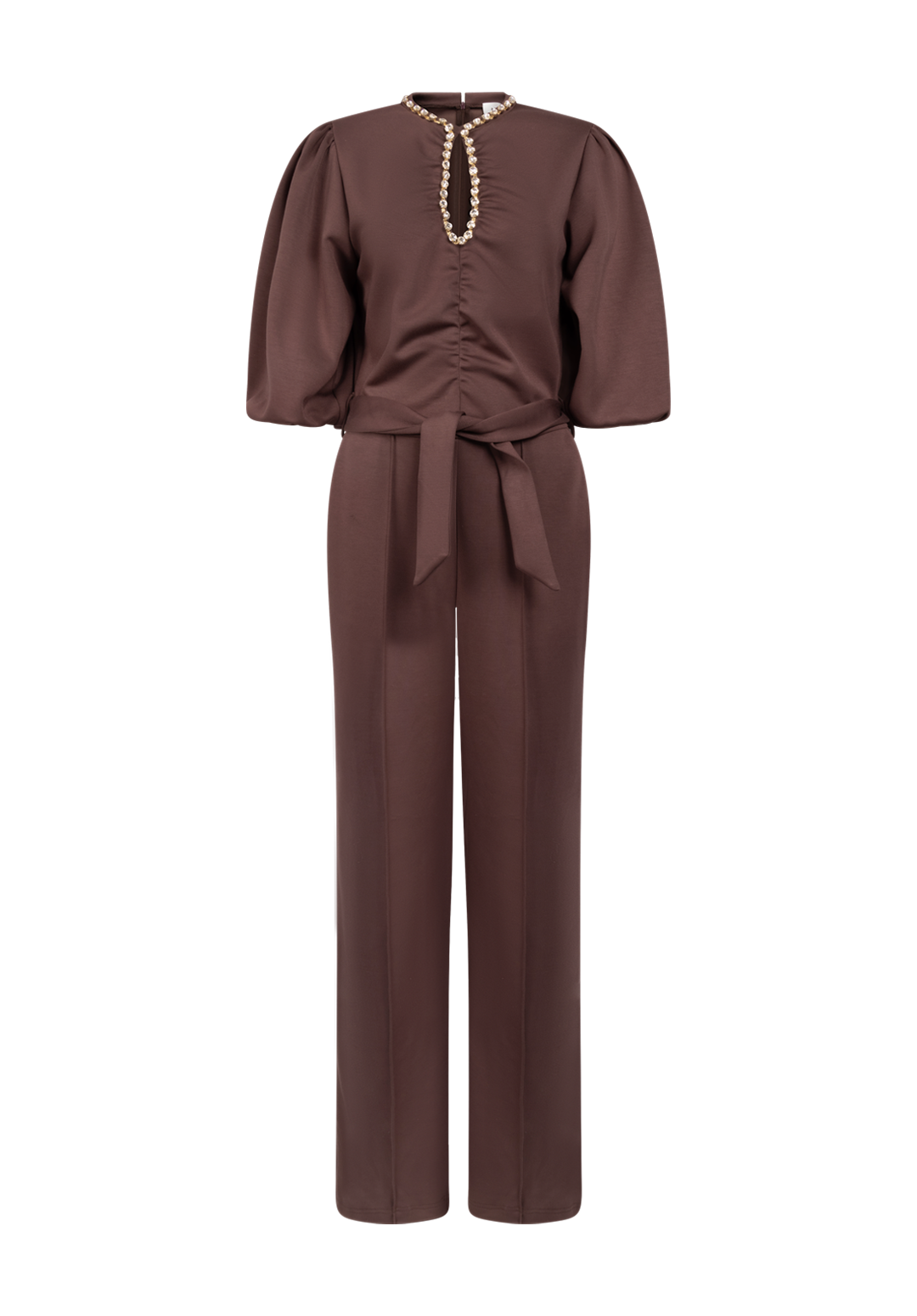 Jumpsuit Gina heeft een flatterende, aangesloten taille met strikceintuur en wijde pijpen. De halslijn heeft een key-hole opening en is afgewerkt met glinsterende sierstenen. De volumineuze halflange mouwen geven de look een romantisch accent, terwijl de soepele stof mooi met je meebeweegt. Perfect voor feestelijke avonden of een chique dinerdate.
