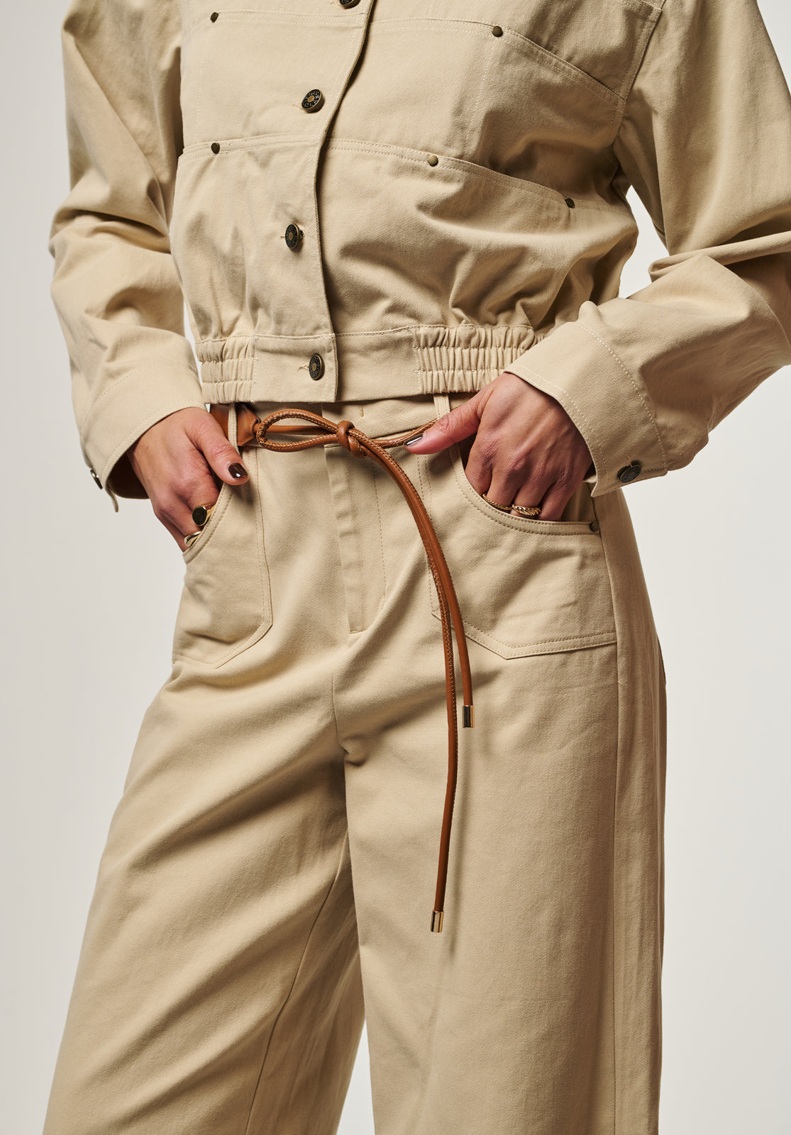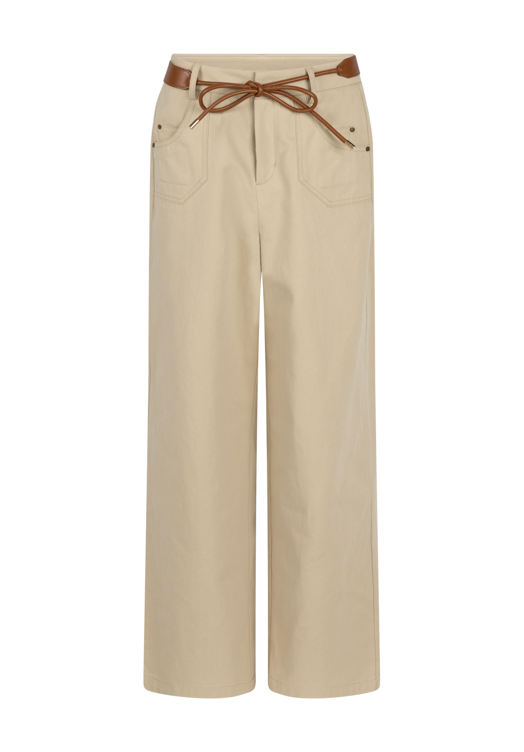 Deze broek is uitgevoerd in een stevige, comfortabele stof en heeft een wijde, rechte pijp voor een elegante uitstraling. De hoge taille wordt geaccentueerd door een strikceintuur, wat zorgt voor een vrouwelijk silhouet. De opgestikte zakken geven een subtiel stoer detail. Goed te combineren met de Fallon voor een complete en stijlvolle set.