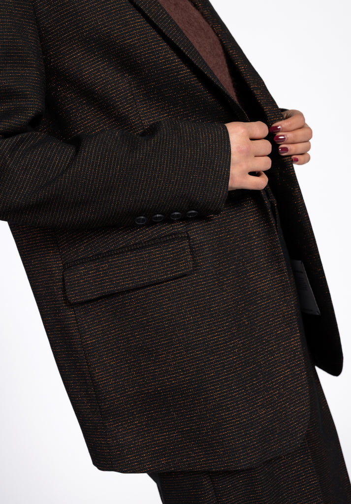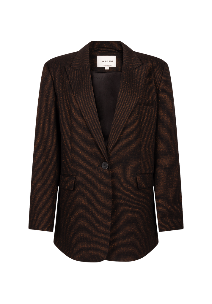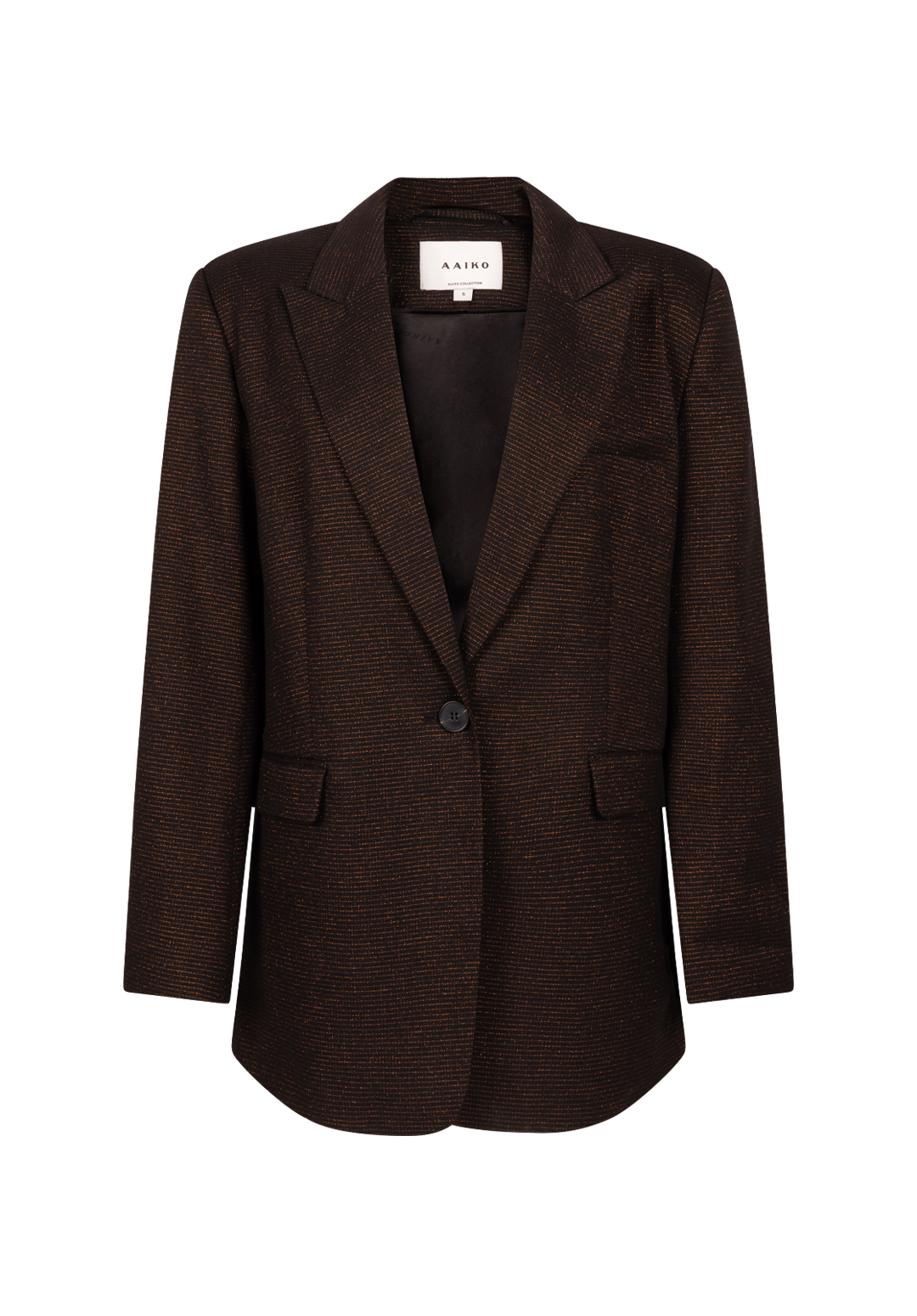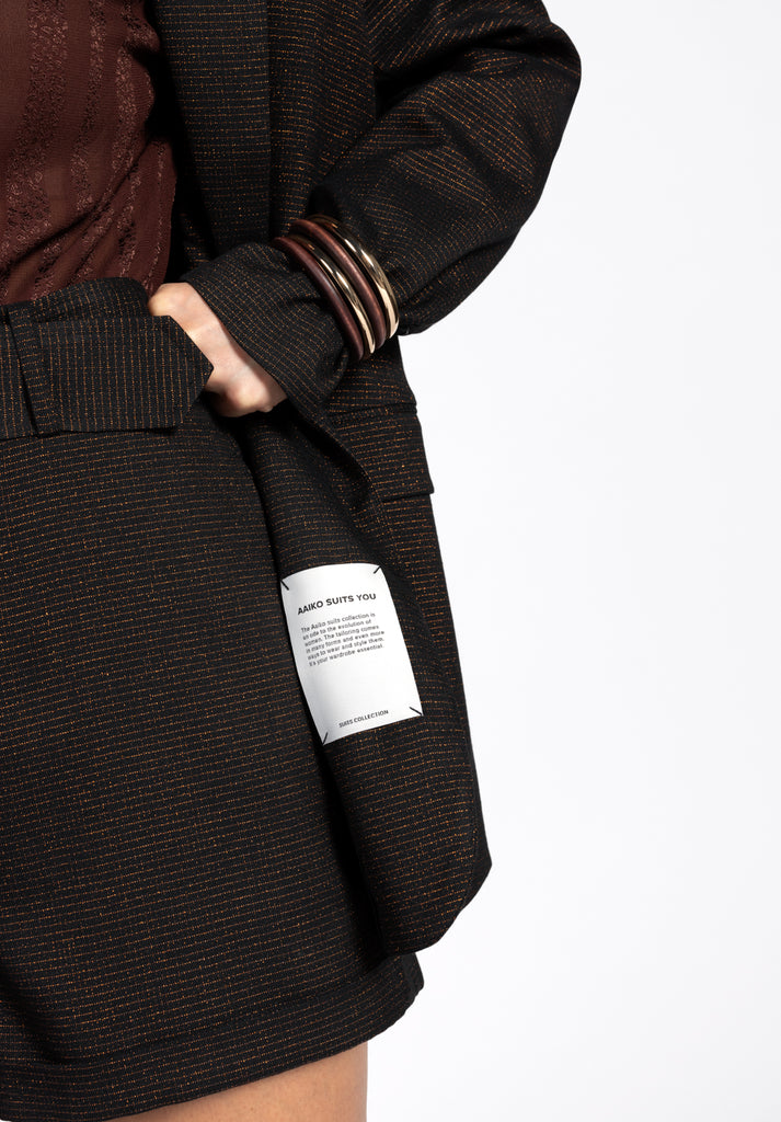De Kendal blazer is uitgevoerd in een recht, licht oversized silhouet met een enkele knoopsluiting en klassieke revers. De fijngeweven ruit met subtiele metallic draad geeft het jasje een verfijnde twist, zonder zijn tijdloze karakter te verliezen. De zwarte basis met koperkleurige accenten maakt het een stijlvol item dat moeiteloos combineert met zowel de bijpassende Nore pantalon of bijpassende Lano shorts.