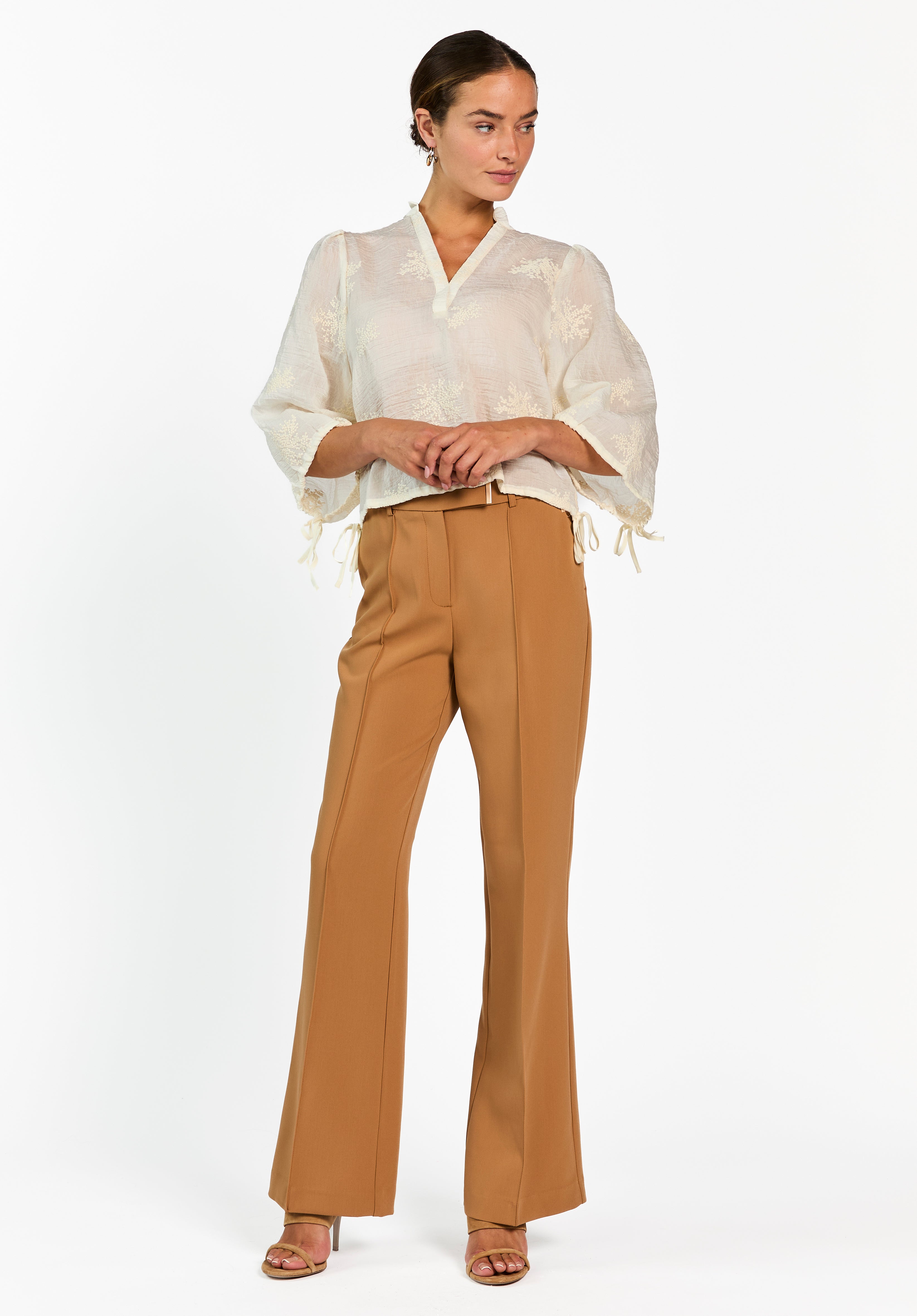 Deze blouse is uitgevoerd in een luchtige stof met subtiel geborduurde details voor een verfijnde uitstraling. Het model heeft een opstaande kraag met een V-hals en wijde mouwen tot net over de elleboog. De strikdetails aan de zijkanten geven een speelse en vrouwelijke touch. Perfect voor een elegante, zomerse look.