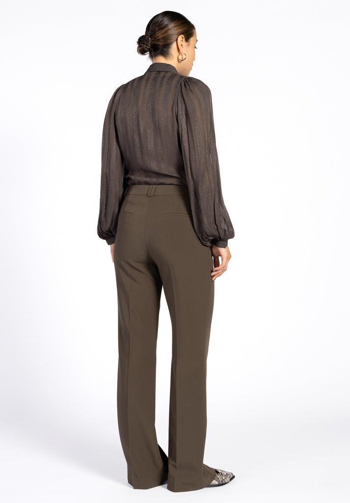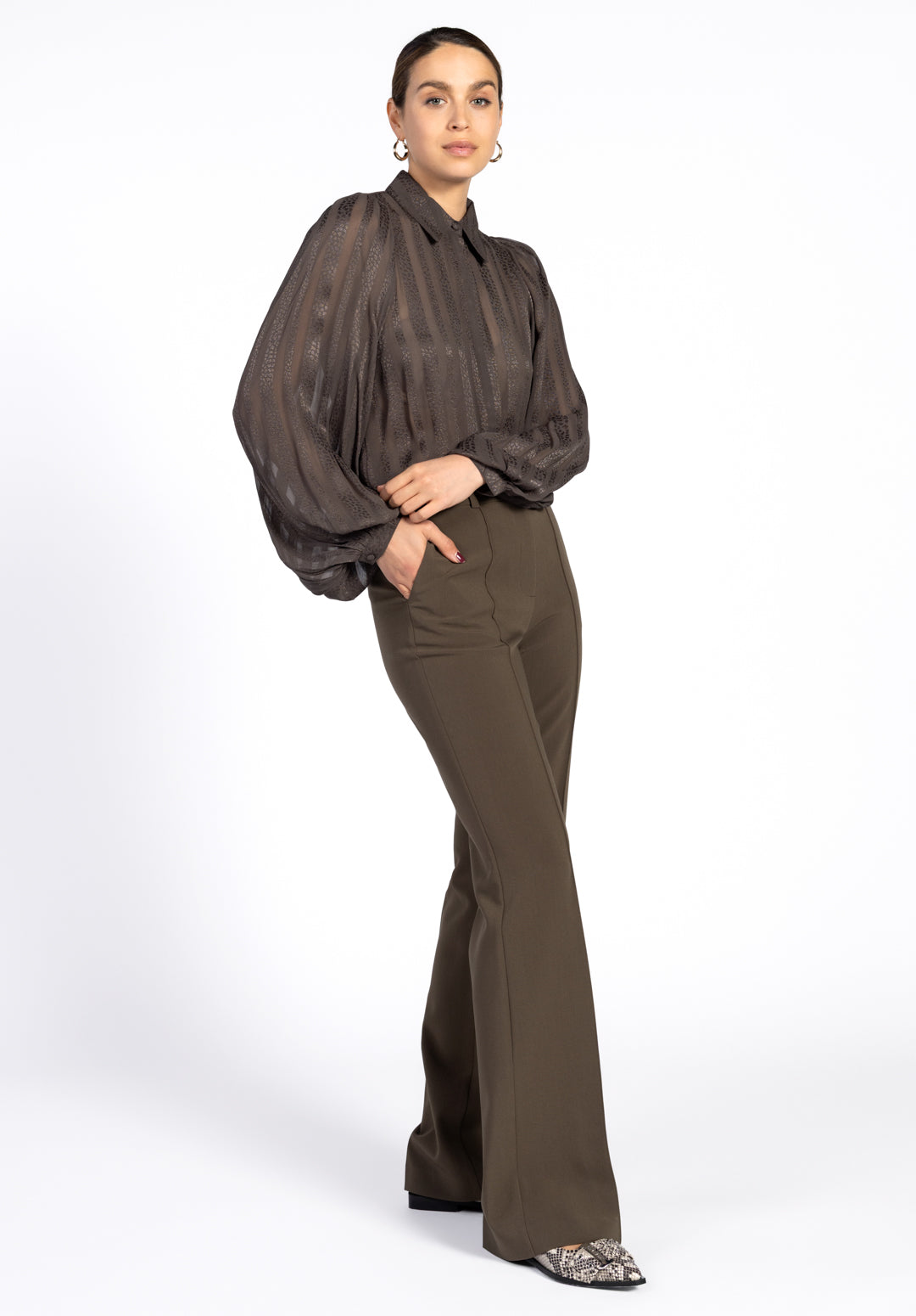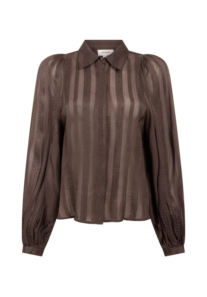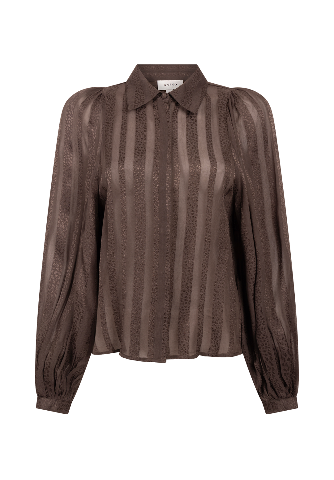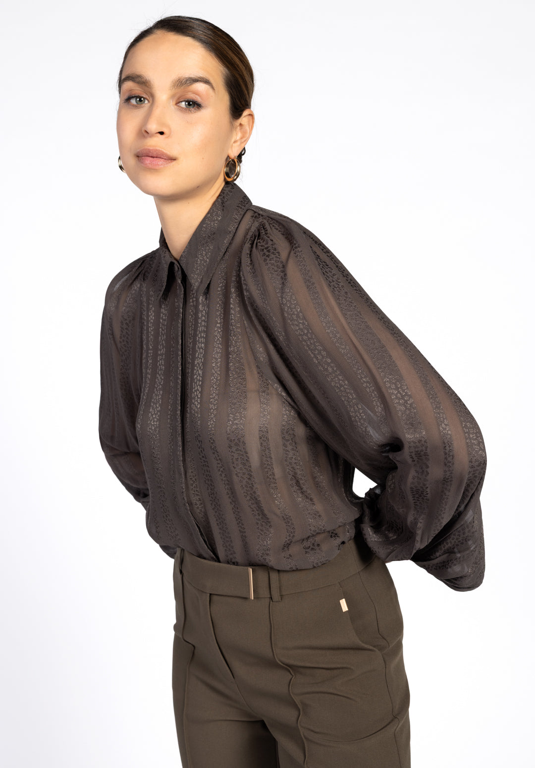 De Rose blouse is een transparant ontwerp met speelse verticale banen. De glanzende structuur van de banen zorgen voor een subtiel spel van licht en beweging. De combinatie van klassieke kraag en pofmouw maken dit item perfect voor zowel een office look als een dinerdate. Combineer met broek Chantalle.