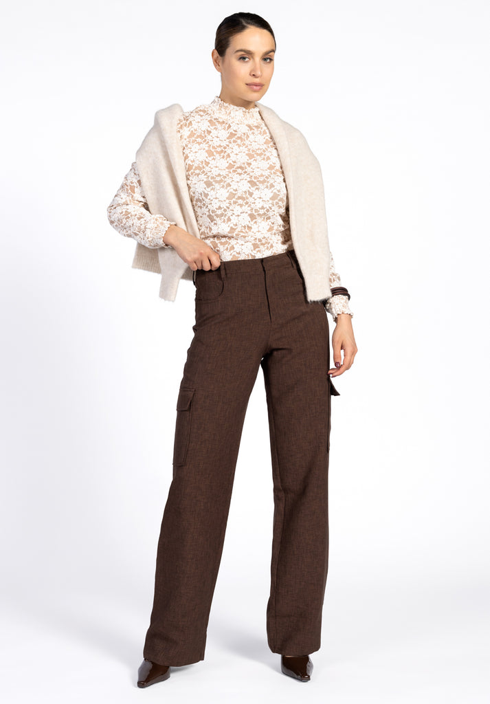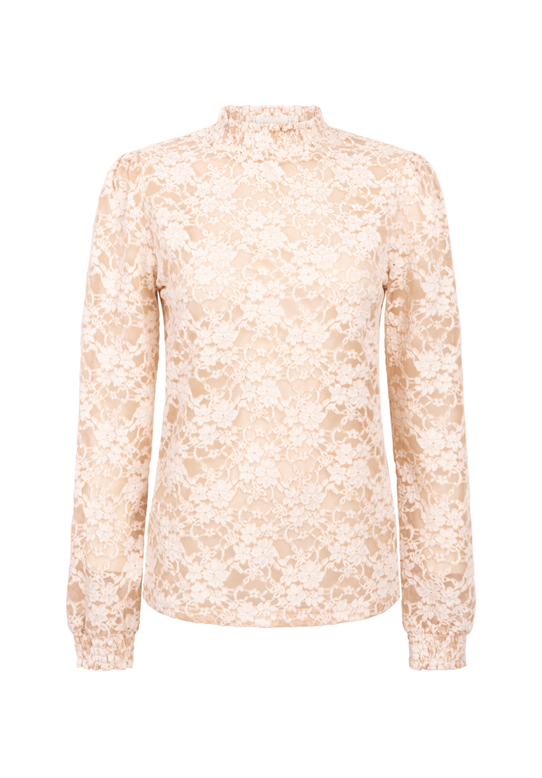 De Tory Lace Top is een verfijnde crèmekleurige longsleeve, uitgevoerd in een semi-transparante kanten stof. De hoge halslijn en licht gepofte mouwen geven het item een vrouwelijke en moderne uitstraling. Combineer met een mooie bralette of top eronder voor een gedurfde, maar stijlvolle layered look. Makkelijk te combineren met broek Chantalle.