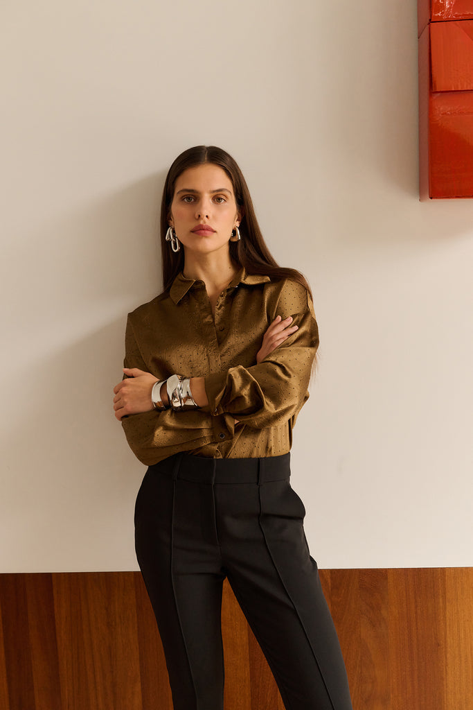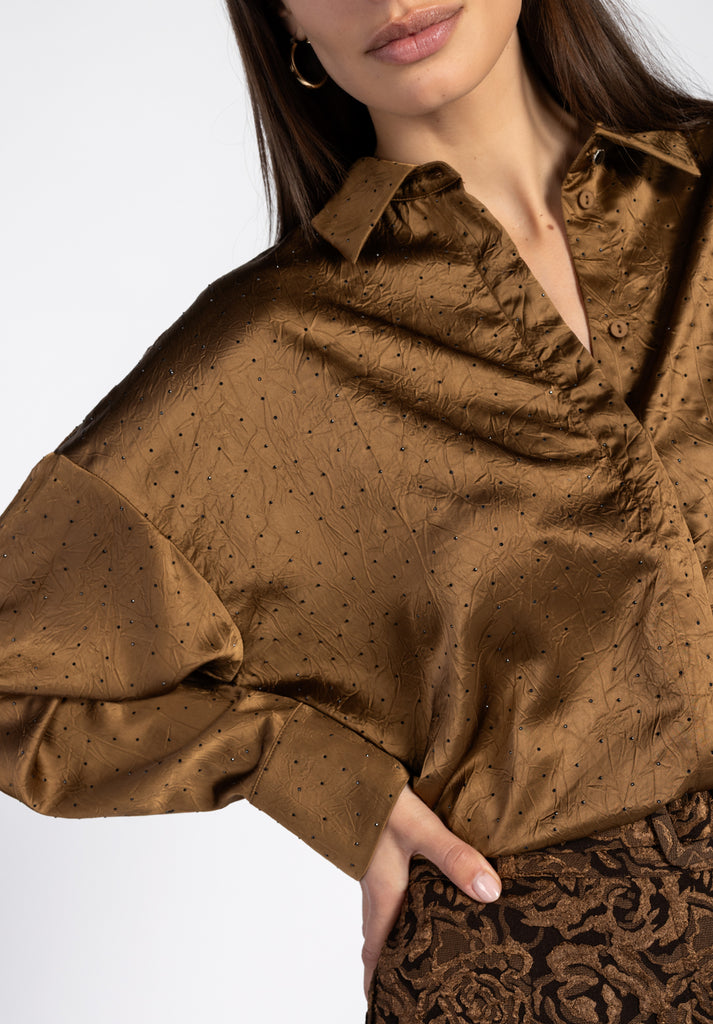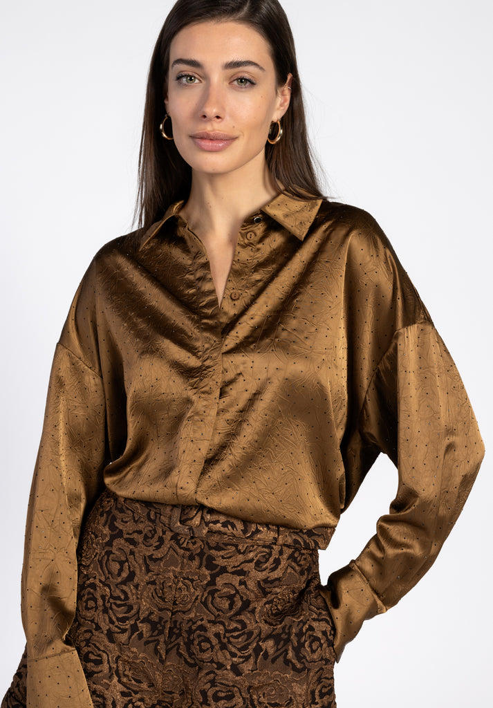 Blouse Violet is uitgevoerd met een subtiele glans en stippenmotief. De blouse valt los bij de oksels en armen. Combineer met shorts Lano voor een feestelijke look of ga juist voor office chic met broek Philippa.