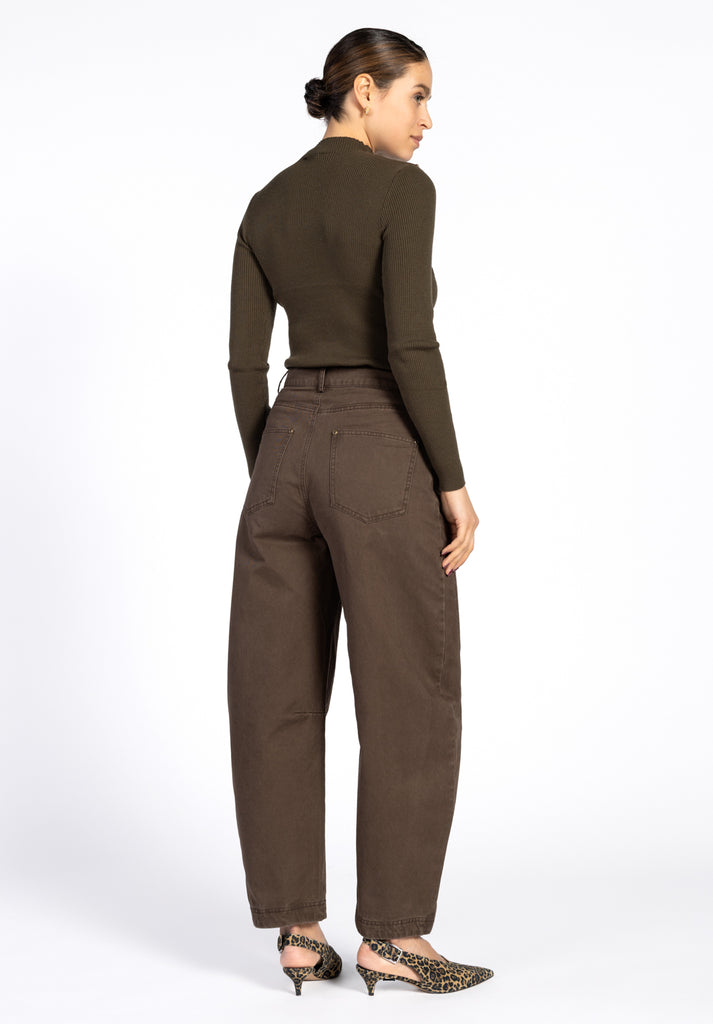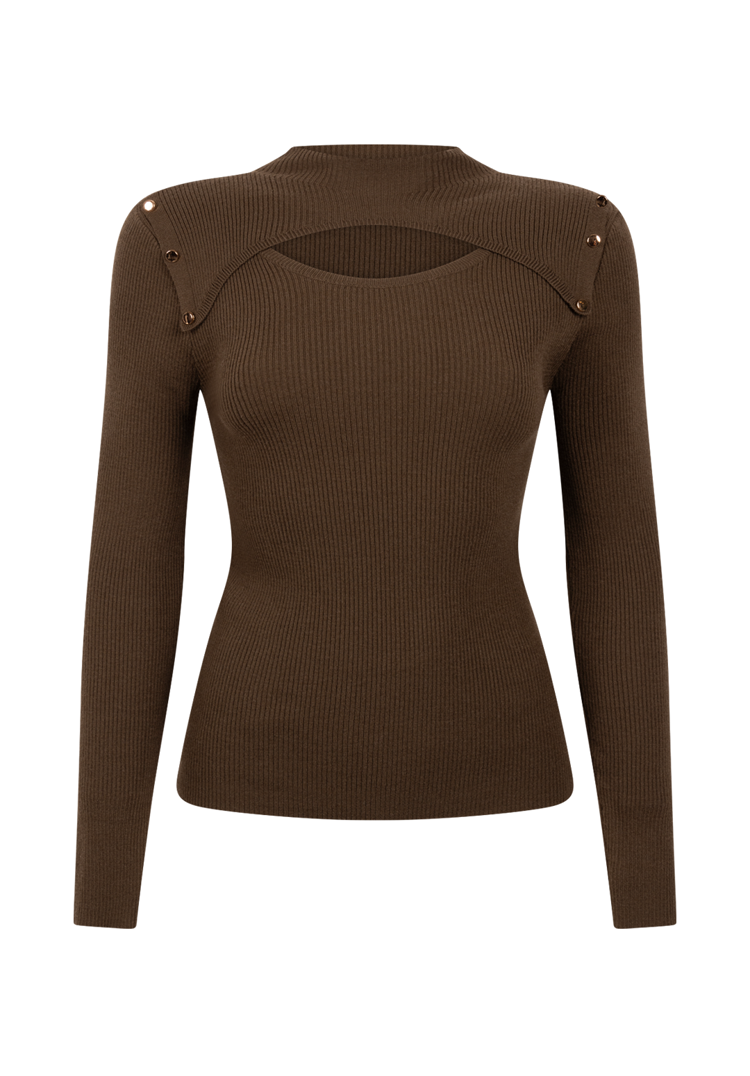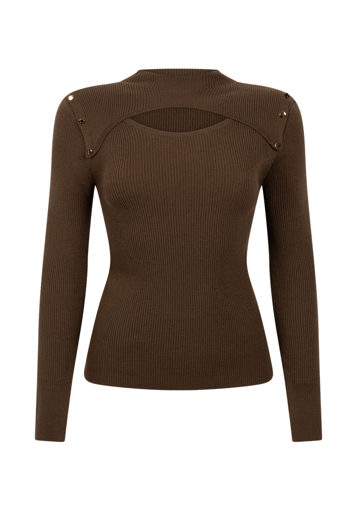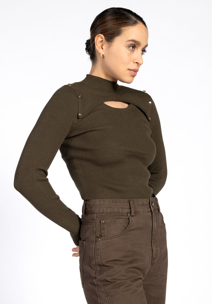 De Zahra Sweater is een eigentijdse knit met een onverwachte twist. Het aangesloten silhouet wordt geaccentueerd door de ribgebreide structuur, terwijl de cut-out op de borst een speelse en vrouwelijke touch toevoegt. Met goudkleurige knoopdetails op de schouders. Perfect voor zowel casual als geklede looks – combineer met high-waist broek Quinn.