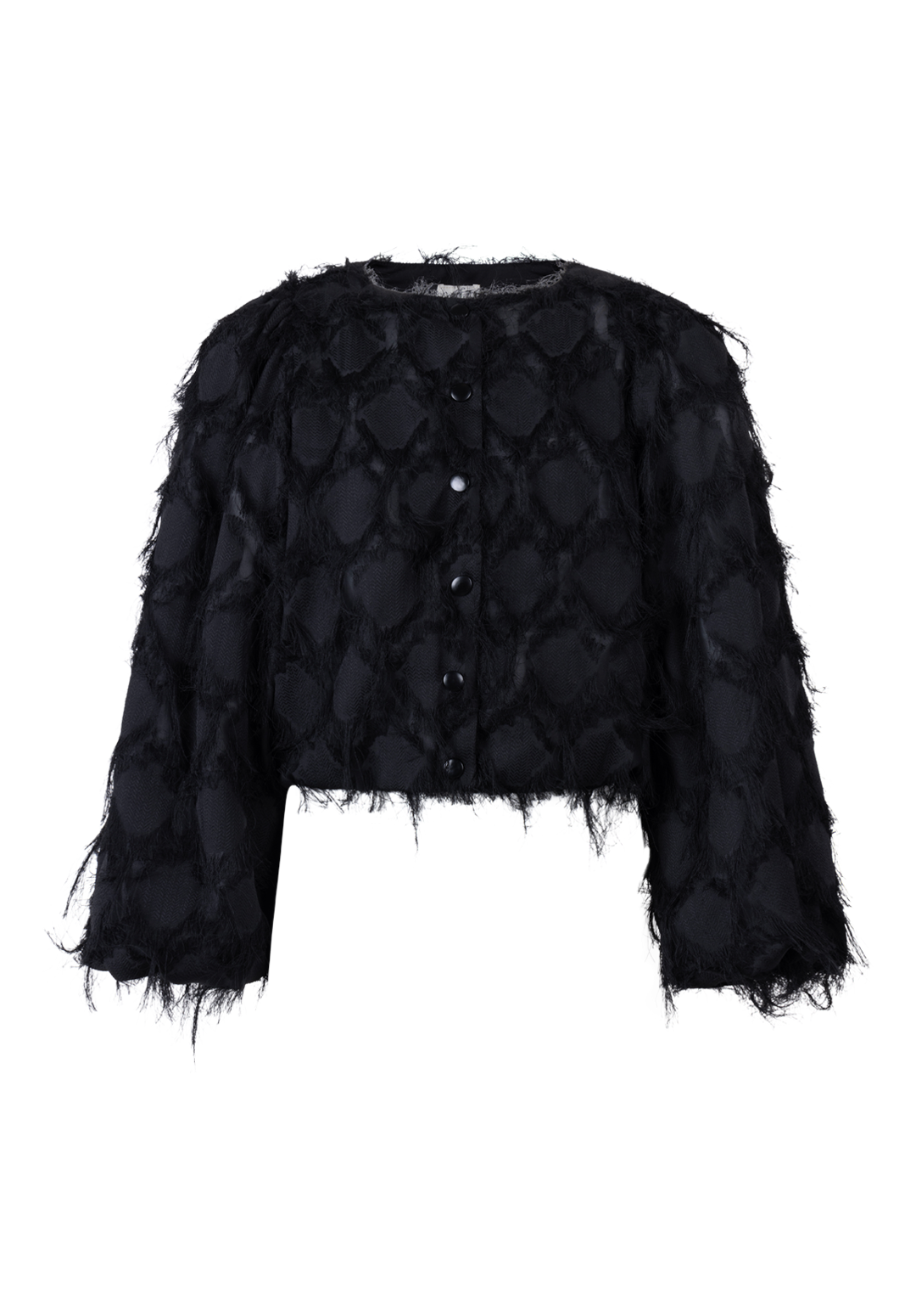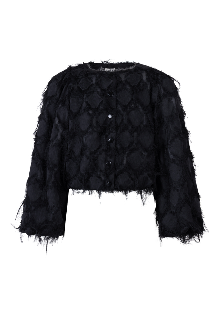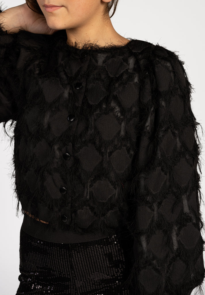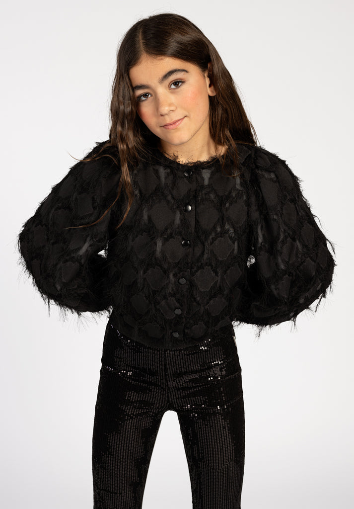 De Evie is een feestelijk statement piece en zowel als top als vest te dragen. De top is versierd met bloemenapplicaties en frankjes. De volumineuze mouwen en subtiele pofschouders geven het geheel een speelse uitstraling. Combineer met legging Craig voor een showstopping feestlook.