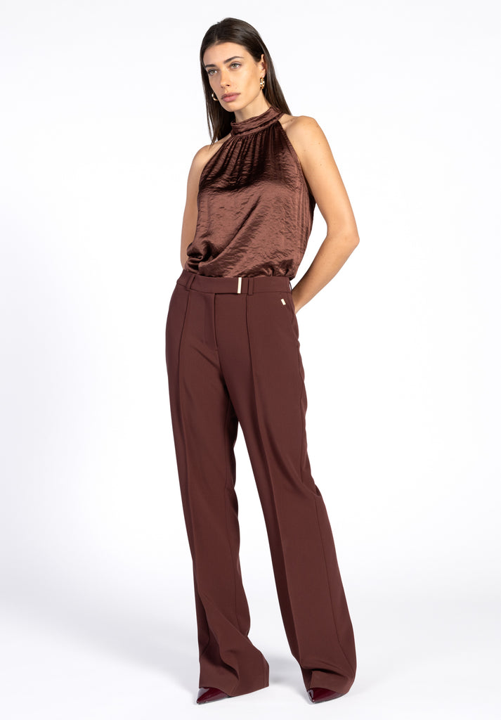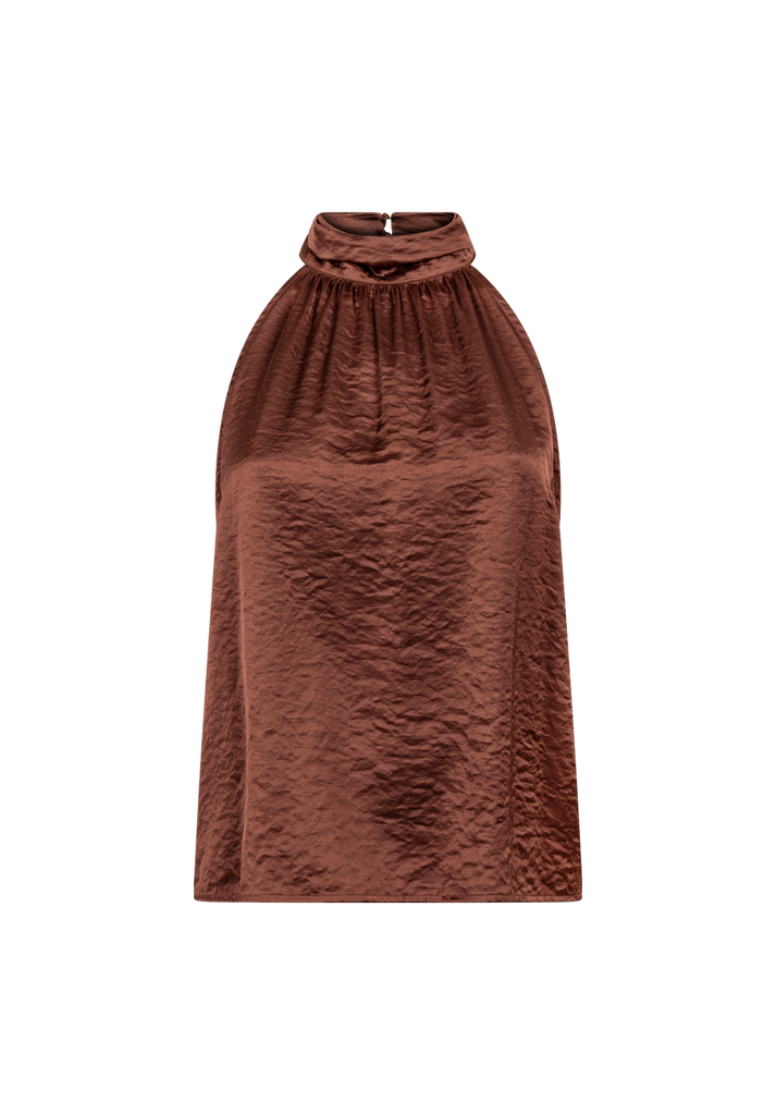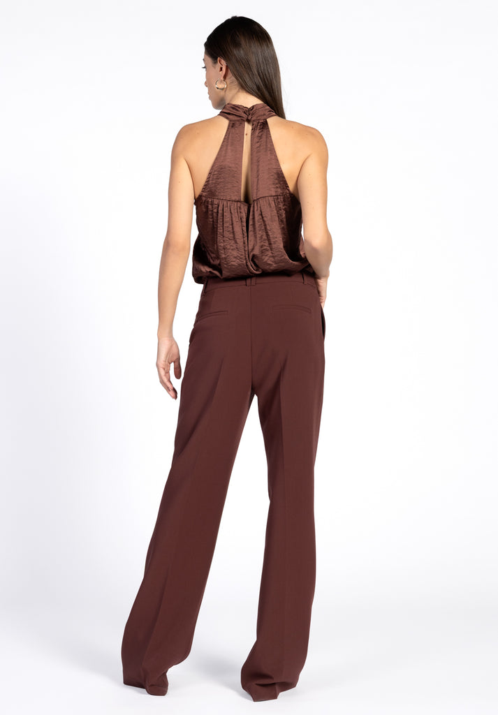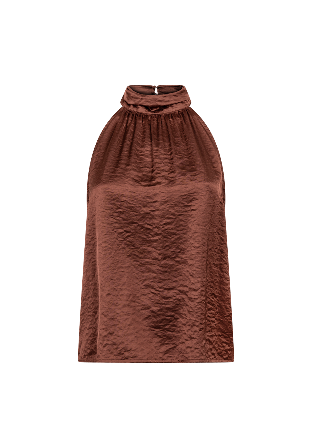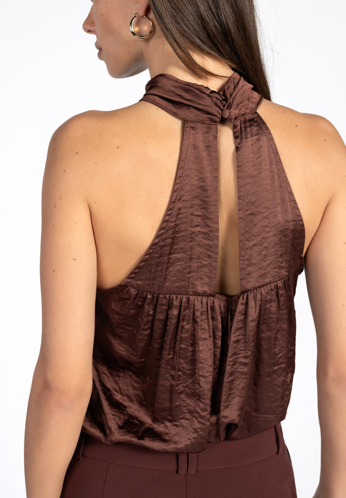 De Irisa top is een verfijnde toevoeging aan je garderobe. De top is gemaakt van een zachte, licht glanzende stof die soepel langs het lichaam valt. Dankzij het haltermodel met hoge kraag en de open rug creëer je een vrouwelijke en elegante look. De rijke chocoladebruine kleur maakt deze top perfect voor zowel overdag als ’s avonds. Draag hem chic ingestopt in de bijpassende Chantalle pantalon of juist losjes op een jeans voor een nonchalante uitstraling.