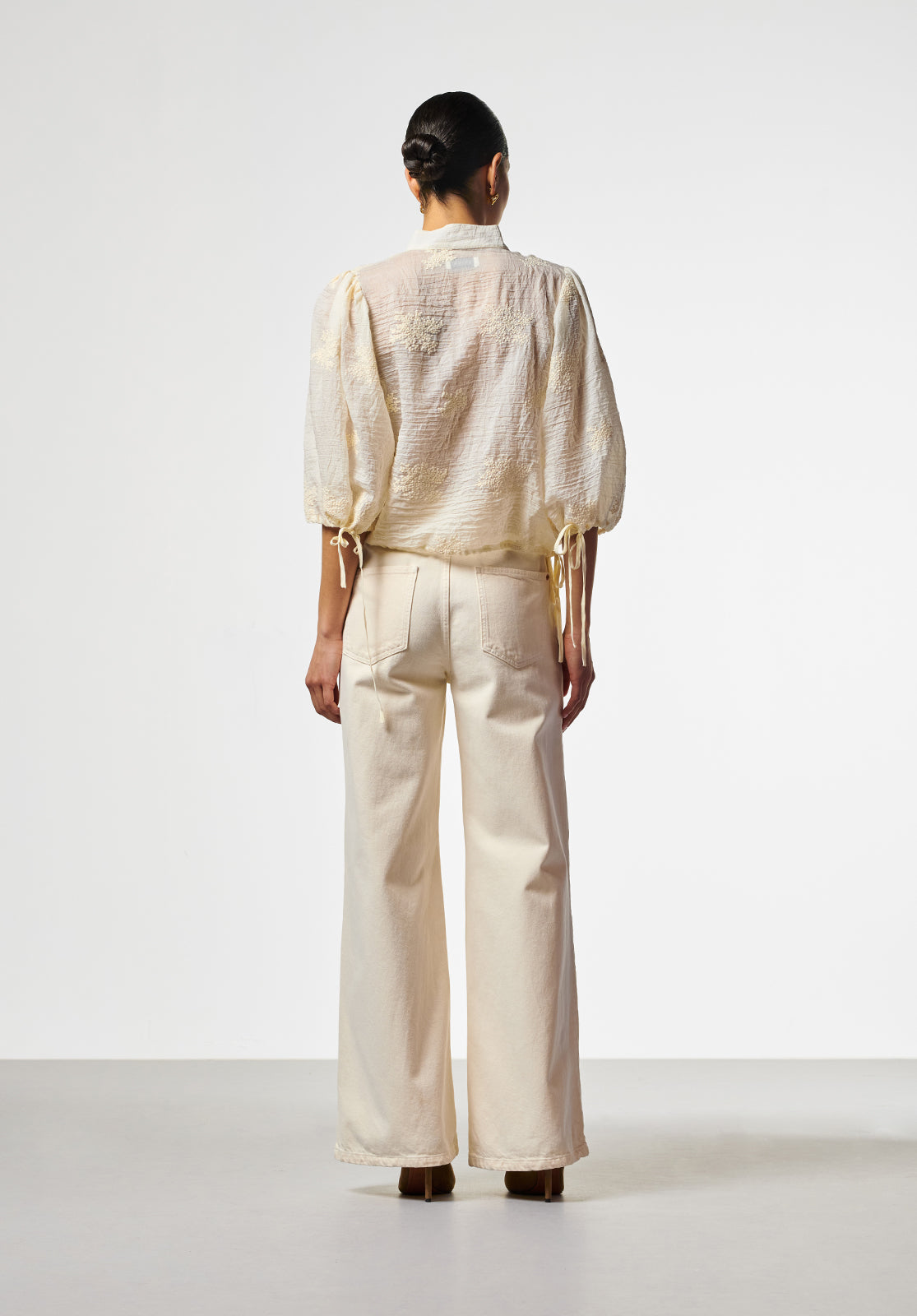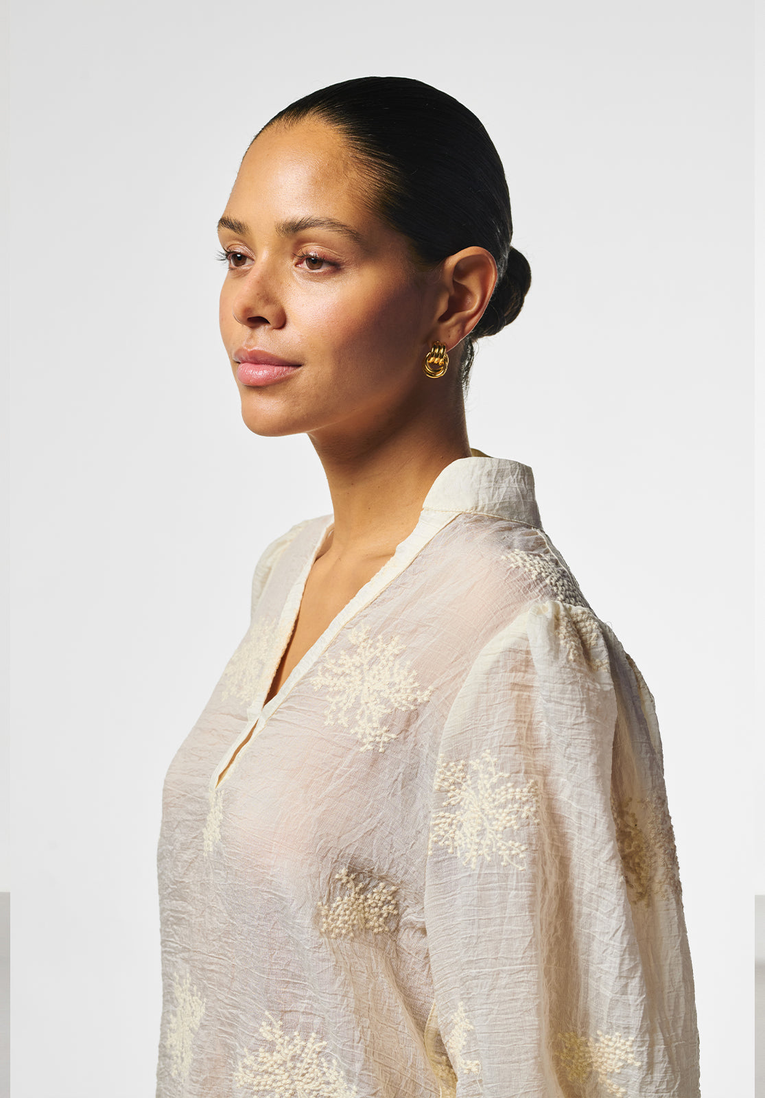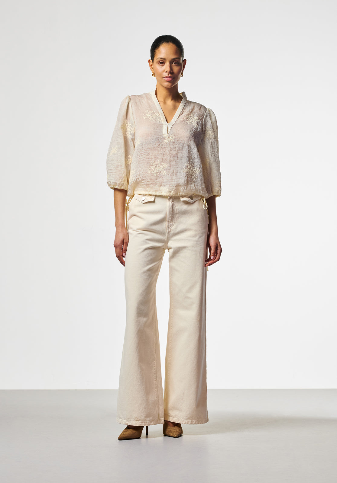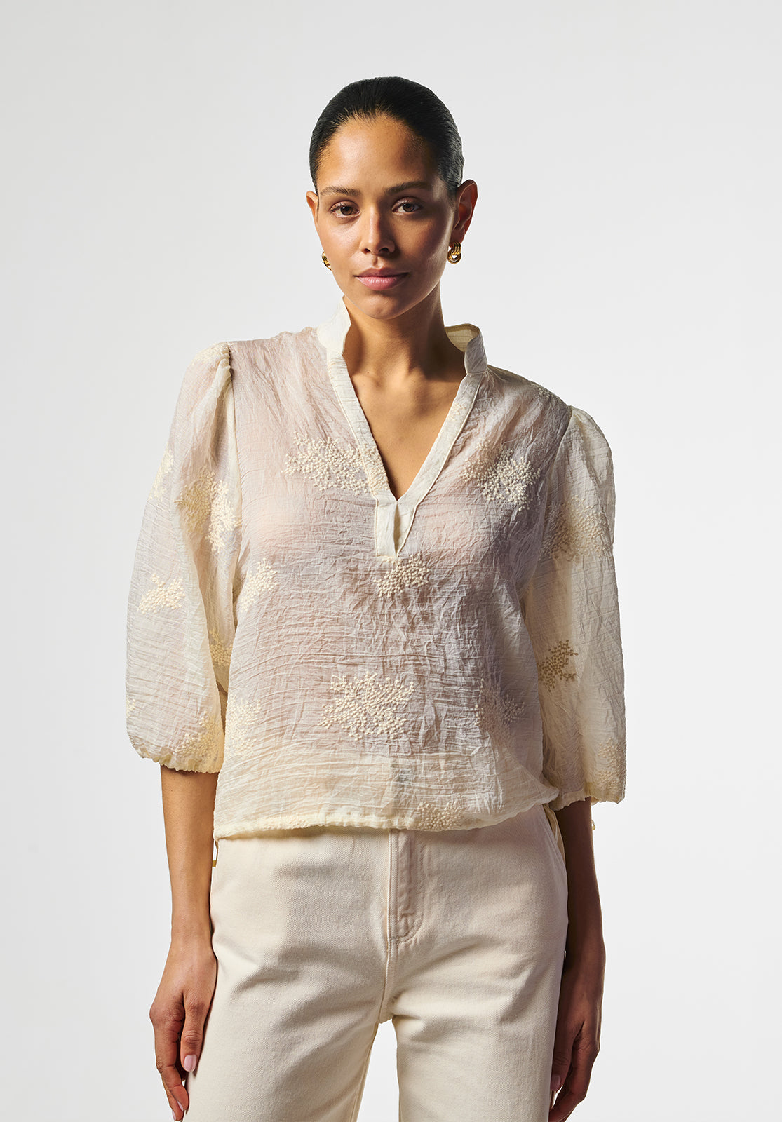 Deze blouse is uitgevoerd in een luchtige stof met subtiel geborduurde details voor een verfijnde uitstraling. Het model heeft een opstaande kraag met een V-hals en wijde mouwen tot net over de elleboog. De strikdetails aan de zijkanten geven een speelse en vrouwelijke touch. Perfect voor een elegante, zomerse look.