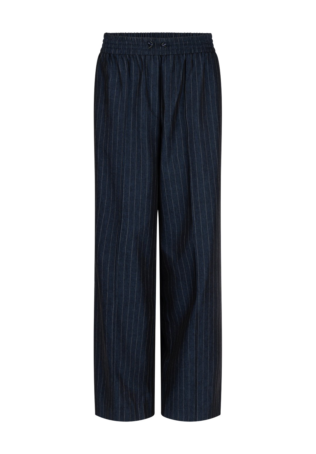 De Esila Broek is een losvallend model met rechte pijpen en een sportieve elastische tailleband met drawstring. Het krijtstreepdesign geeft de broek een meer formele uitstraling, maar de pasvorm maakt ’m juist casual en comfortabel. Gemaakt van een soepele, licht glanzende stof die goed combineert met zowel de Brynn blazer als de Zena top.