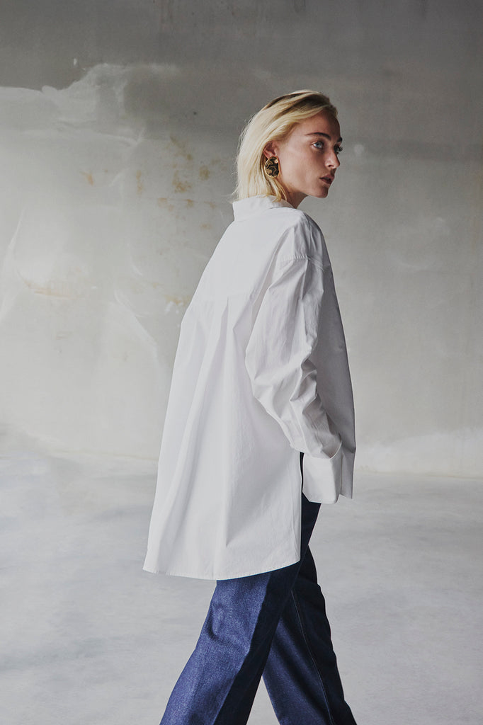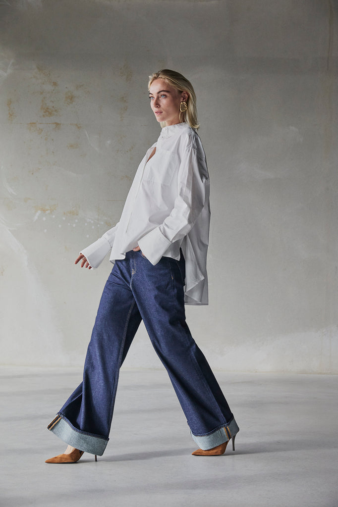This blouse has an oversized fit.