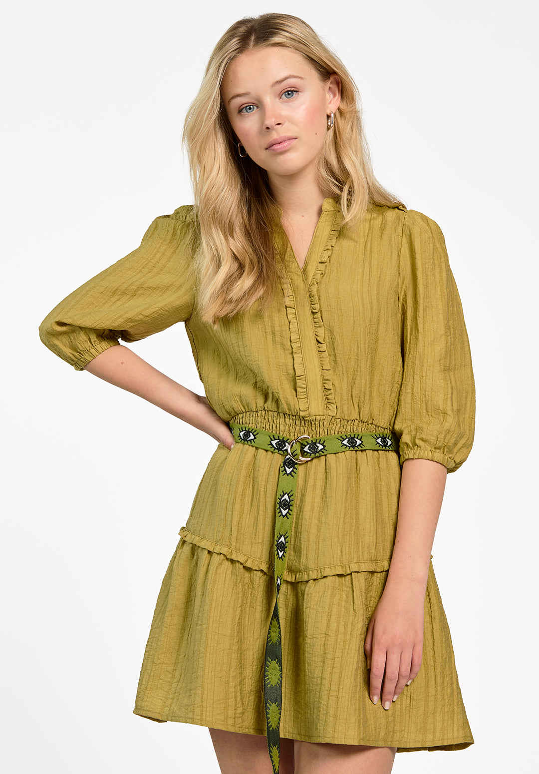 The Pomme dress is a lightweight design with puff sleeves, a playful V-neckline, and a delicate ruffled trim along the front. The waist is softly elasticated, while the skirt features a double-layered design with subtle tiers. Style it with colourful sandals or add a statement belt for an effortless, casual look.