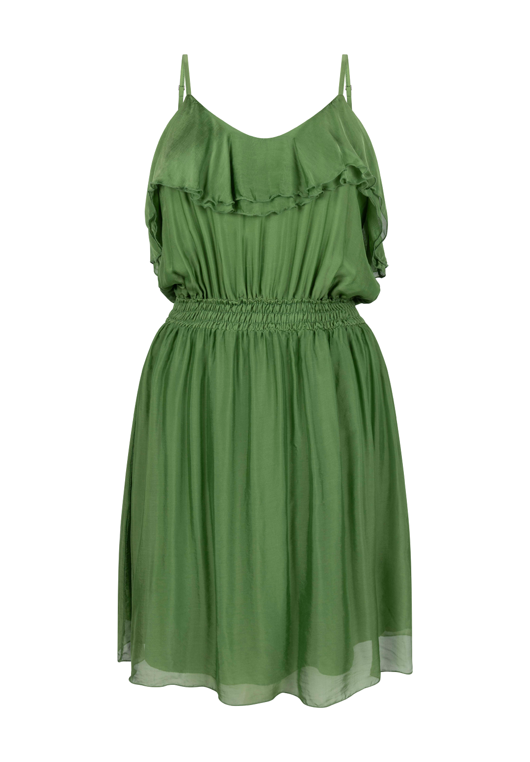 This dress has a romantic and airy look. The flowing fabric and subtle ruffles along the neckline give the design a playful and feminine effect. The narrow shoulder straps and elastic waist ensure a comfortable and flattering fit.