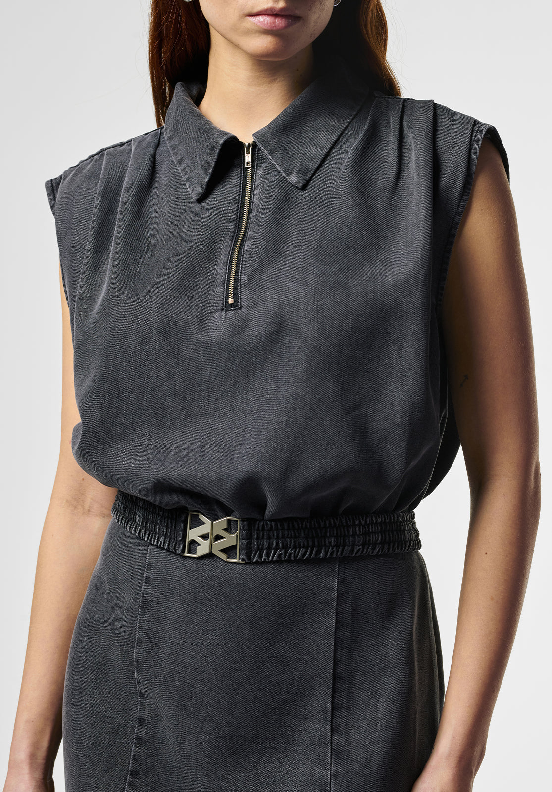 Deze jurk heeft een stoere en moderne uitstraling. Het denimlook materiaal in combinatie met de ritssluiting en de elastische tailleband met gespdetail zorgt voor een krachtige en vrouwelijke look.
