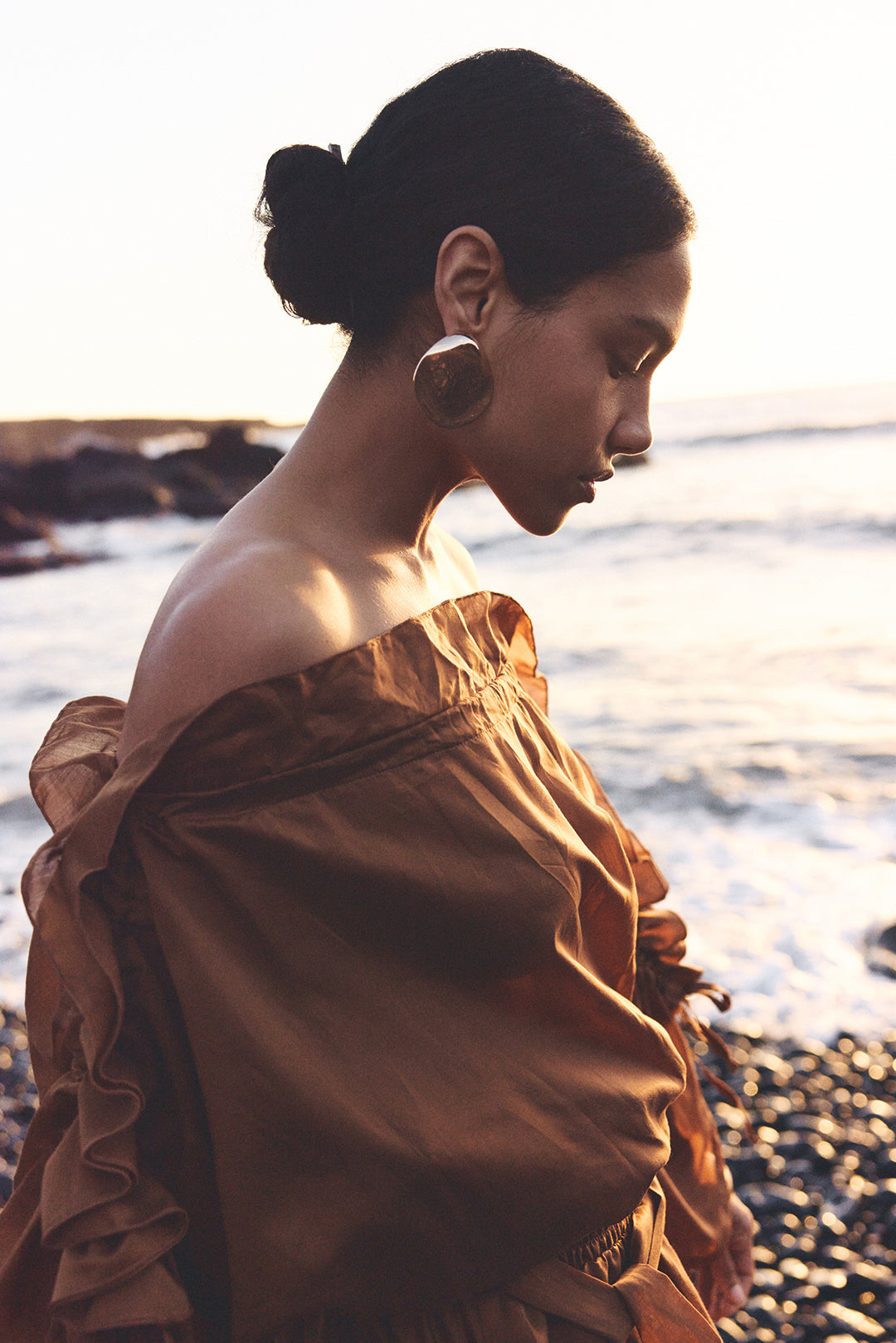 - Off-shoulder neckline with bow details