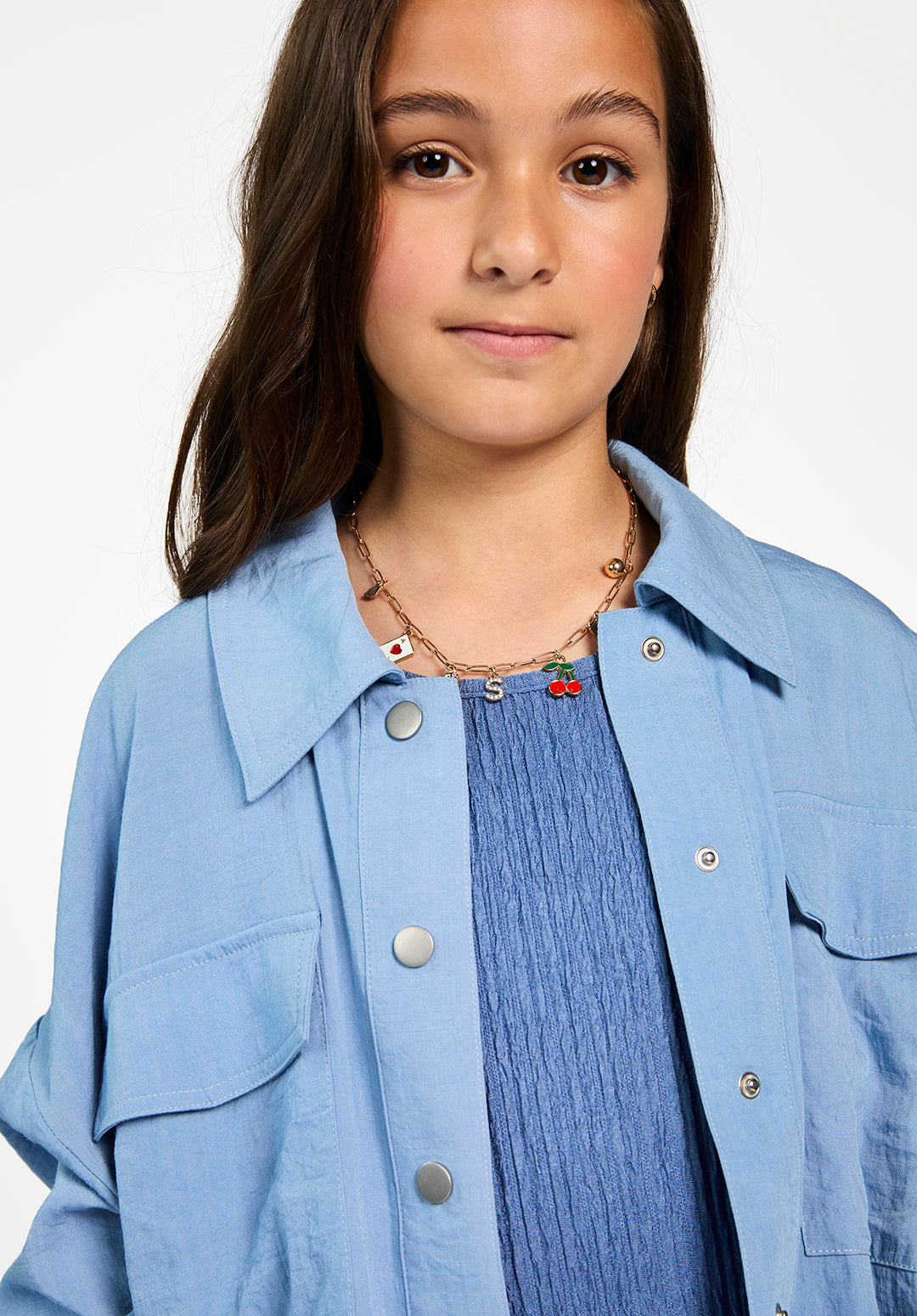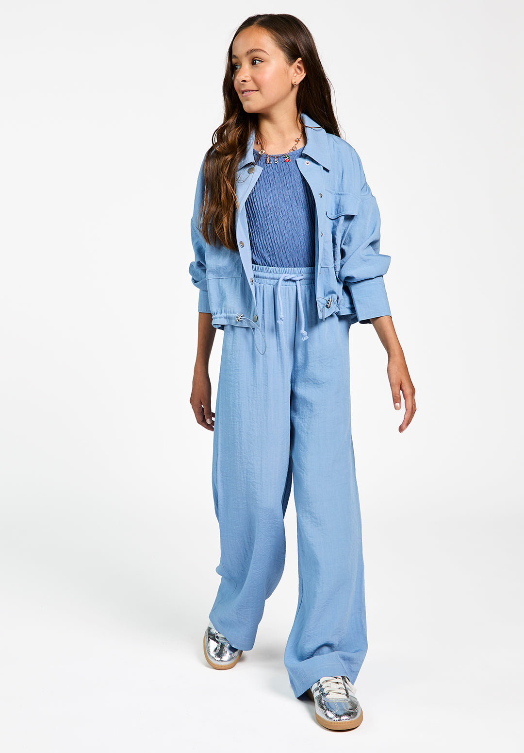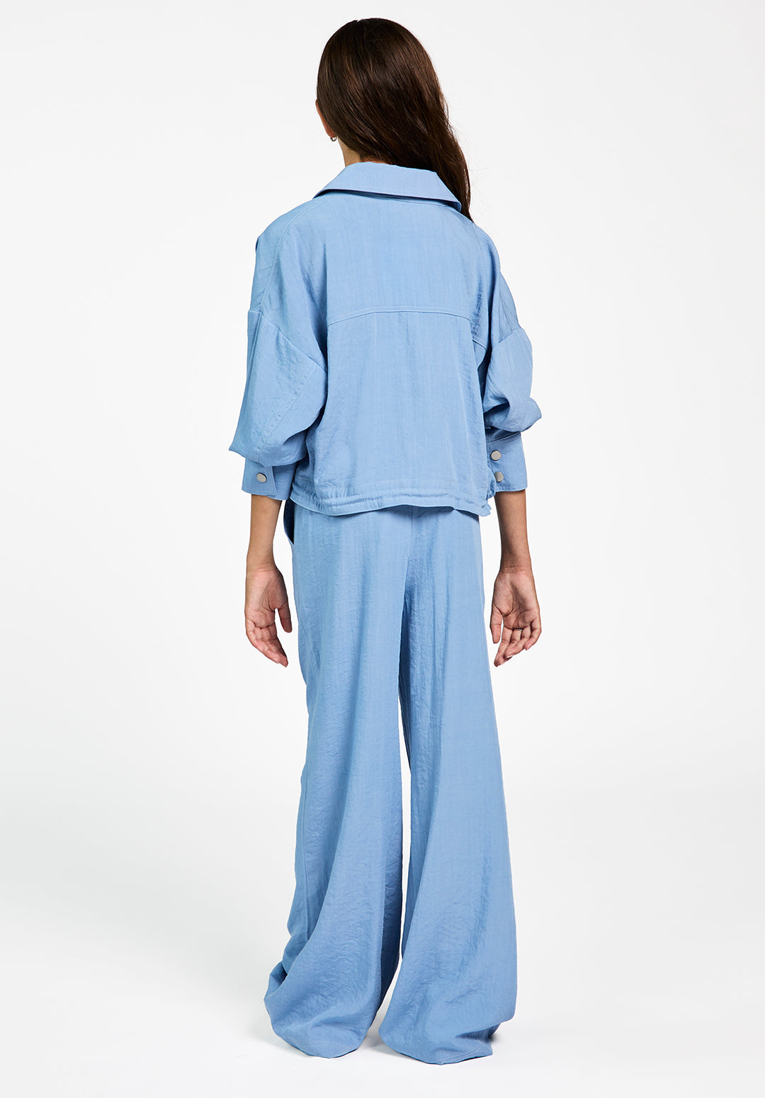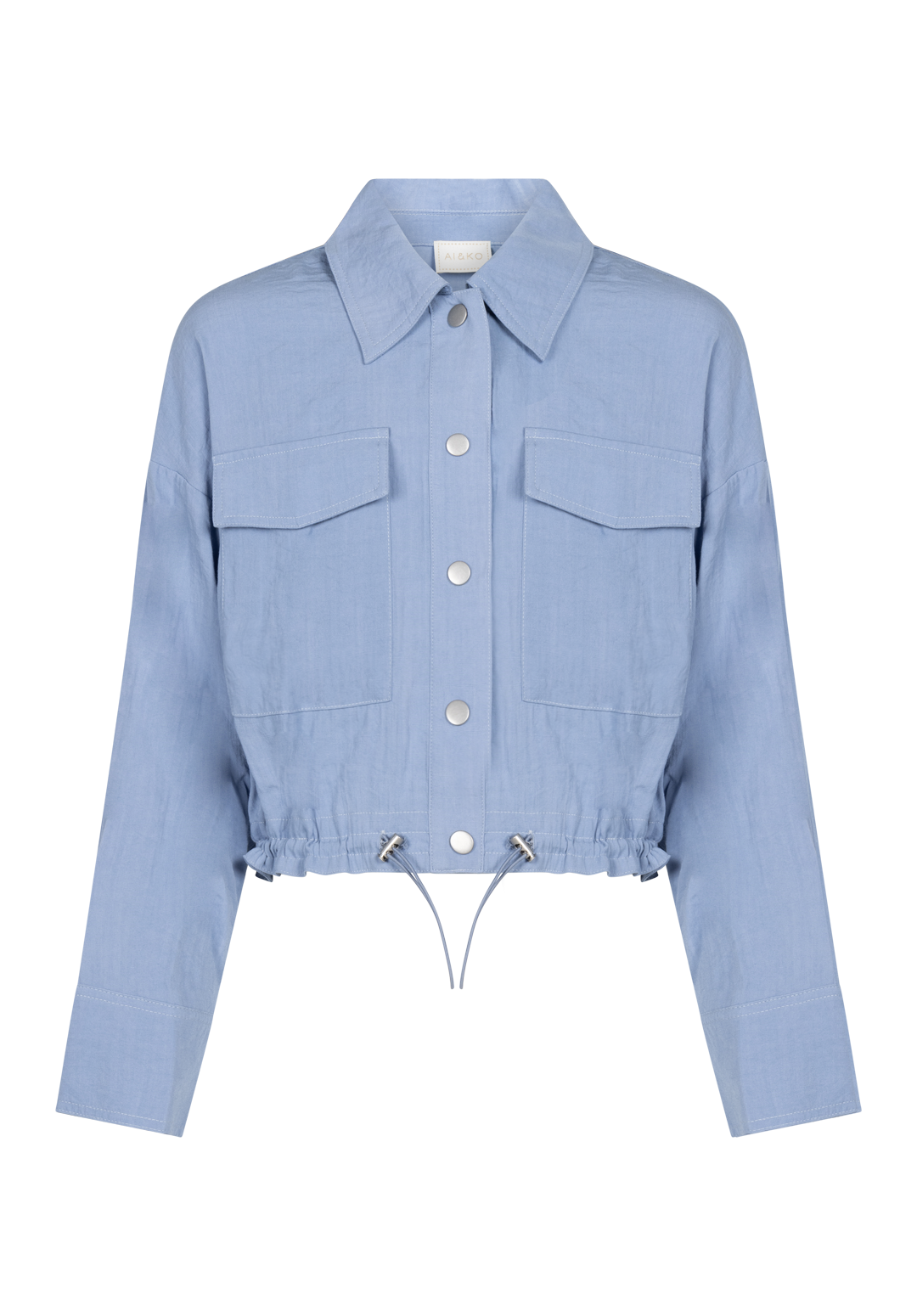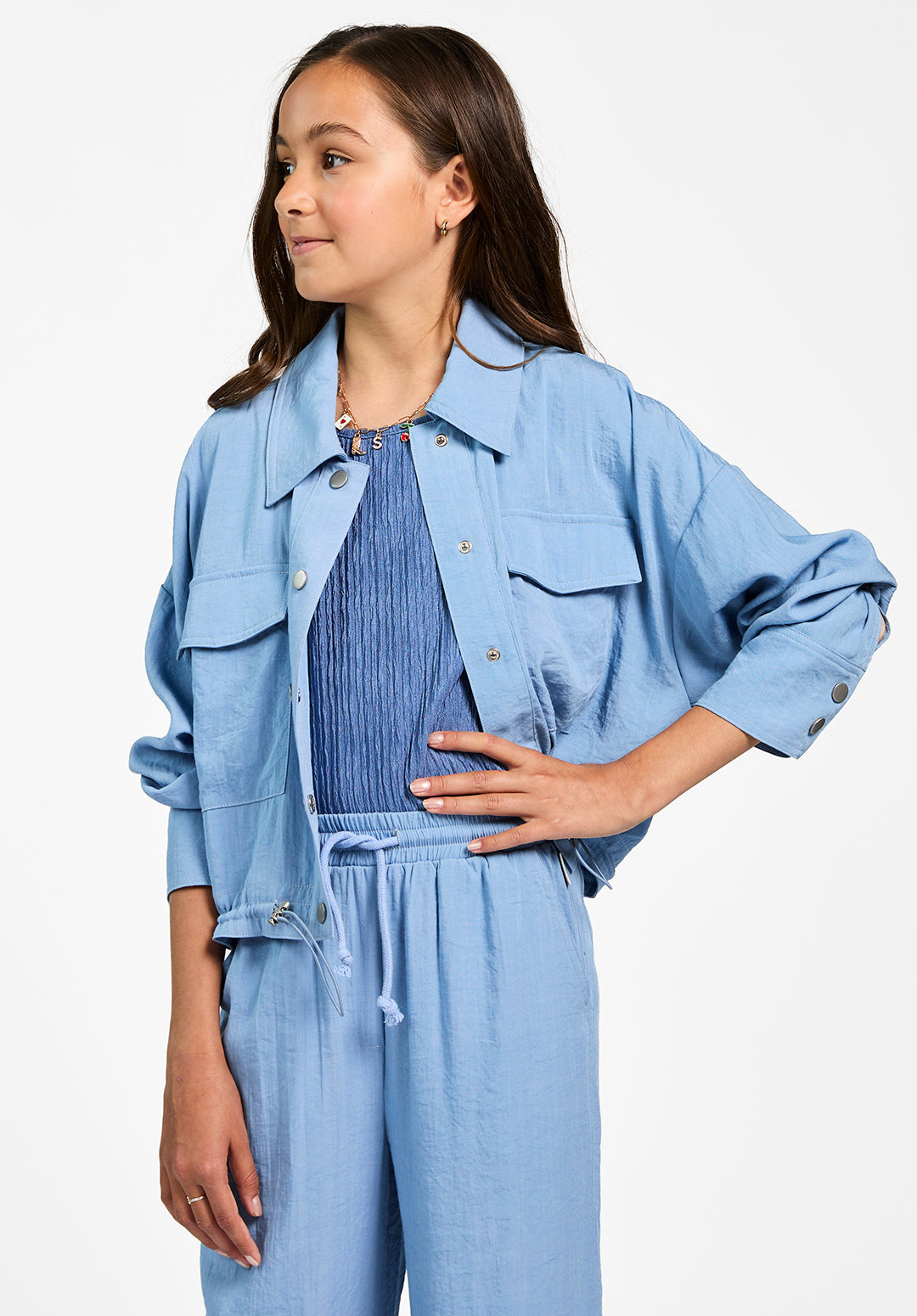 The Kamie jacket is a lightweight, airy design in a soft blue shade. The subtly textured fabric drapes smoothly, while the wide collar, chest flap pockets, and metal snap buttons give it a rugged edge. A drawstring at the hem allows you to adjust the fit for a more tailored look. Pair it with the Carly pants for a comfortable yet stylish ensemble.