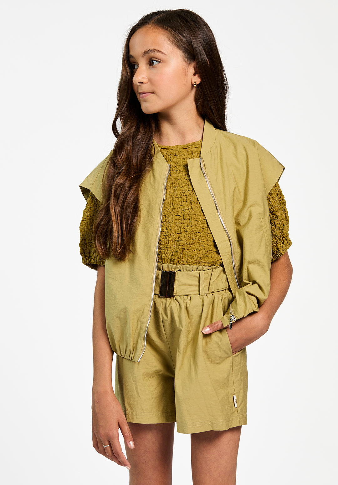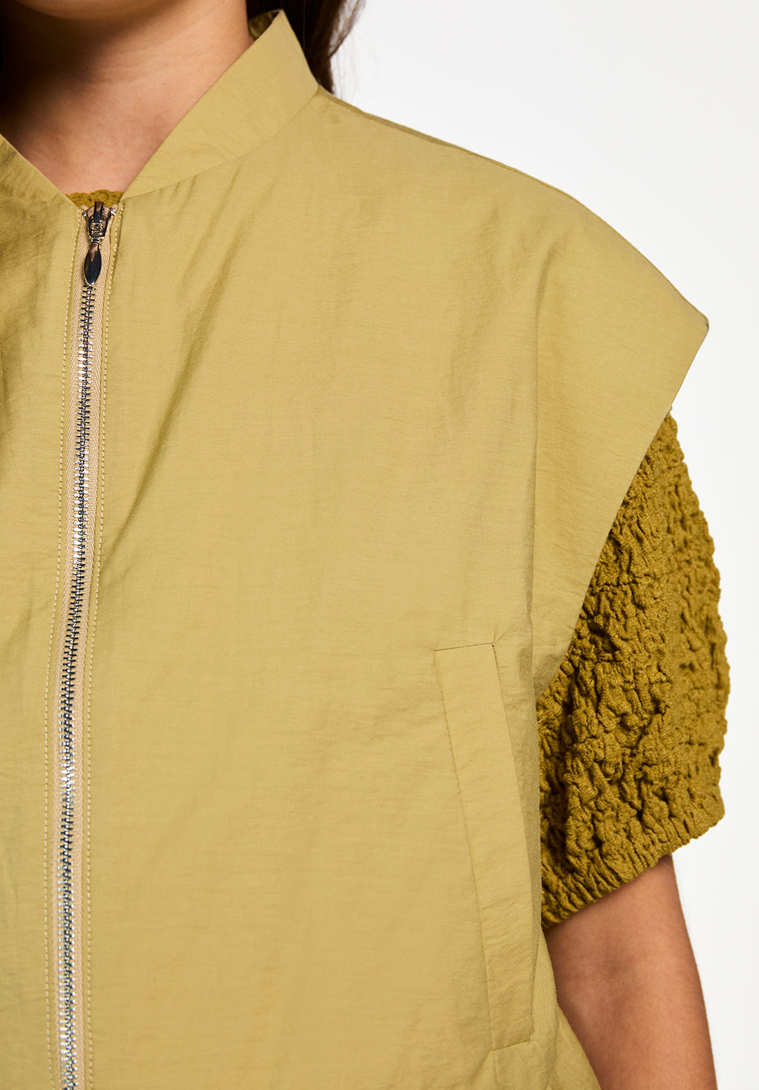 The Vanja gilet is a sleeveless jacket with a sporty edge. The stand-up collar, bold zip closure, and straight fit give it a cool, modern look. The lightweight fabric has a smooth finish, while the elasticated hem allows you to wear it slightly flared. Pair it with the Rikki shorts for a playful, coordinated outfit.
