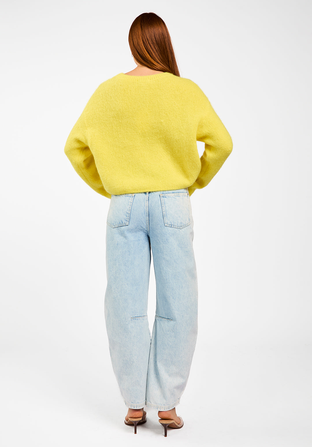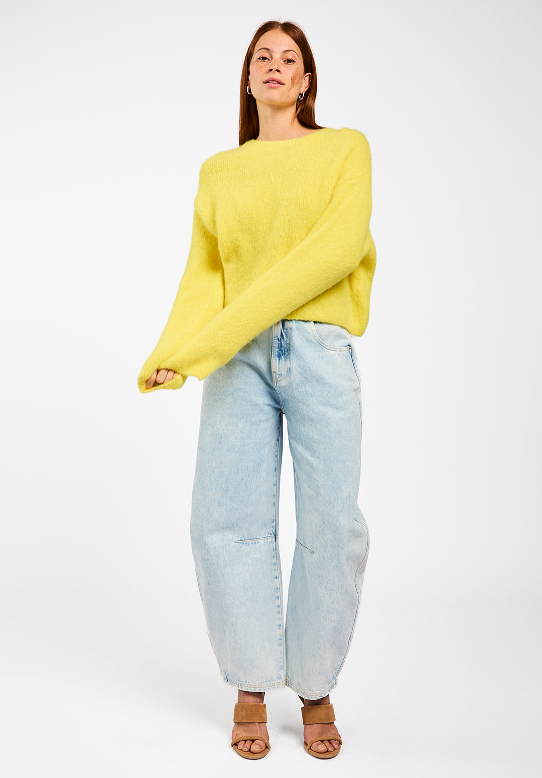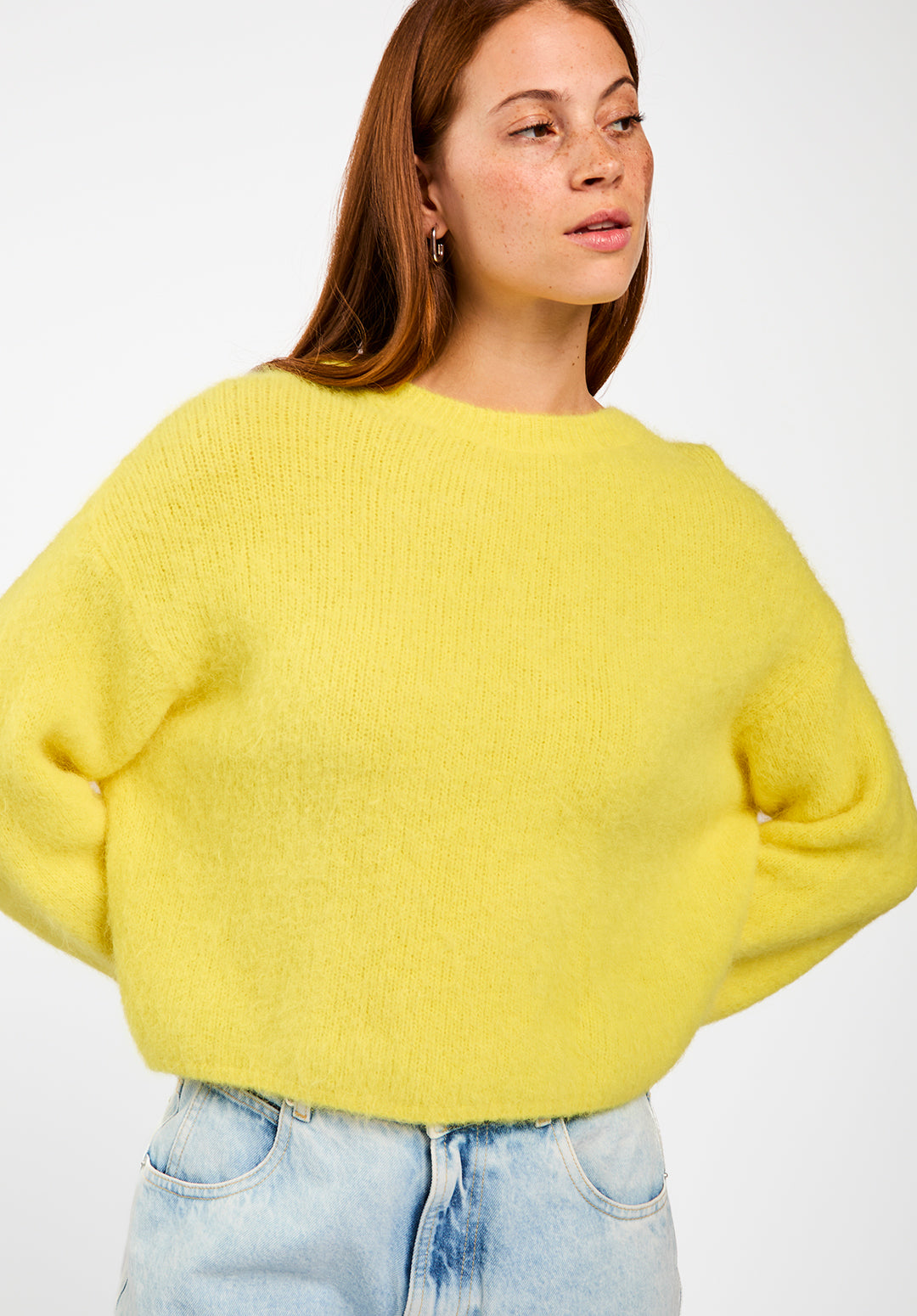 The Feline sweater is a soft, airy knit crafted from an alpaca wool blend. Designed with a straight, slightly cropped fit, it features dropped shoulders for a relaxed, modern look. The woolly texture feels warm and comfortable against the skin, making it perfect for cooler days. Style it with the Sacha trousers for an effortless outfit.