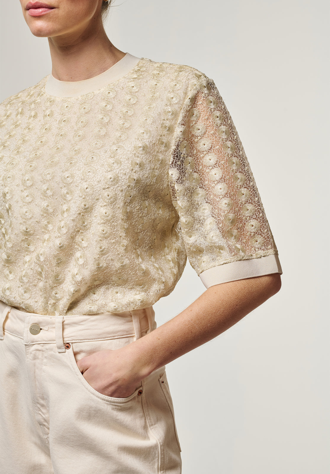 The Julice top is a feminine piece with a subtle look. The jacquard fabric has a subtle sheen and a delicate pattern. The fit is straight and comfortable, with short sleeves and a round neckline. The contrasting cuffs provide a neat finish. A stylish piece that's easy to style.