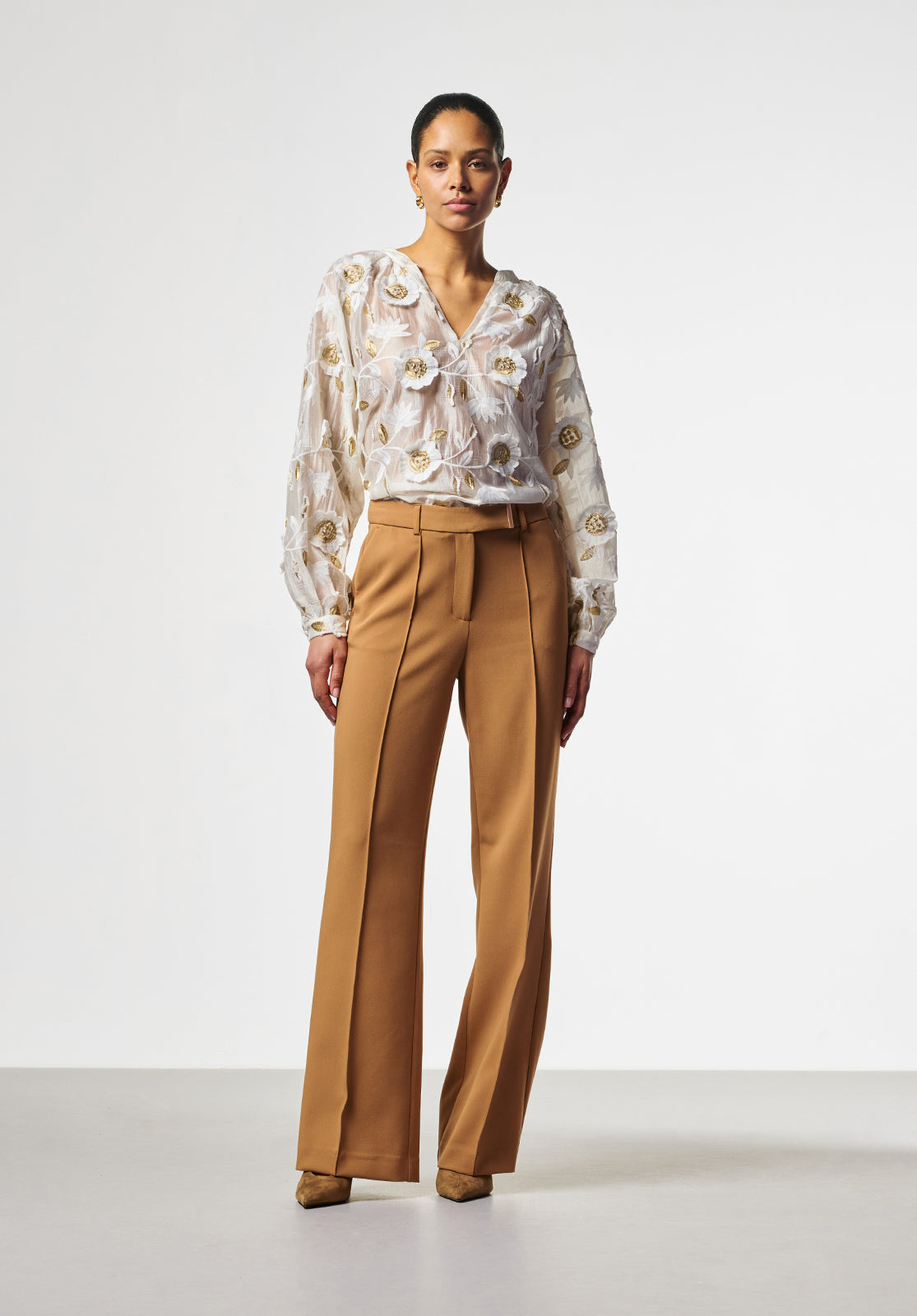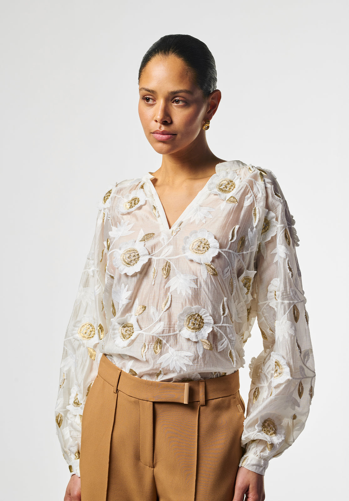 This Alanza blouse is an airy blouse with a sheer look and subtle volume in the sleeves. It features white and gold floral embroidery and a straight fit. The blouse closes with a small button at the back and is lined for extra comfort.
