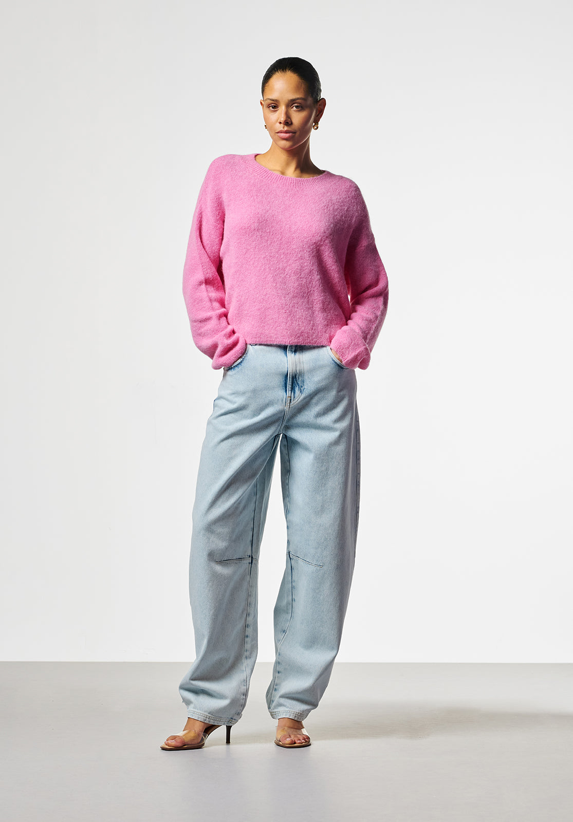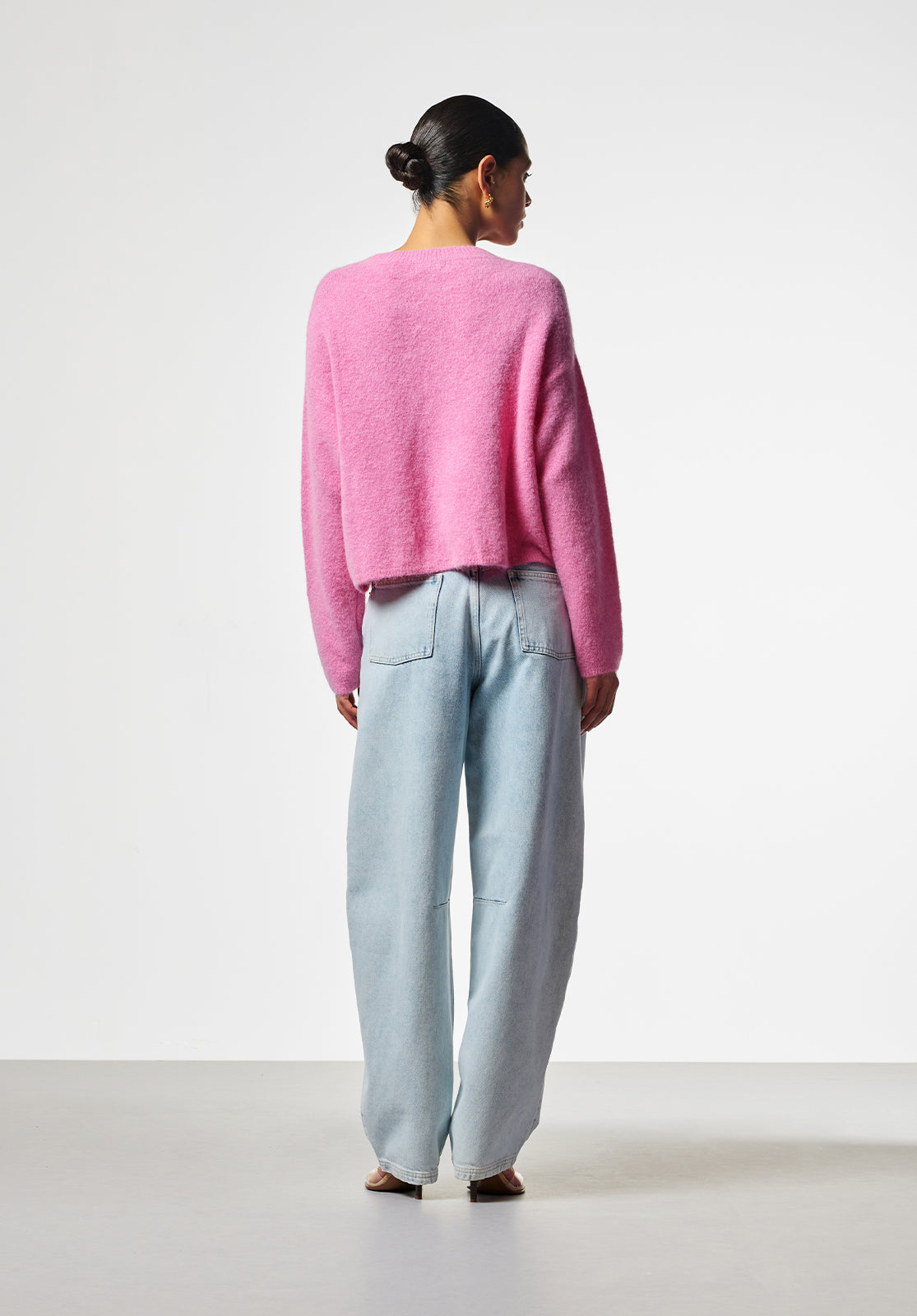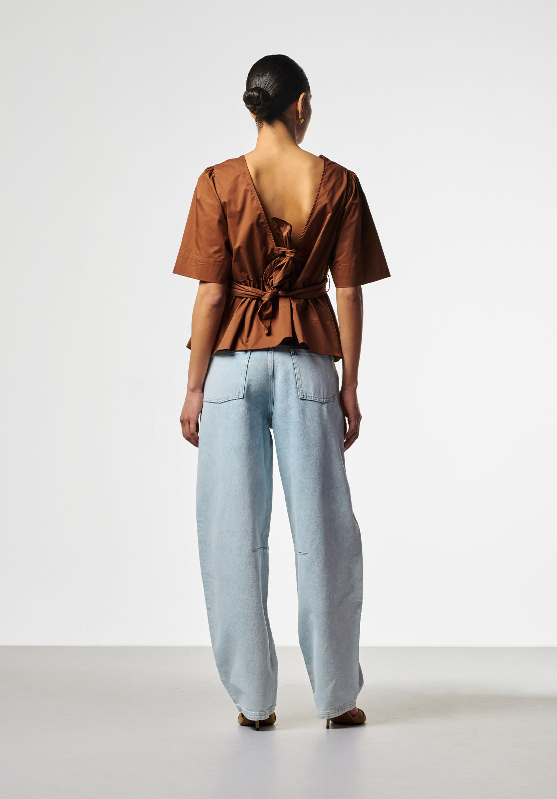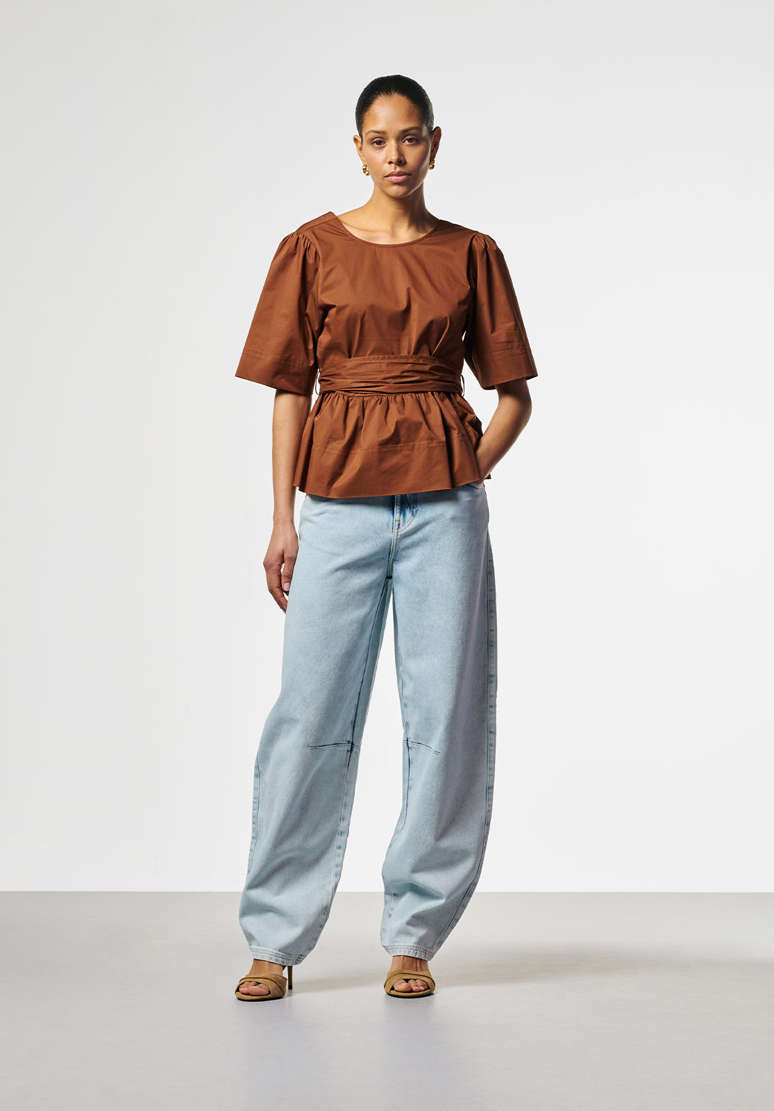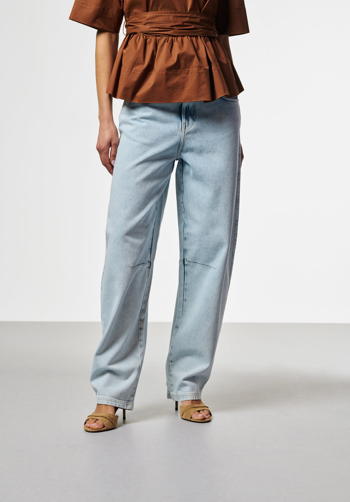 The Sacha is a modern barrel jean designed with a high waist and a relaxed, structured fit. It’s wide through the thigh and tapers gently at the ankle, creating a bold yet wearable silhouette. Made from lightly washed denim with a soft hand feel, it features classic side and back pockets and a leather logo patch on the waistband for a clean finish.