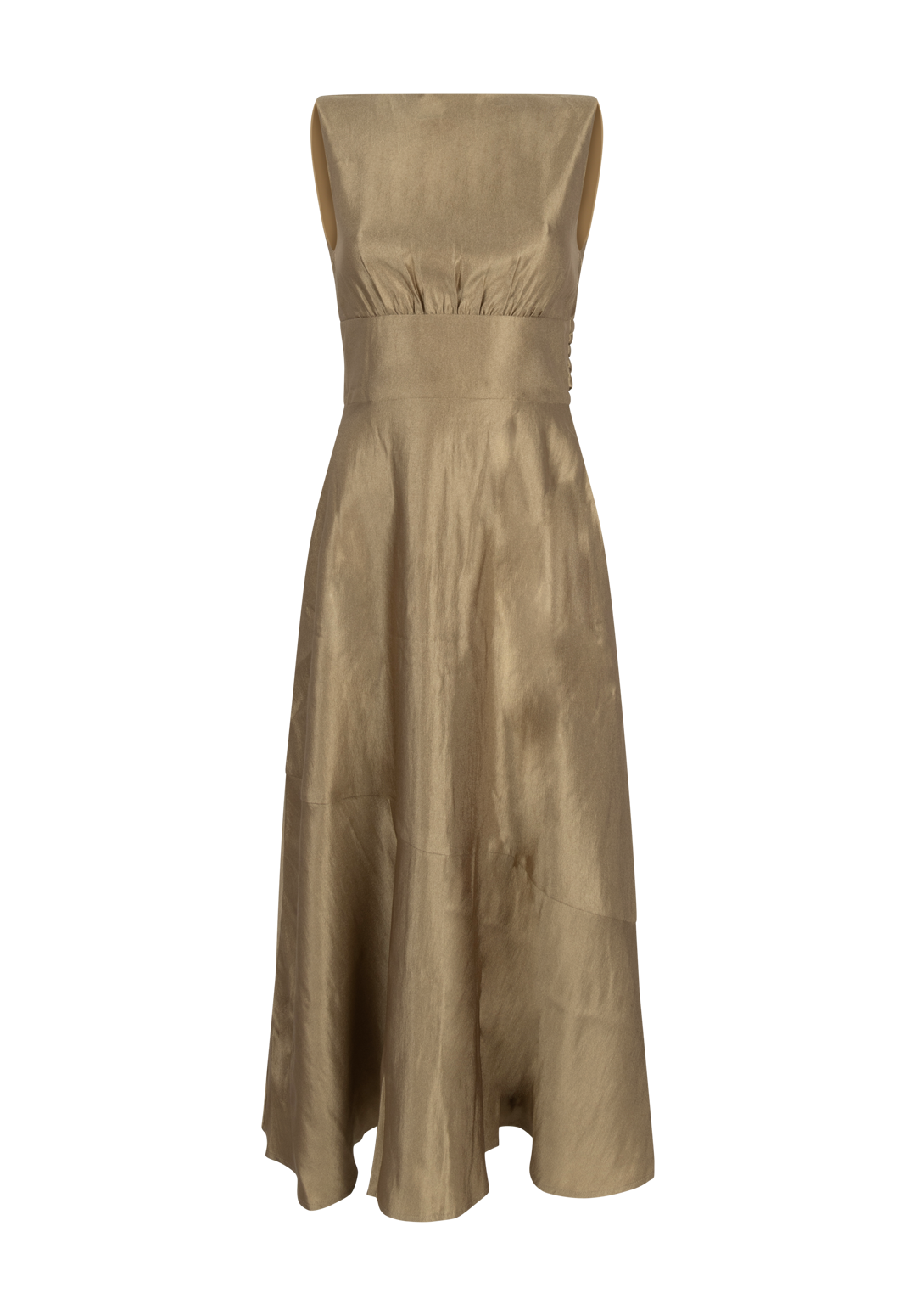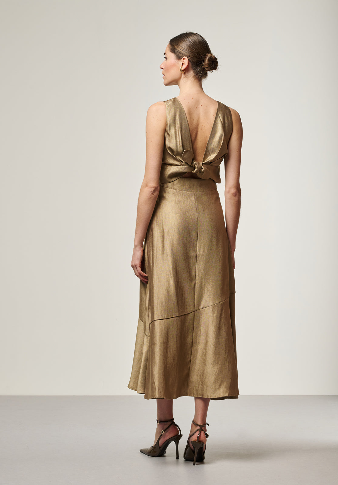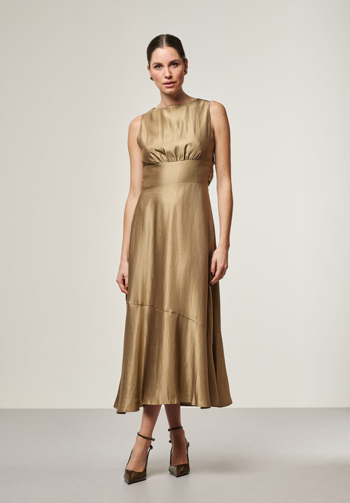 The Michelle Dress is a feminine midi style with a playful open-back detail. Crafted from softly shimmering fabric, it drapes beautifully and highlights the waist with its flattering, fitted silhouette. The button closure at the back adds an unexpected yet refined touch. Perfect for dinner parties or warm-weather occasions.