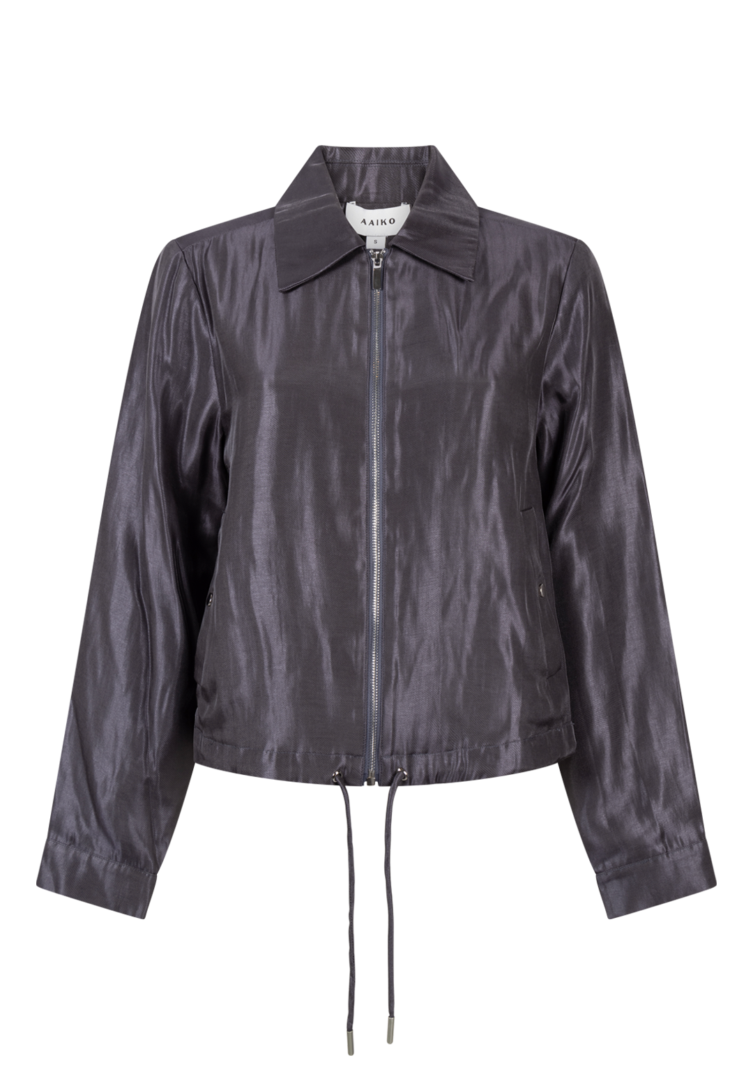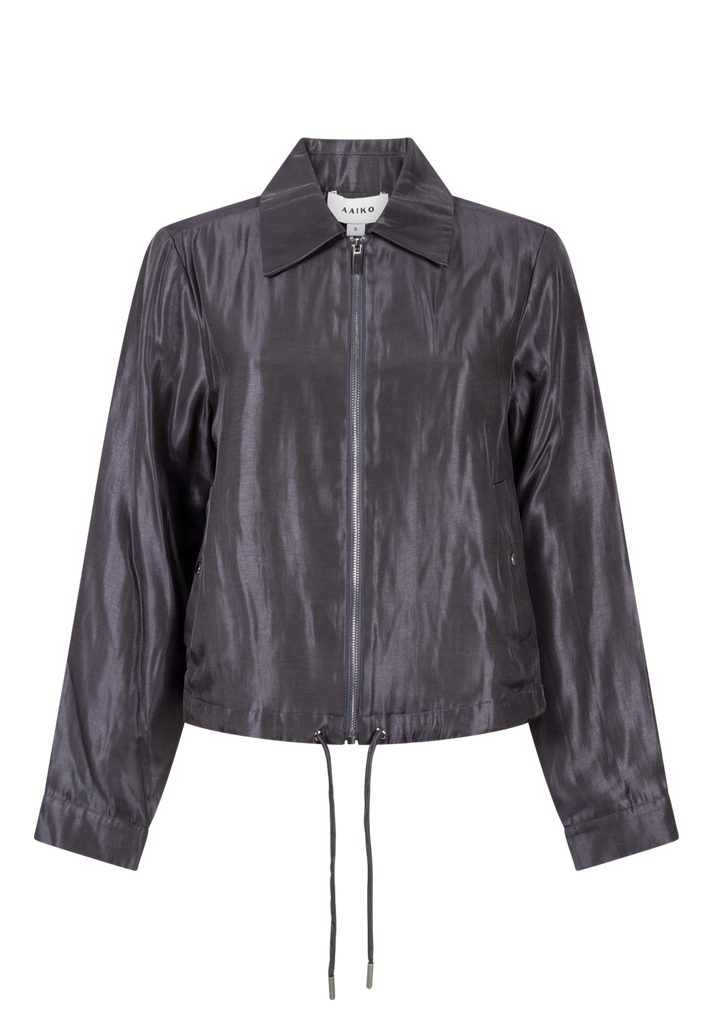 The Ravi jacket is made from a shiny, lightweight fabric with a subtle metallic sheen. Its straight fit and adjustable drawstring hem allow for versatile styling—wear it relaxed or cinched for a more tailored look. Complete the outfit by pairing it with the Varyas skirt.