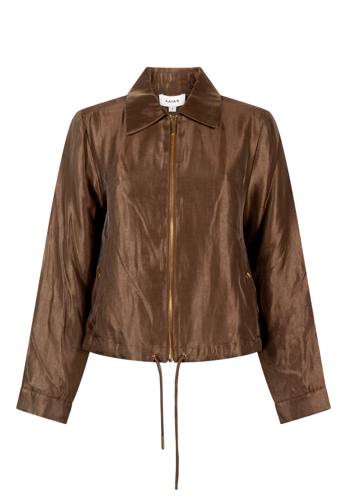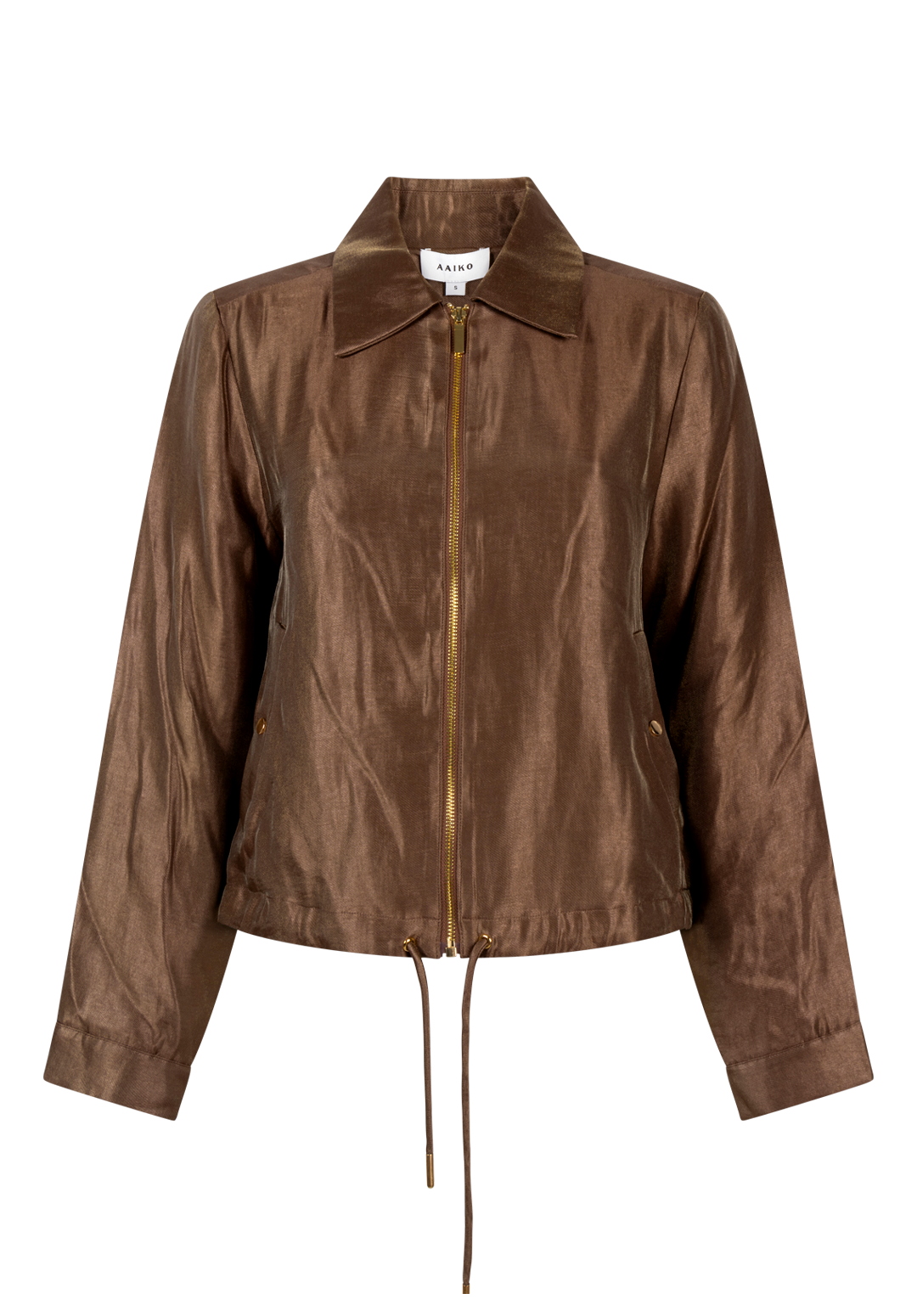The Ravi Jacket is made from a shiny, lightweight fabric with a subtle metallic sheen. Designed in a straight fit, it features a silver zipper, oversized collar, and a drawstring hem that lets you adjust the shape from relaxed to more fitted. Style it with the Varyas skirt for a coordinated look.
