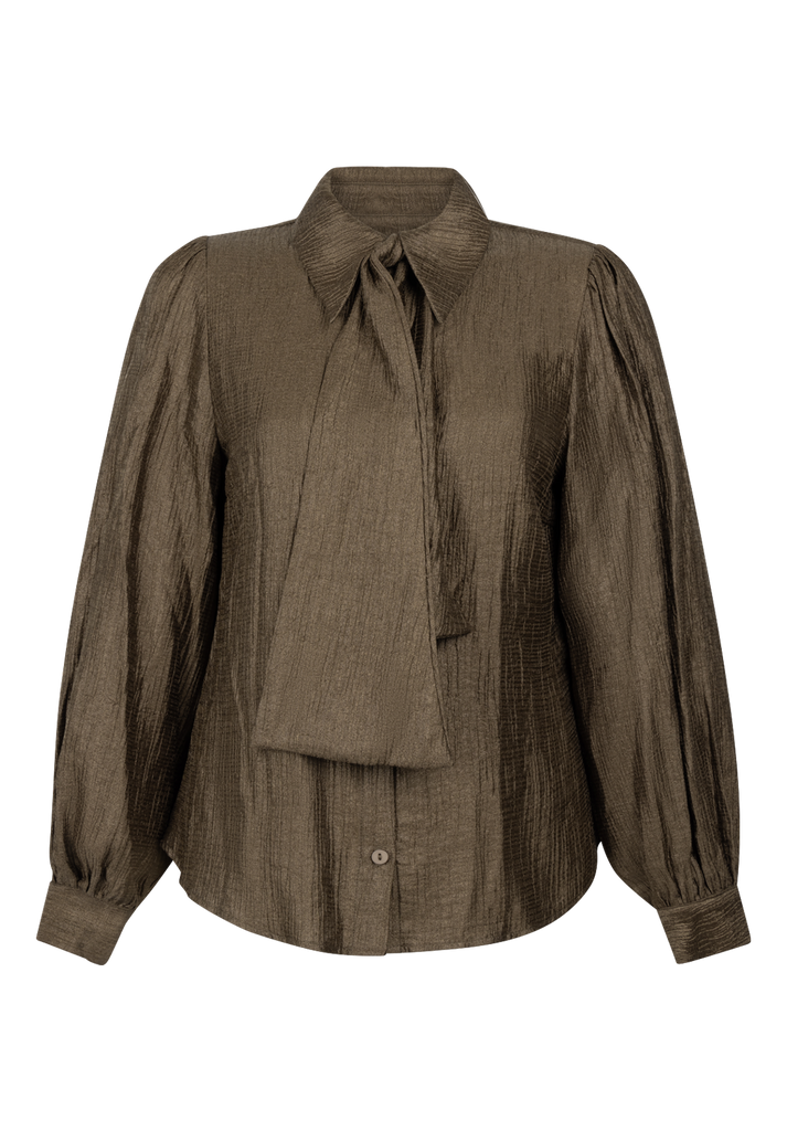 The Veronne Blouse is a timeless, feminine piece with elegant detailing. Designed with a flowing silhouette and subtle balloon sleeves, it features a chic scarf at the neck that can be tied in a relaxed bow or styled for a more classic look. Crafted from a softly shimmering fabric, this blouse pairs beautifully with tailored trousers and loafers for a sophisticated everyday outfit.