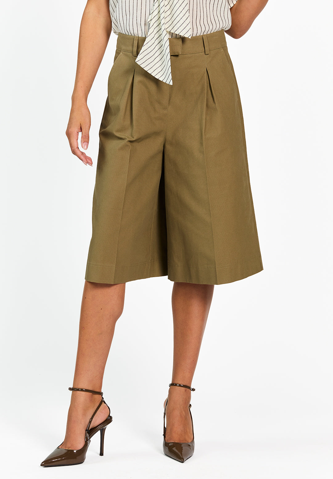 Bermuda shorts, but with a modern edge. The Inaya Bermuda features a high waist, wide legs, and sharp pleats for a structured look with a casual twist. Made of sturdy cotton with a light stretch, ensuring comfort and shape retention. Pair with a blouse or knit for a bold urban look.